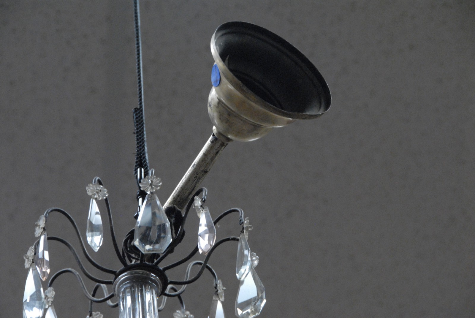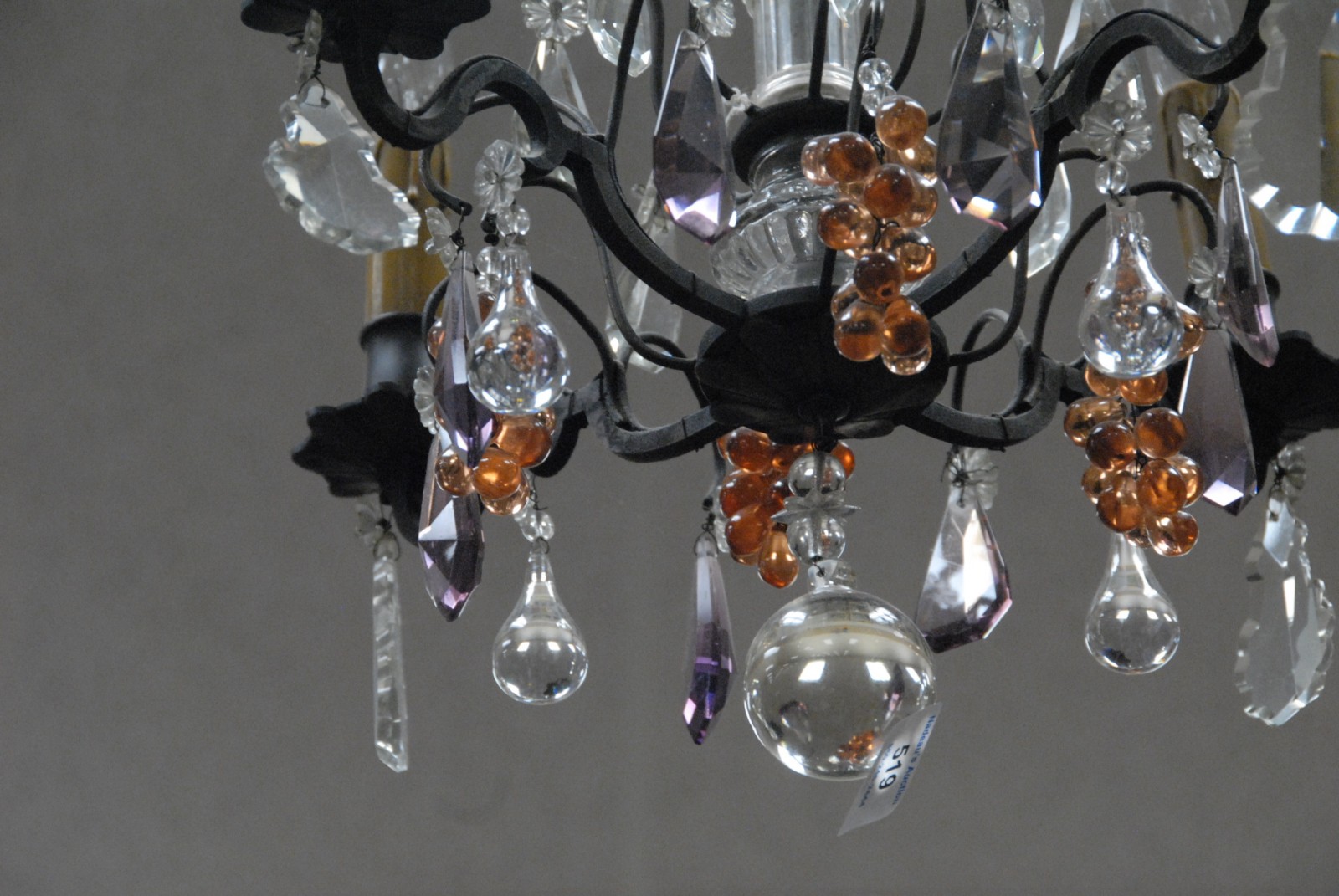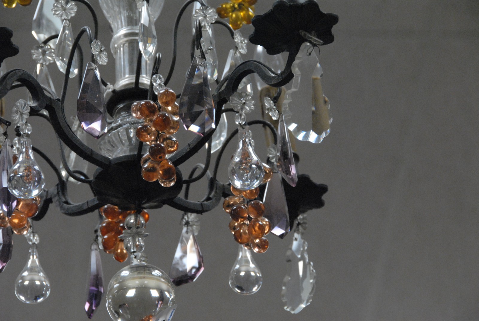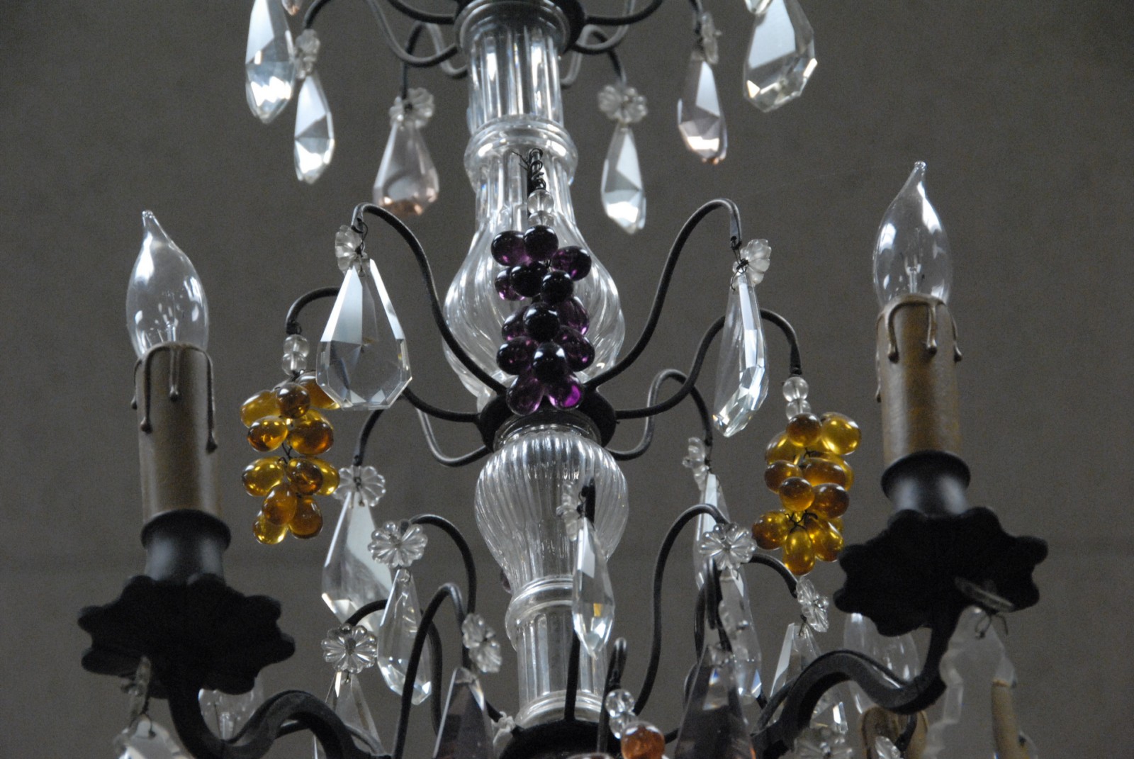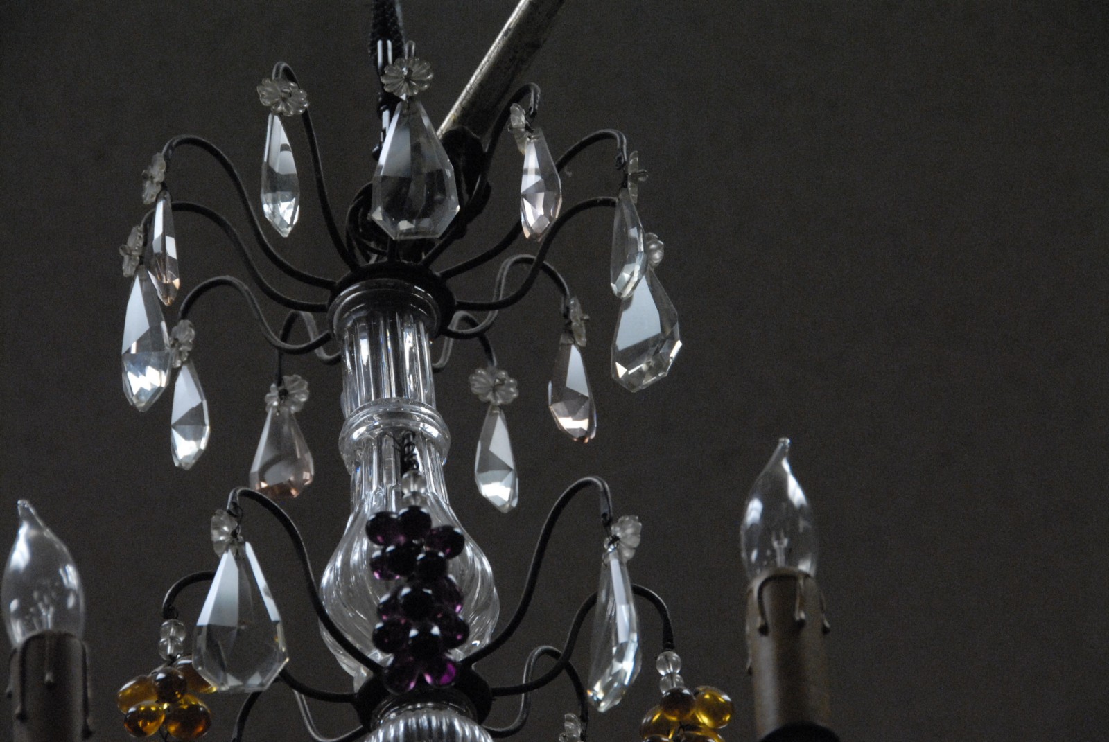 Four light chandelier with amber, amethyst and pink grapes with crystal prisms.
