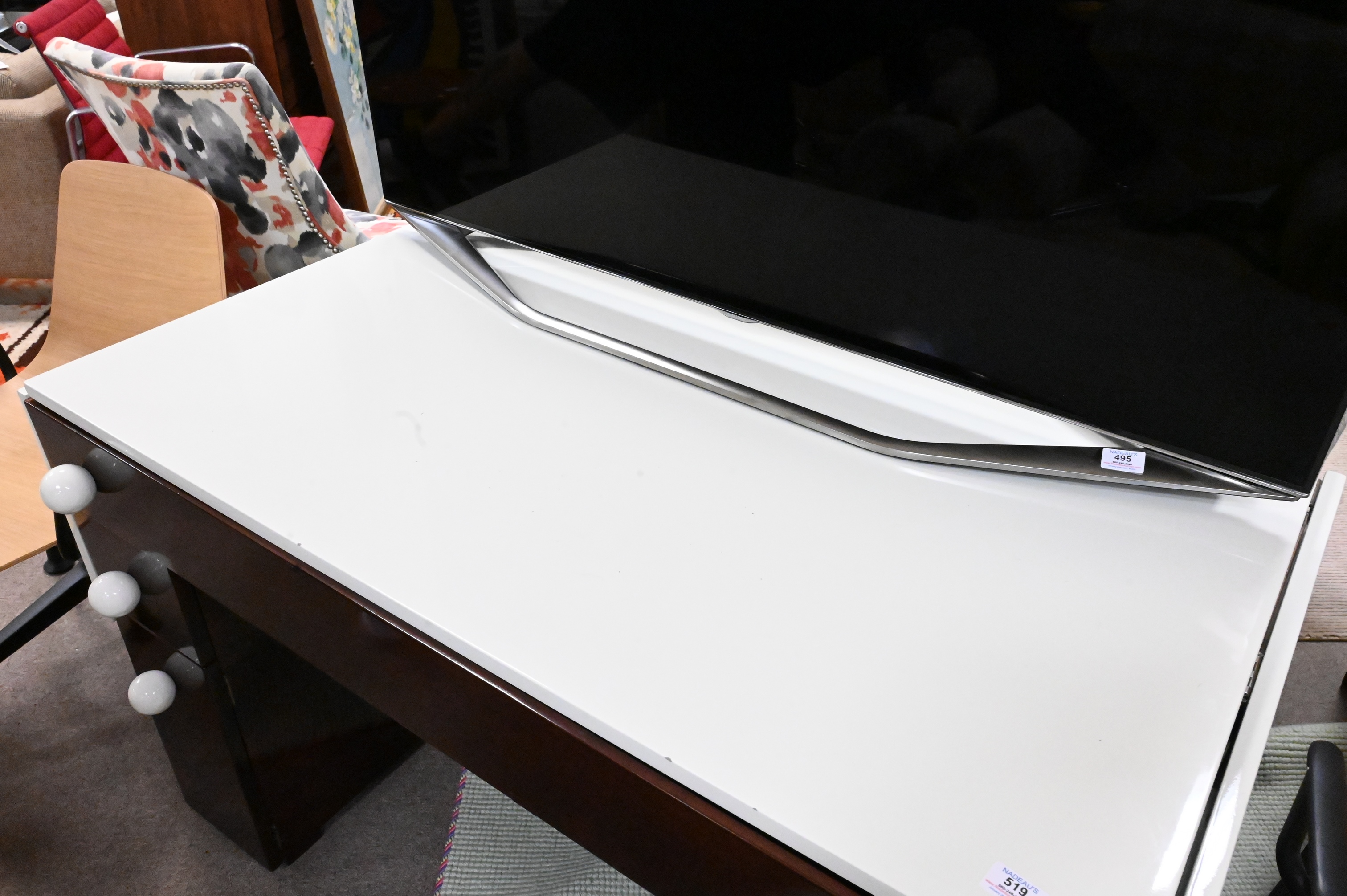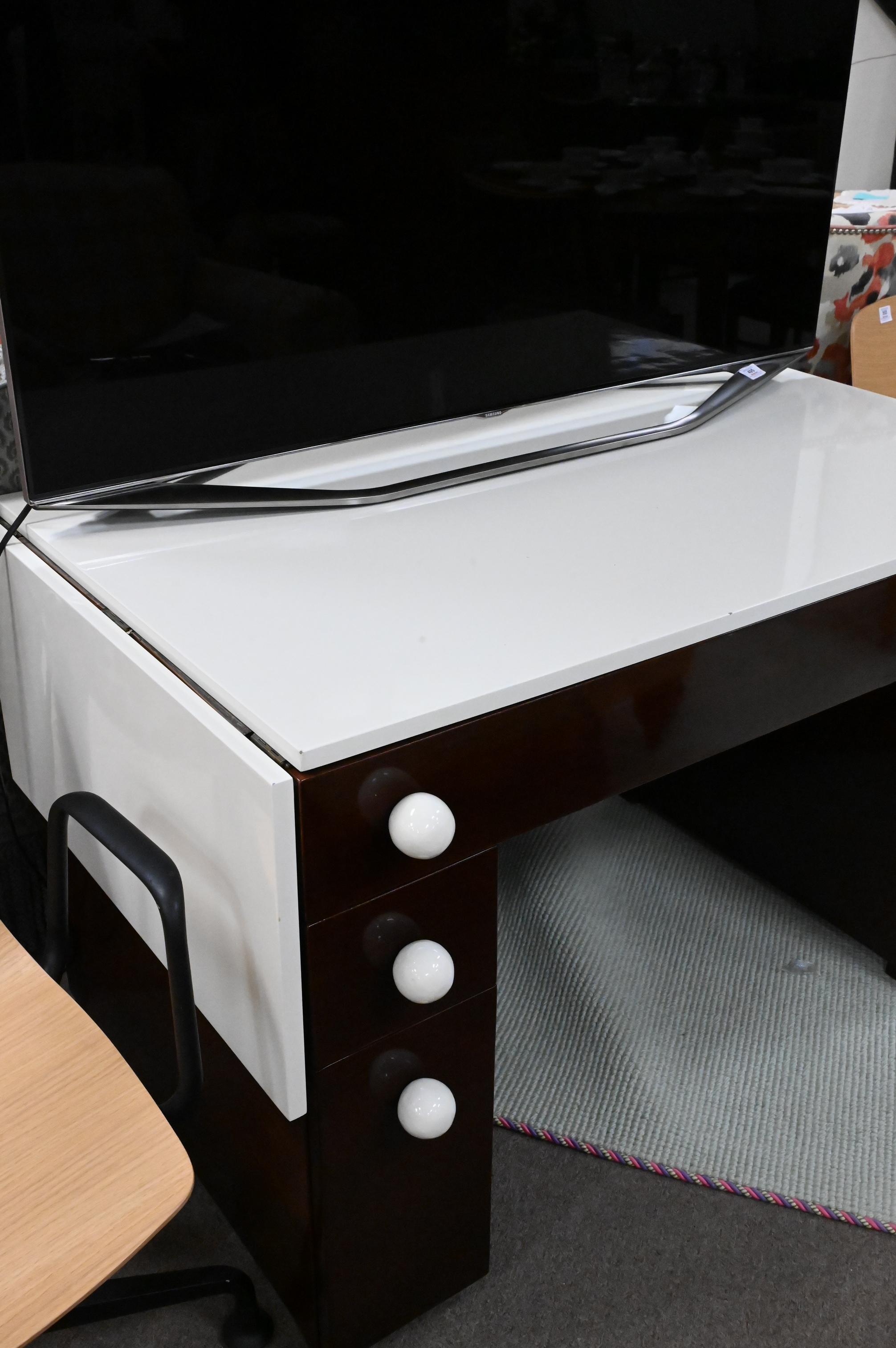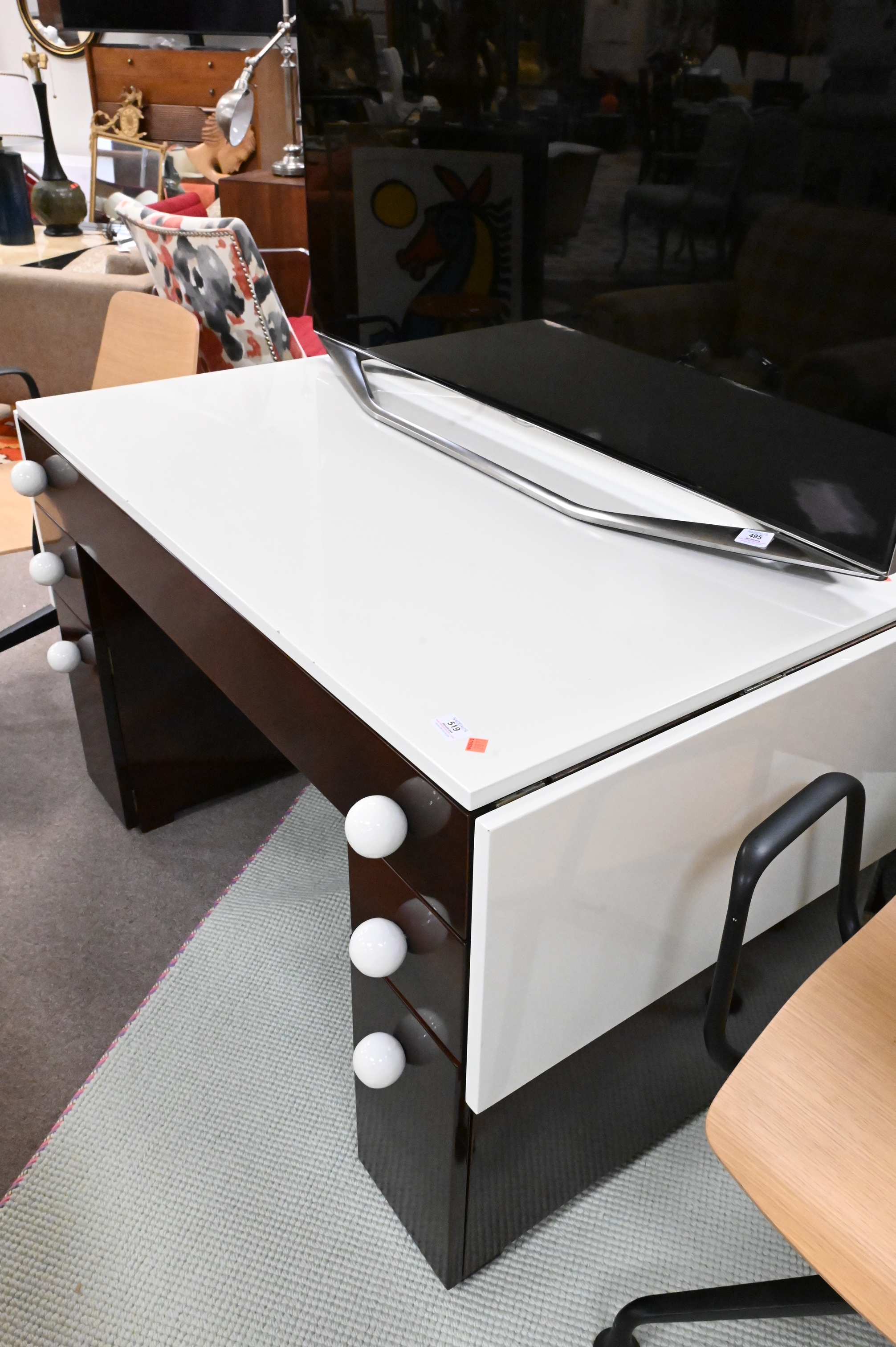 Mid Century Modern Lacquered Desk, having drop leaf ends along with one long drawer over four short drawers, height 30 1/2 inches, top 29″ x 48″. Provenance: Collection from Greenwich Connecticut