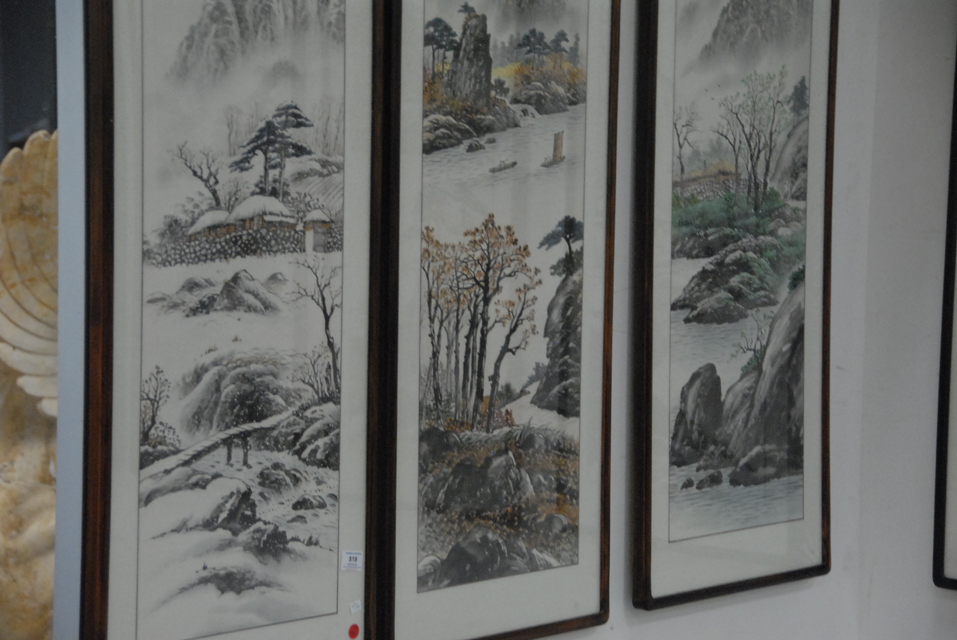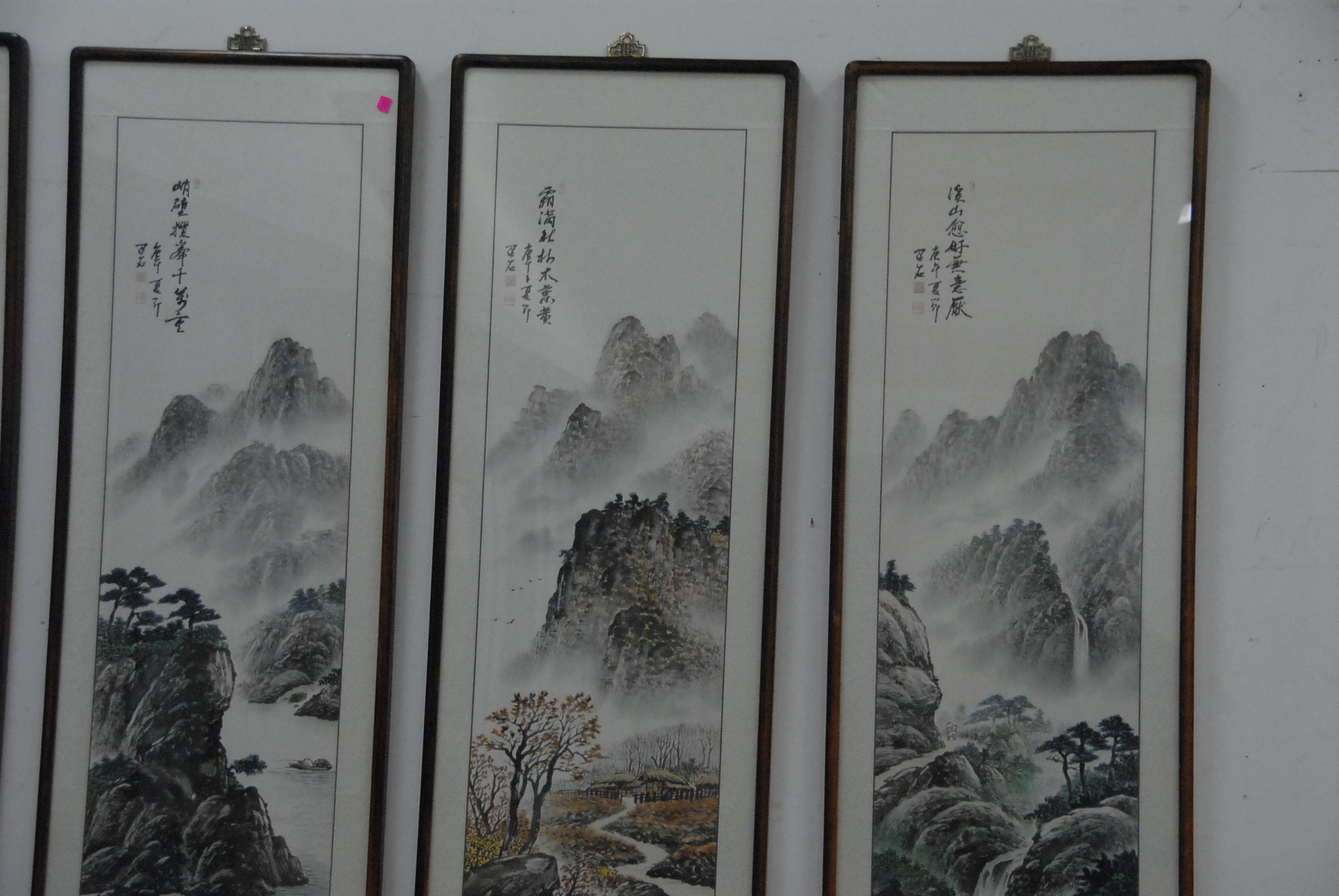 Lot 519: Set of eight landscape paintings, water color on paper depicting mountainous landscapes in winter and summer, signed and seal mark. 18 1/2 x 57