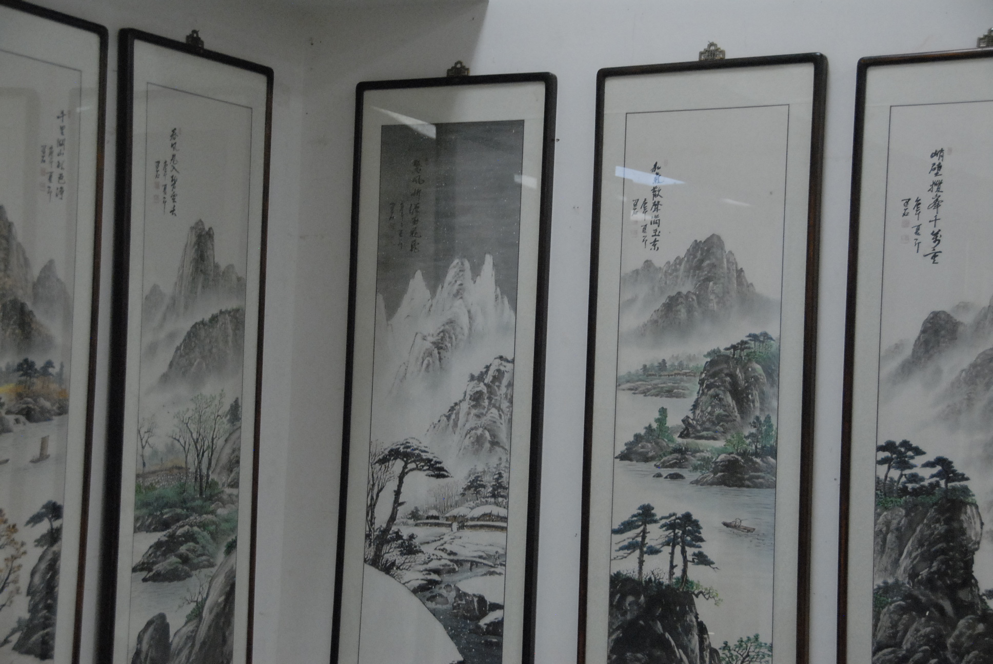 Set of eight landscape paintings, water color on paper depicting mountainous landscapes in winter and summer, signed and seal mark. 18 1/2 x 57