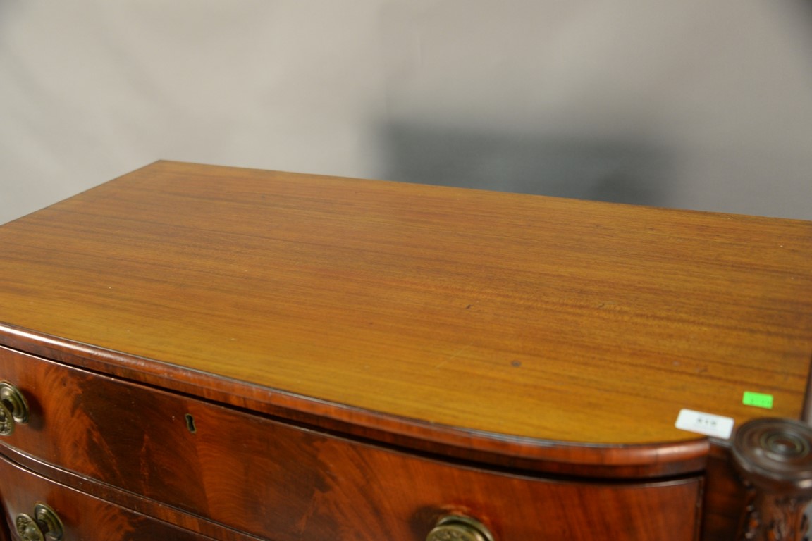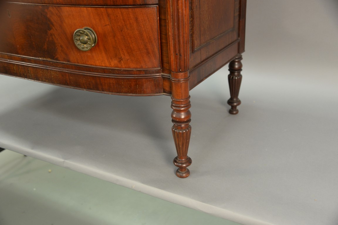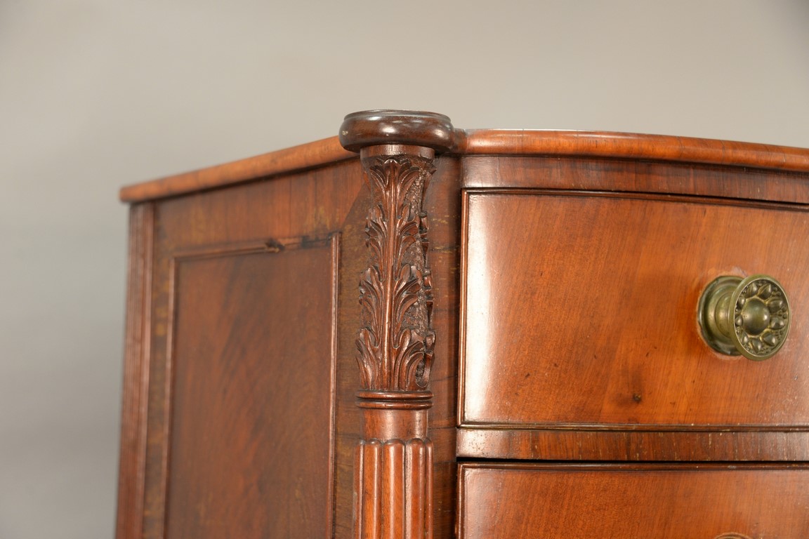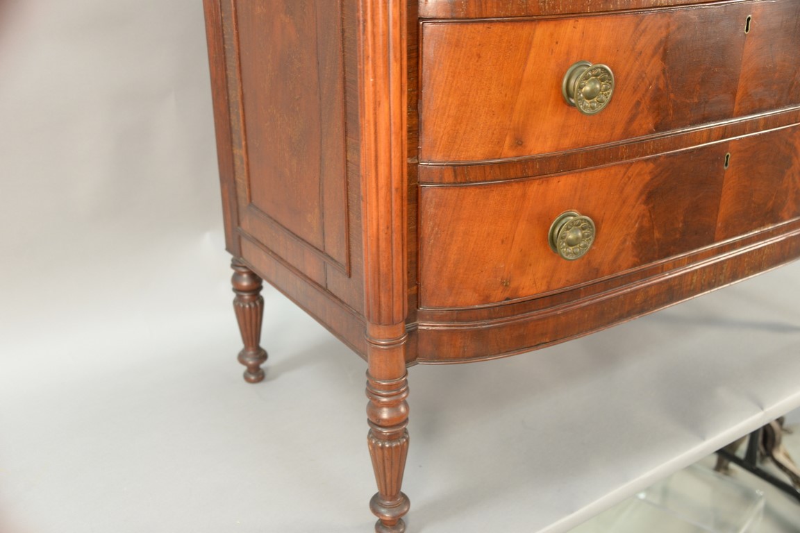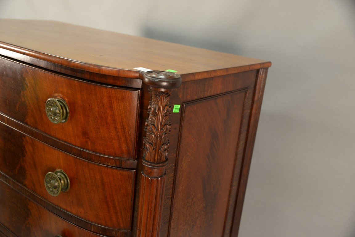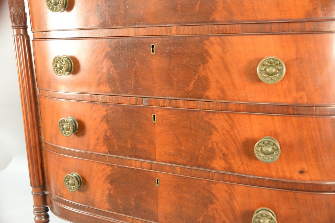 Lot 519: Sheraton mahogany bowfront chest with cookie corners having carved and fluted columns on turned and fluted legs, probably North Shor…
