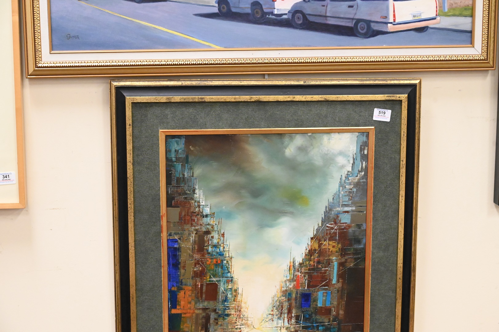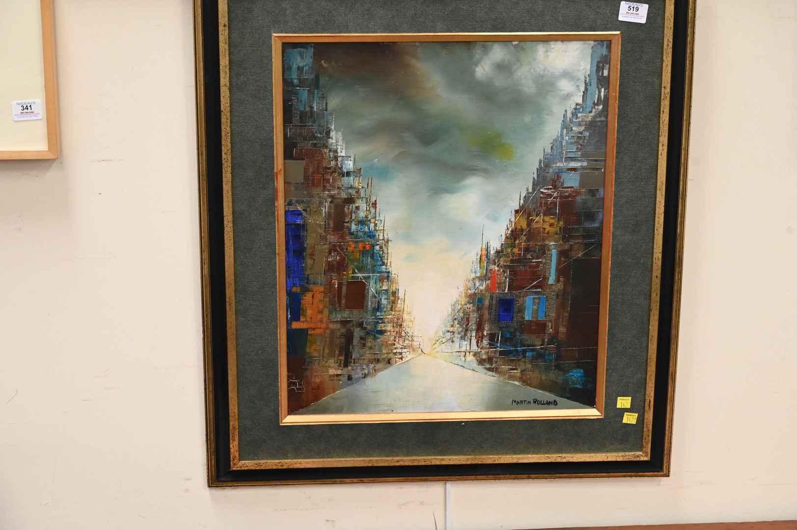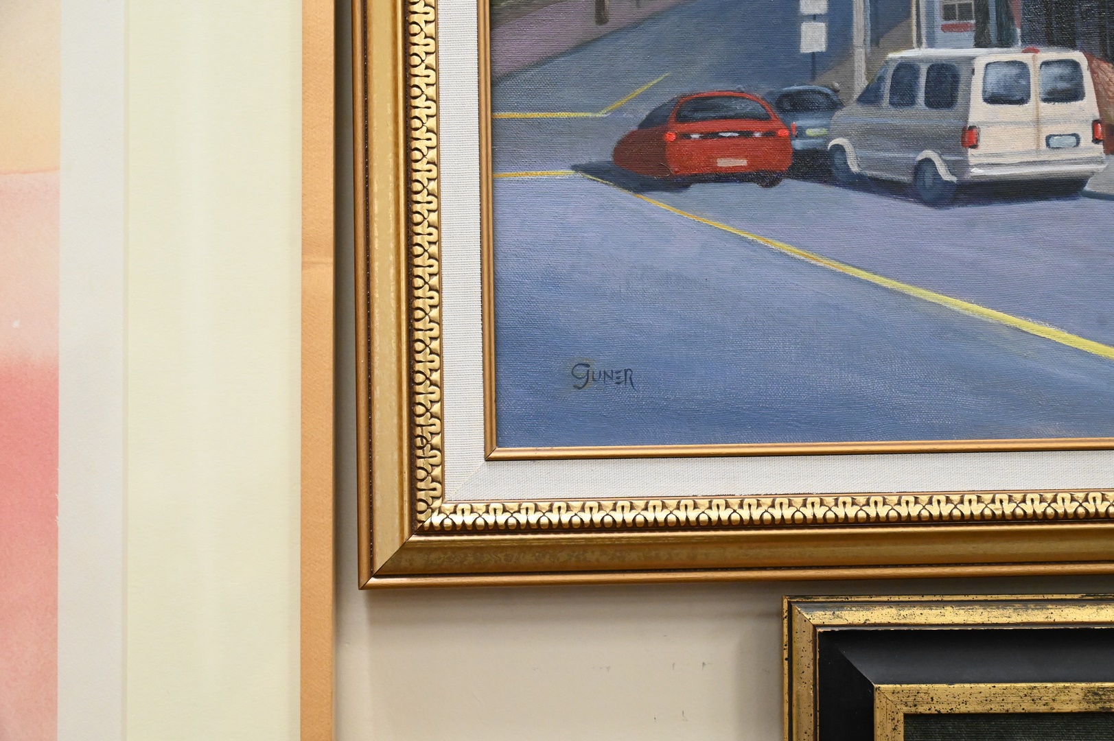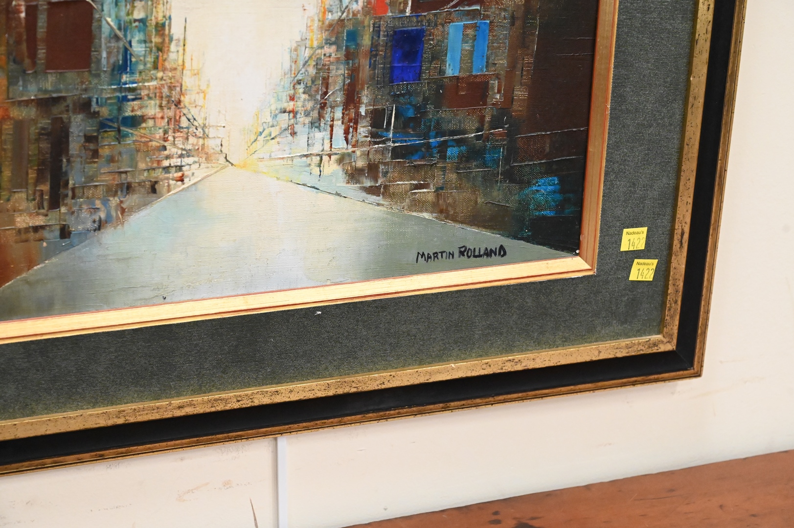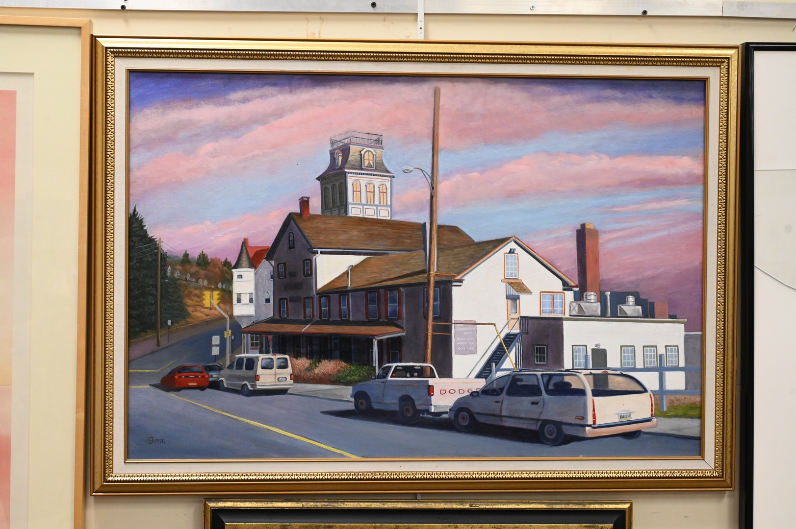 Two Framed Paintings, to include Jim Gunning, The Washington House, Sellersville, PA”, 2002, oil on canvas; along with Martin Rolland, abstract cityscape, oil on canvas, 23 1/2″ x 35″ and 20 1/2″ x 17 1/4″.