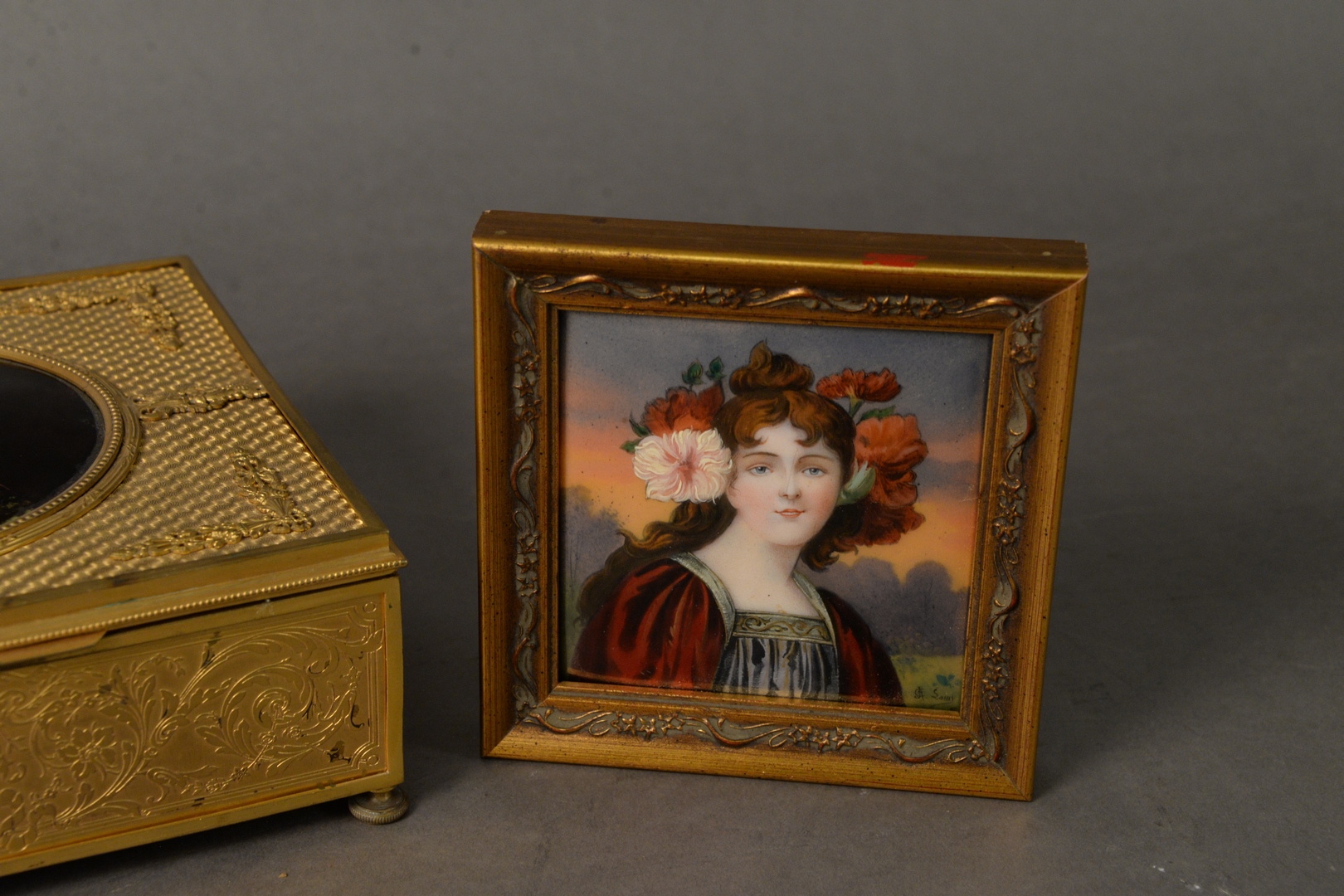 Two Piece Lot to include a French gilt bronze box having mounted and painted porcelain plaque of a woman along with a framed, painted porcelain plaque depicting a woman with flowers in her hair, box height 2 1/2 inches, width 9 inches, depth 7 inches.
