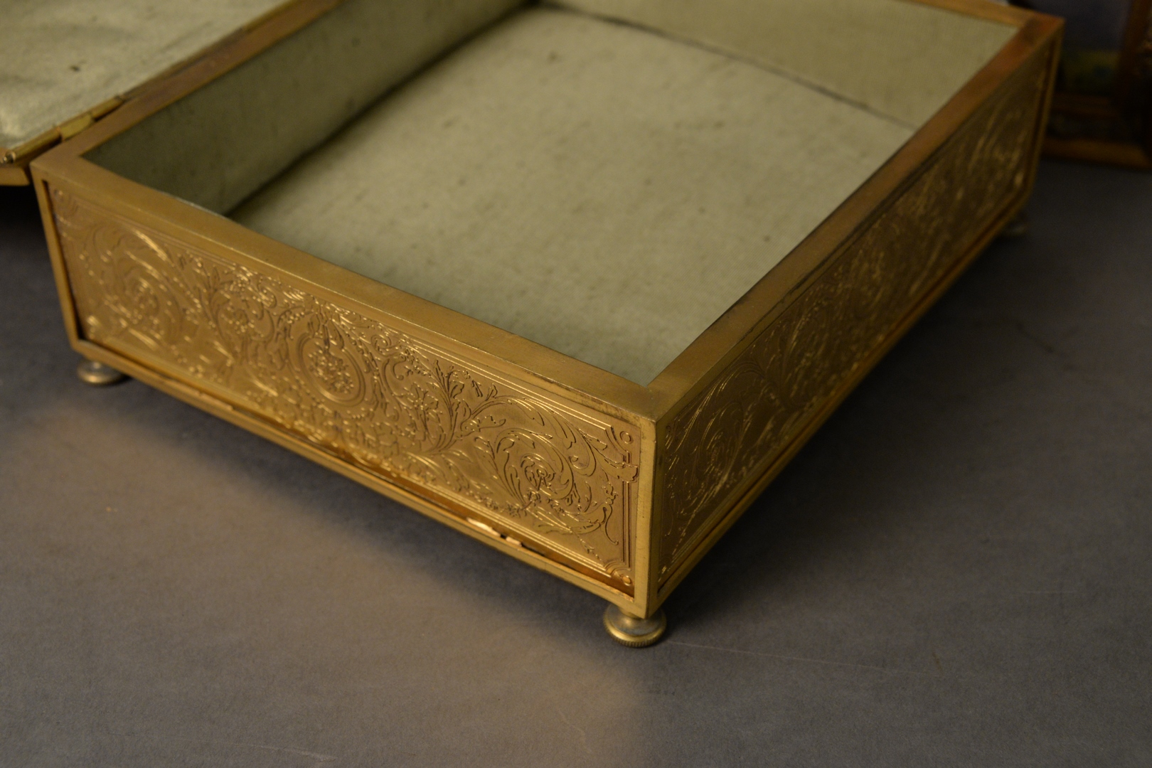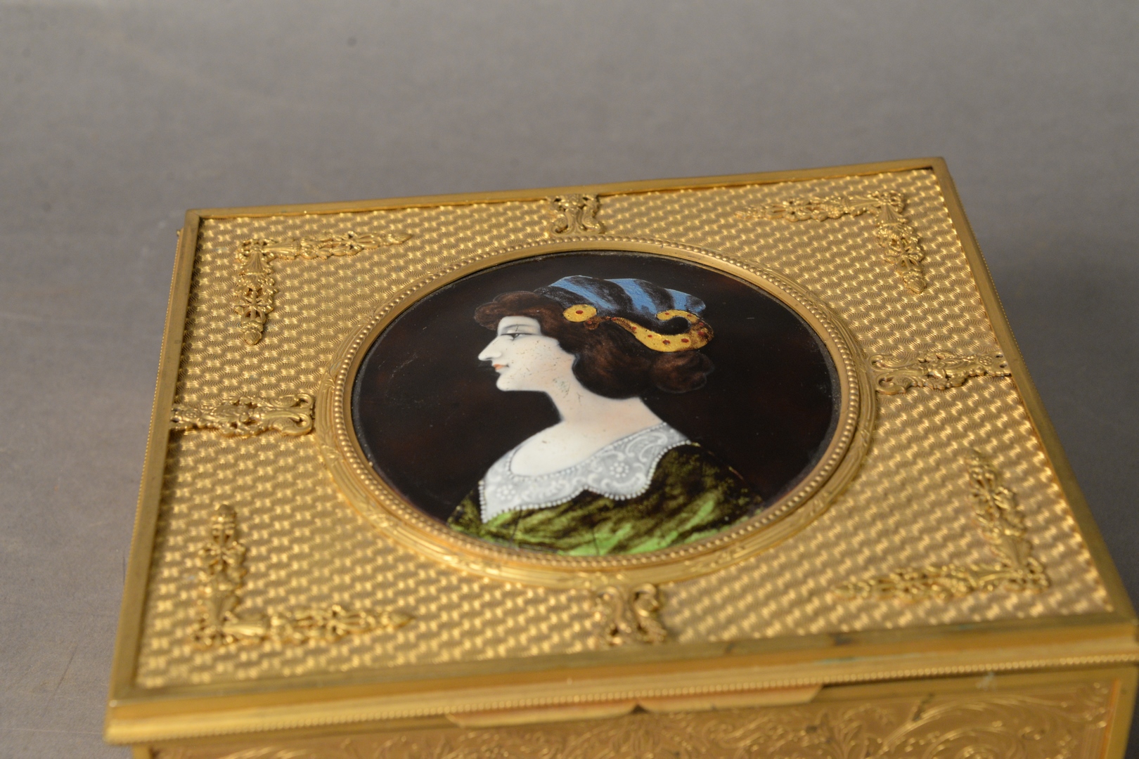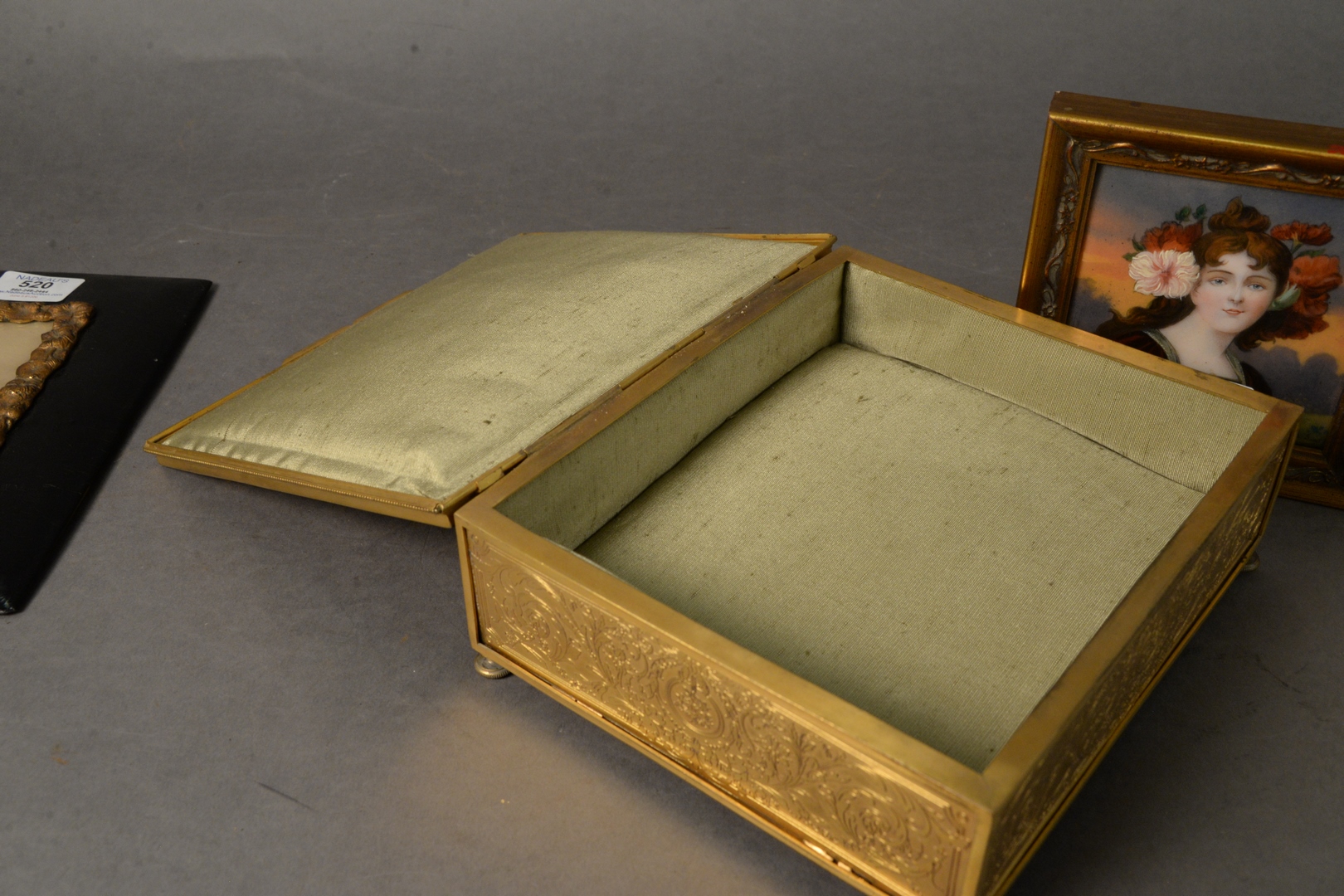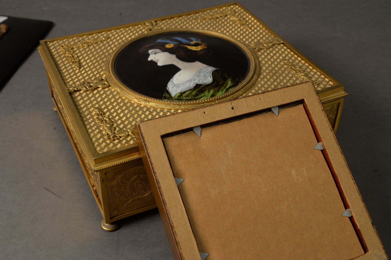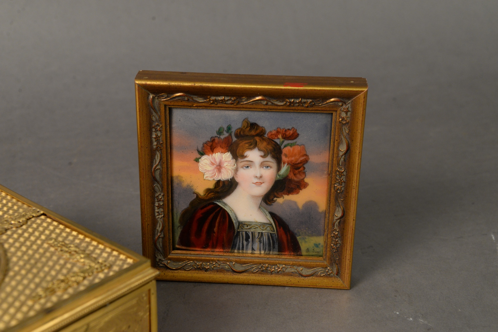 Lot 519: Two Piece Lot to include a French gilt bronze box having mounted and painted porcelain plaque of a woman along with a framed, paint…
