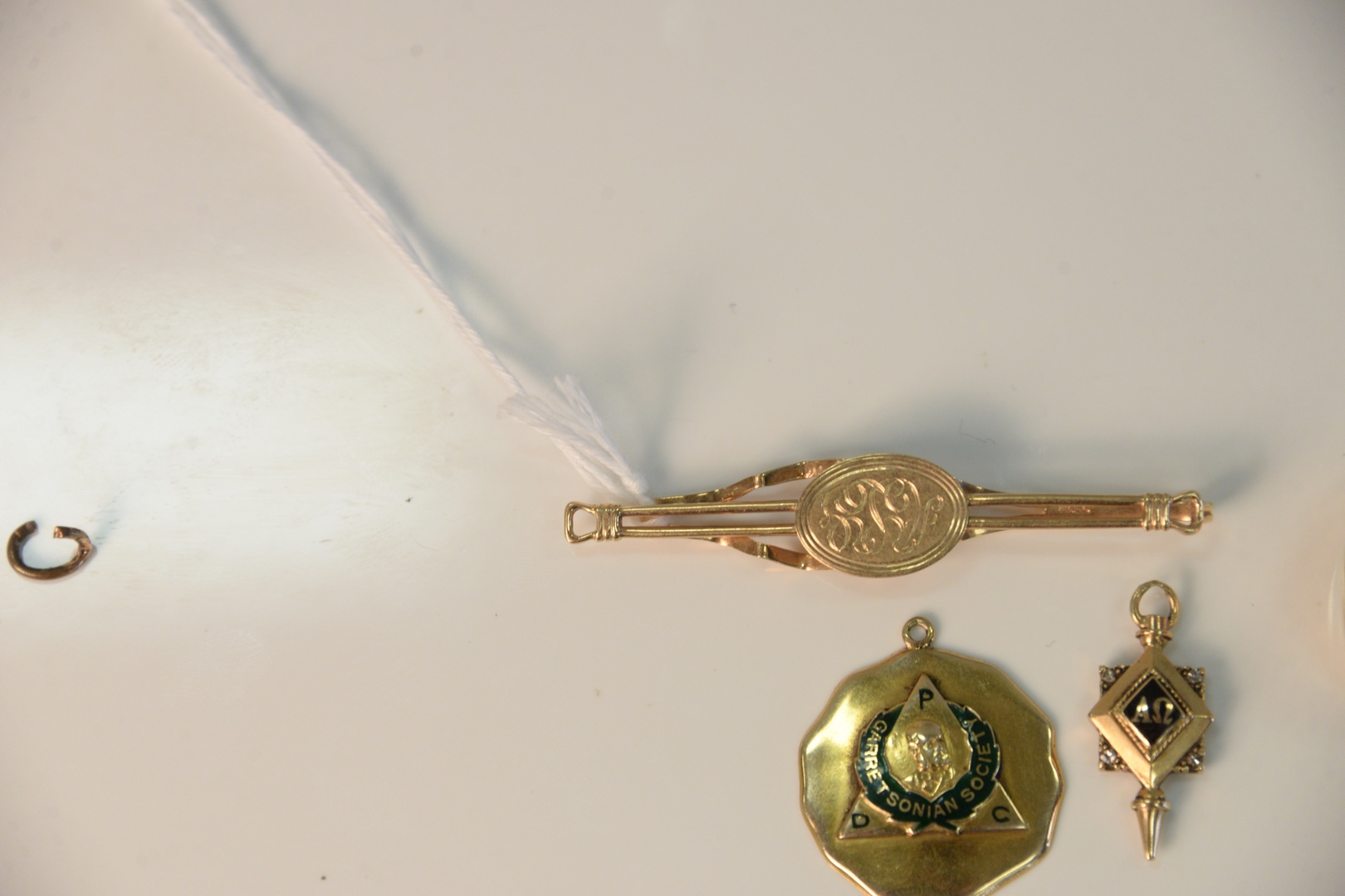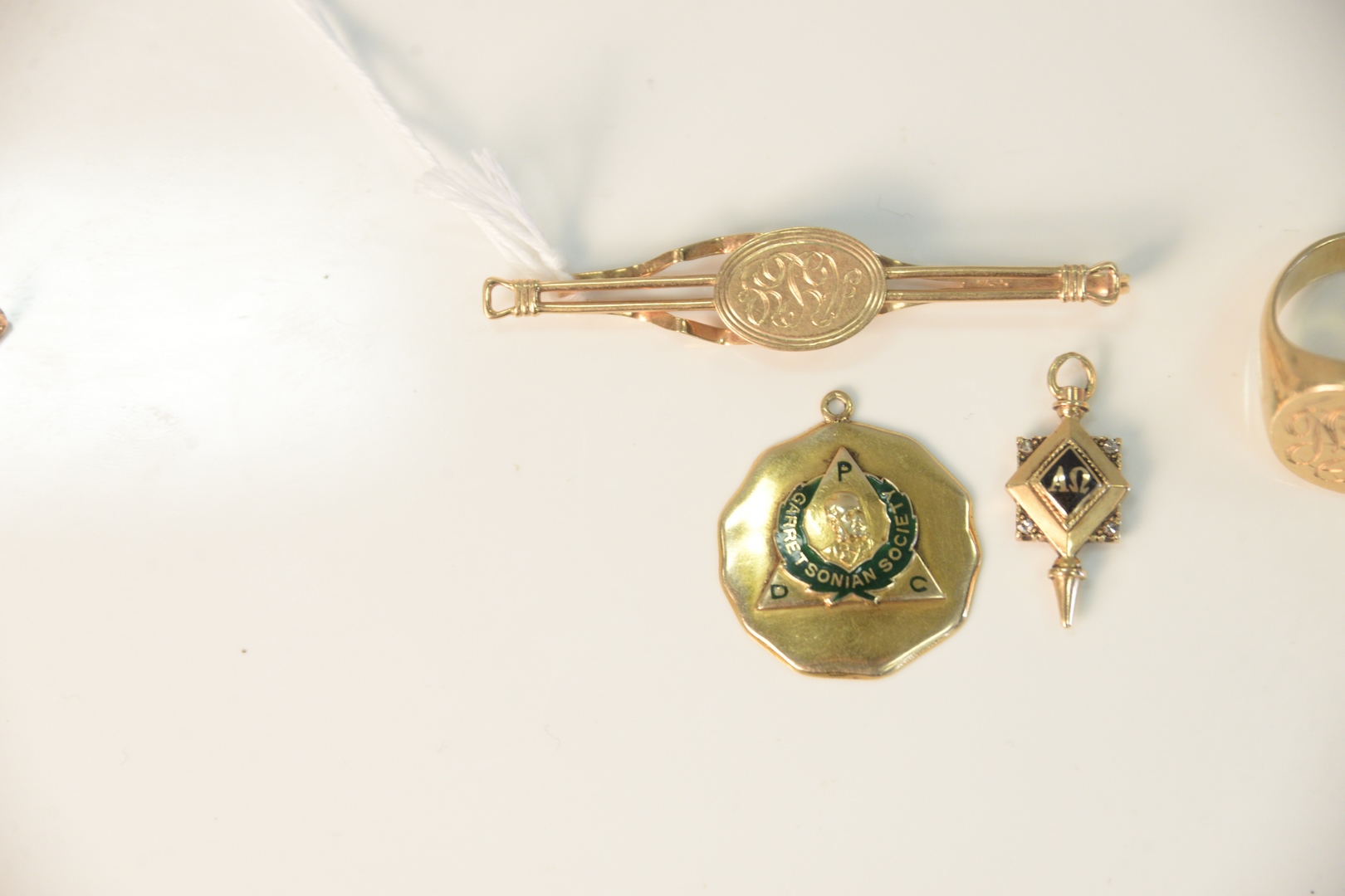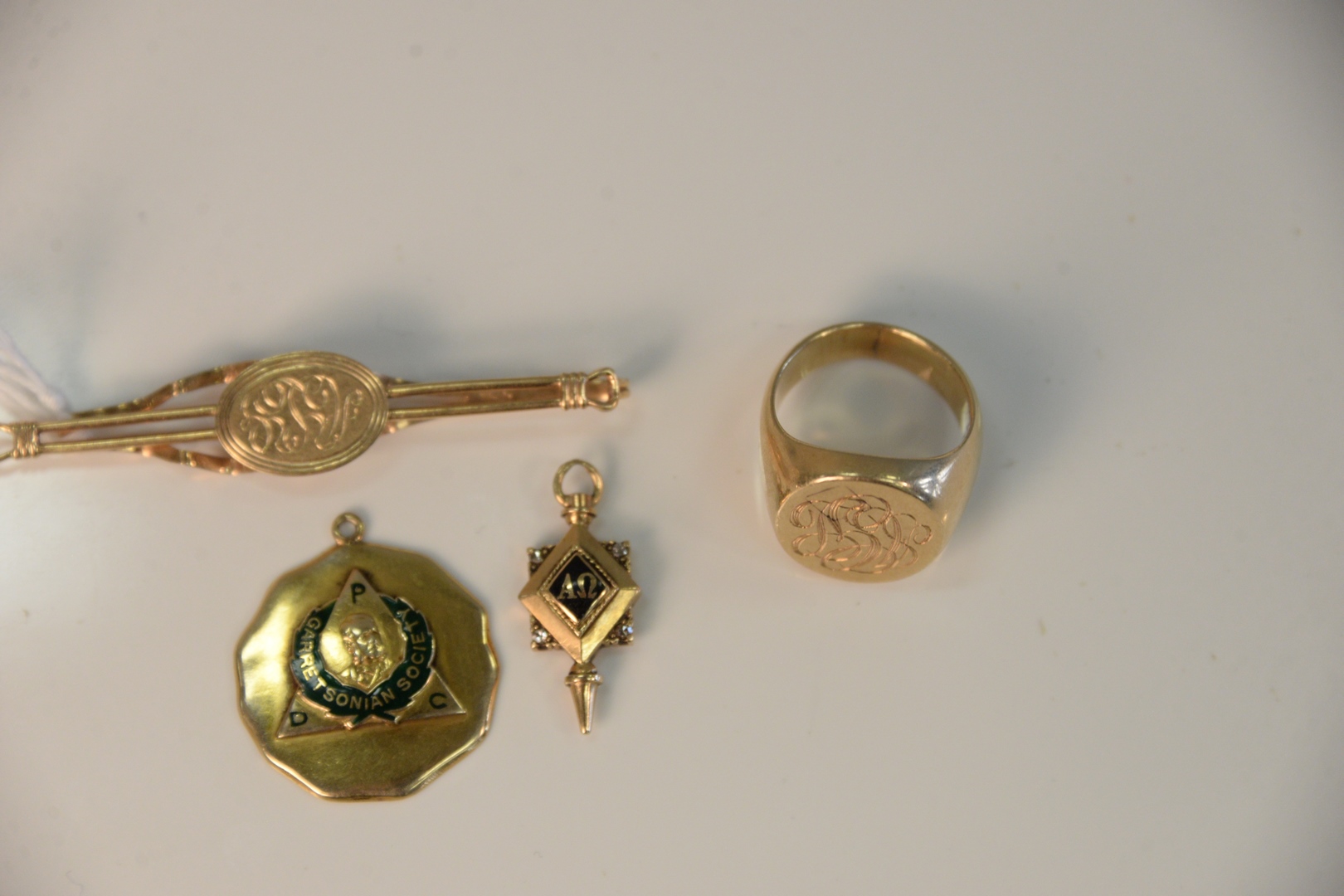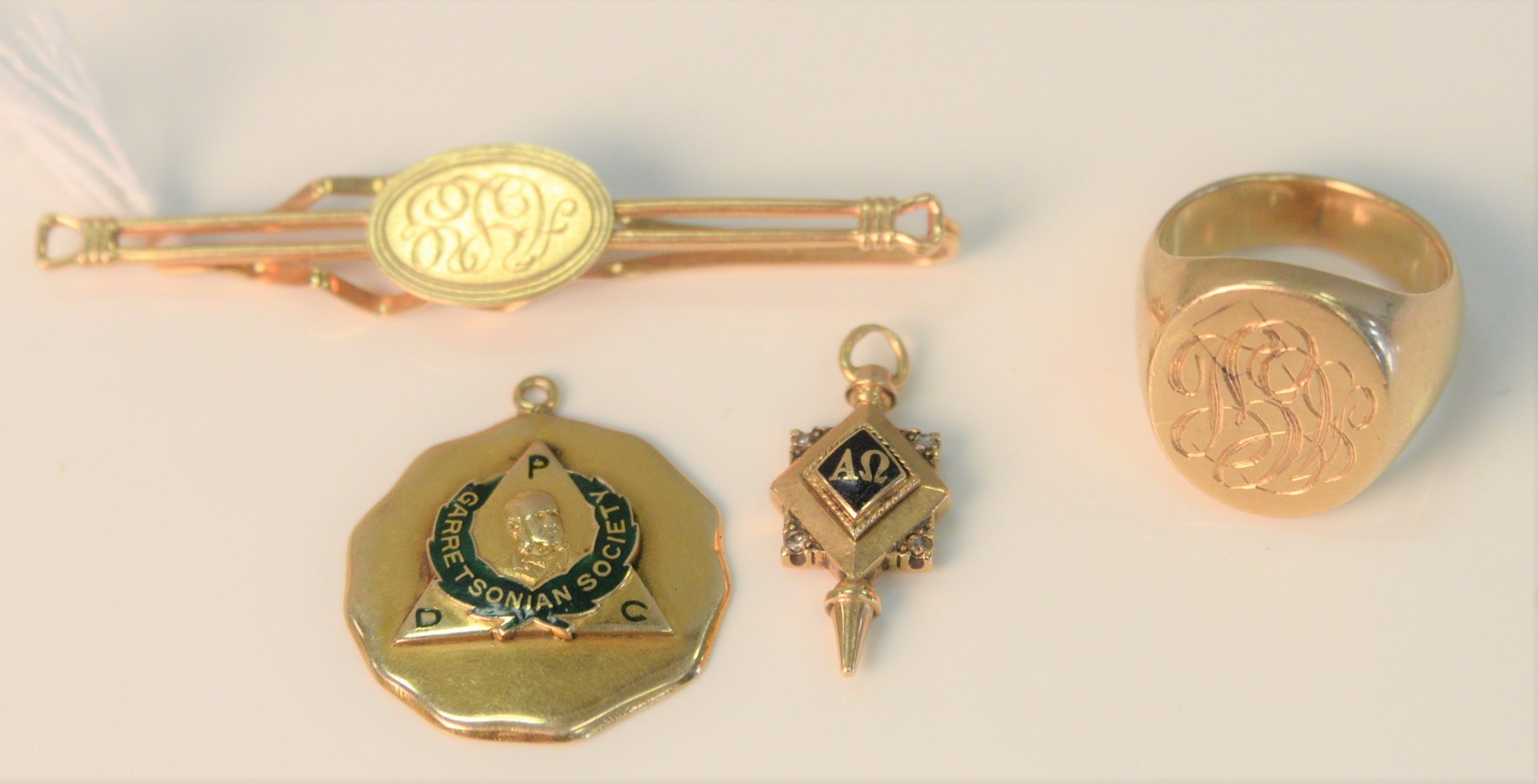 14 Karat Gold Lot to include ring, tie clip and two fobs 43 grams