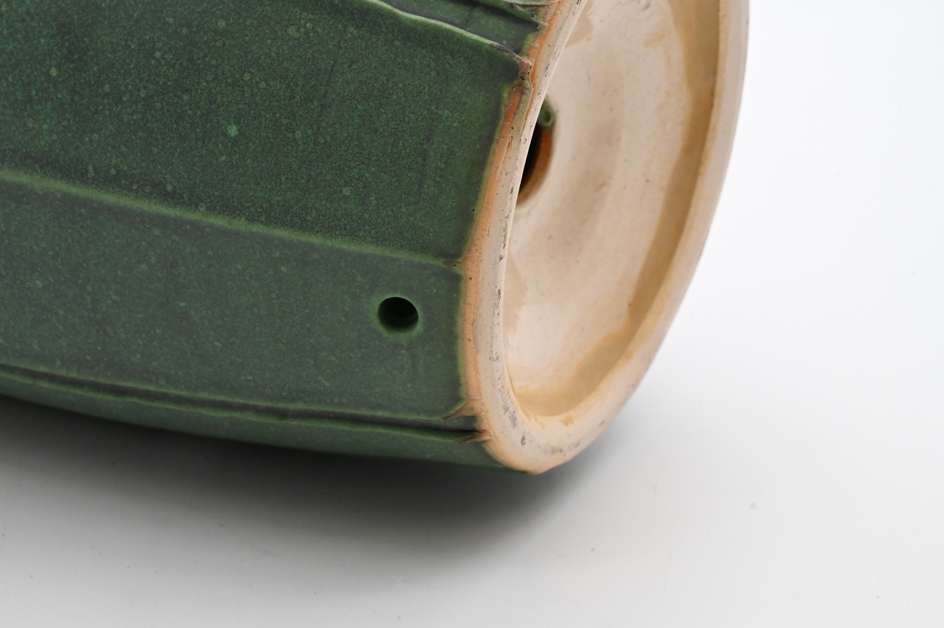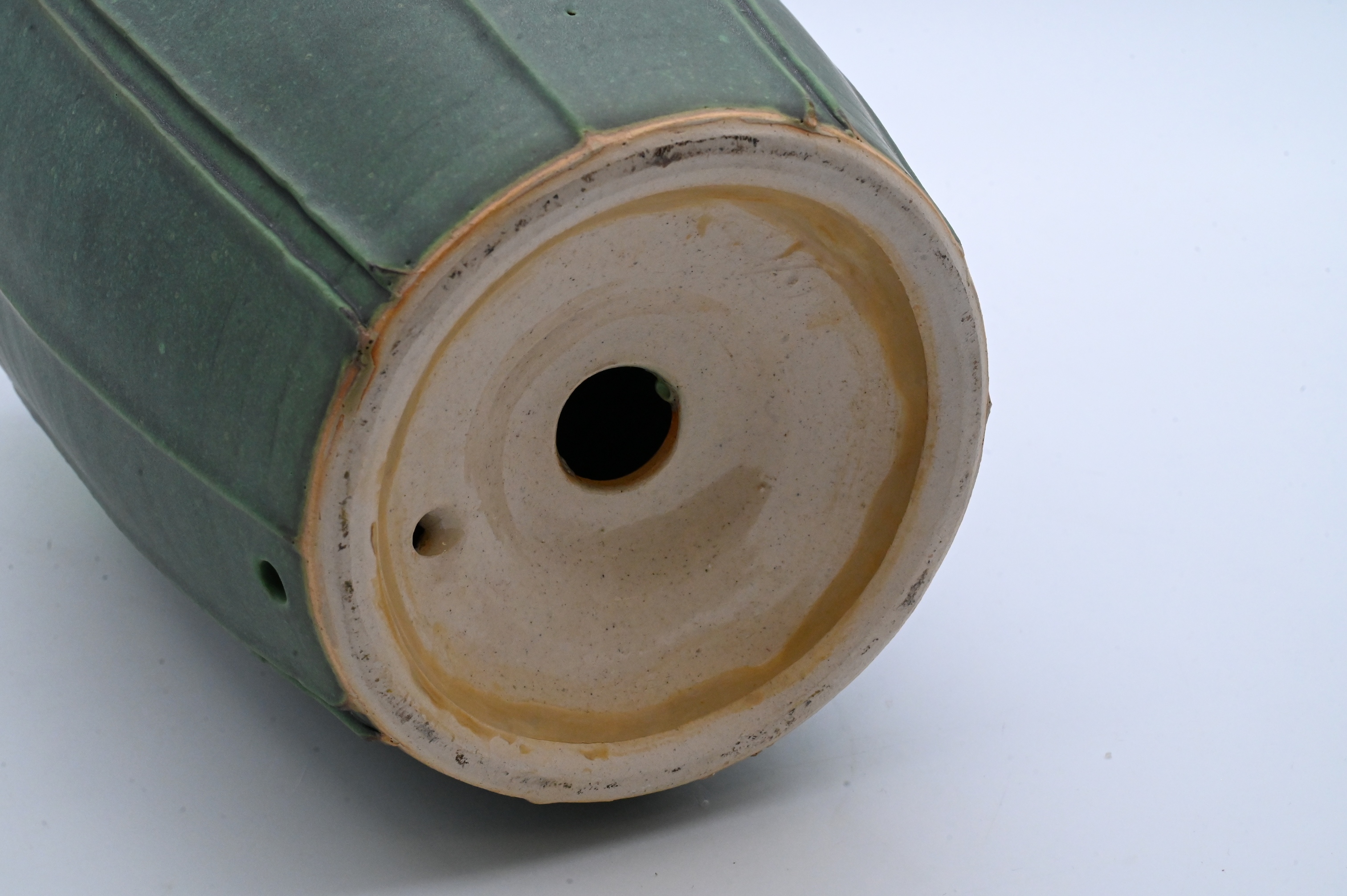 Early 20th Century, A tall ovoid vase with everted rim and tapering base, the shoulder decorated with stylized leaf-like ribs descending along the body, all covered in a rich mottled matte green glaze characteristic of Grueby. drilled hole