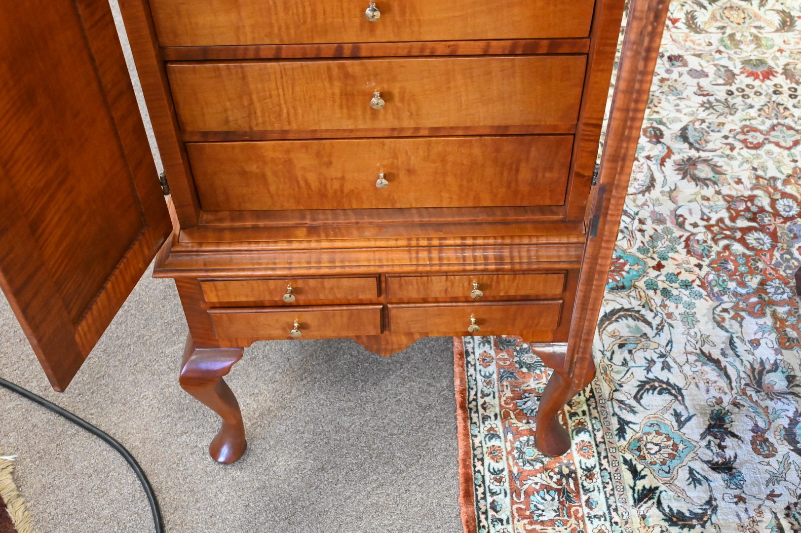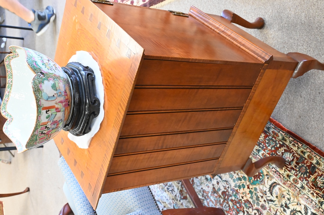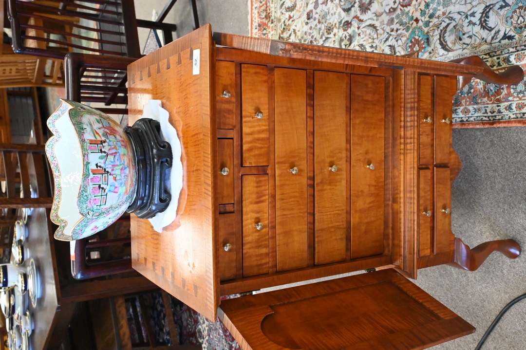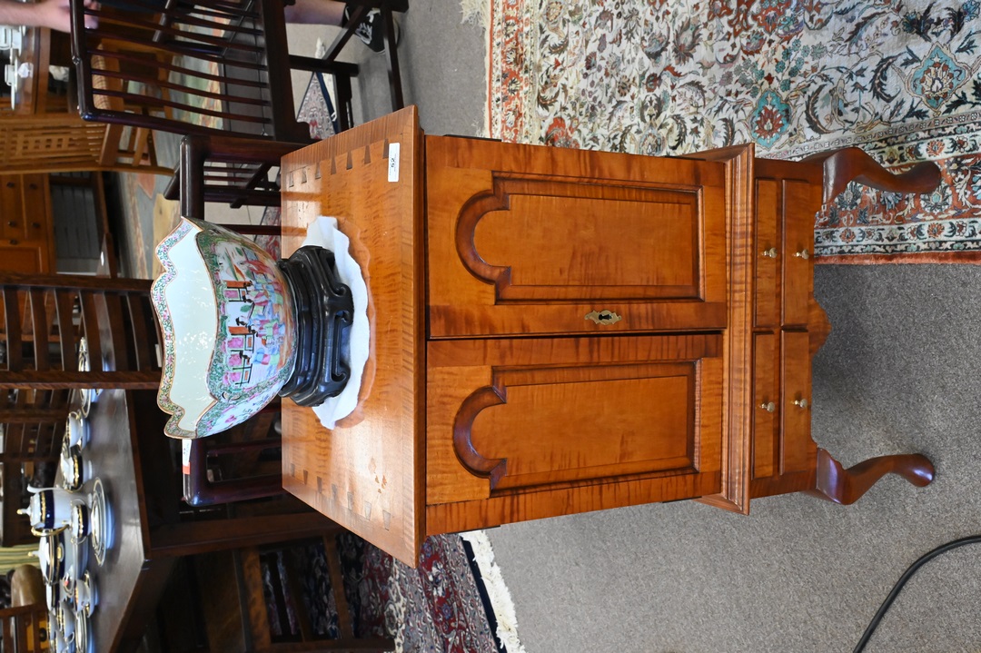 Benchmade Tiger Maple Diminutive Chest, on frame, having two doors opening to fitted interior, over four drawers, height 32 1/2 inches, top 16 1/2″ x 18″.