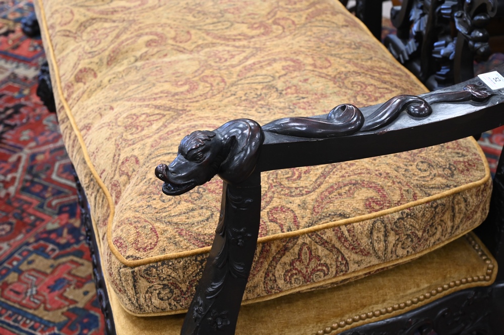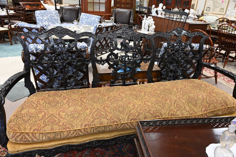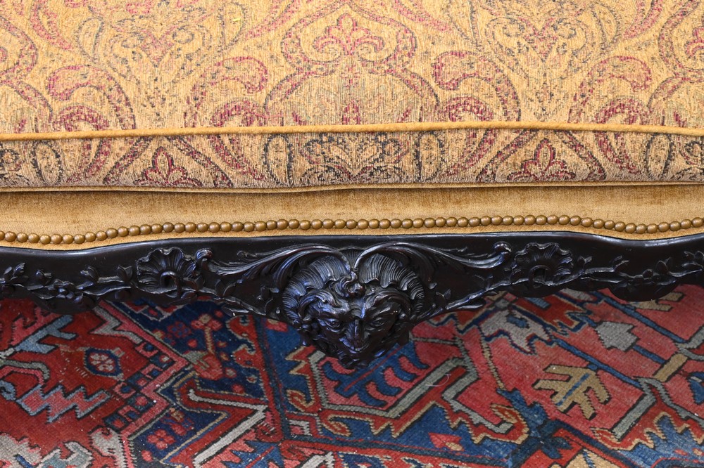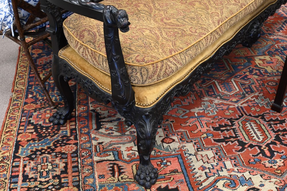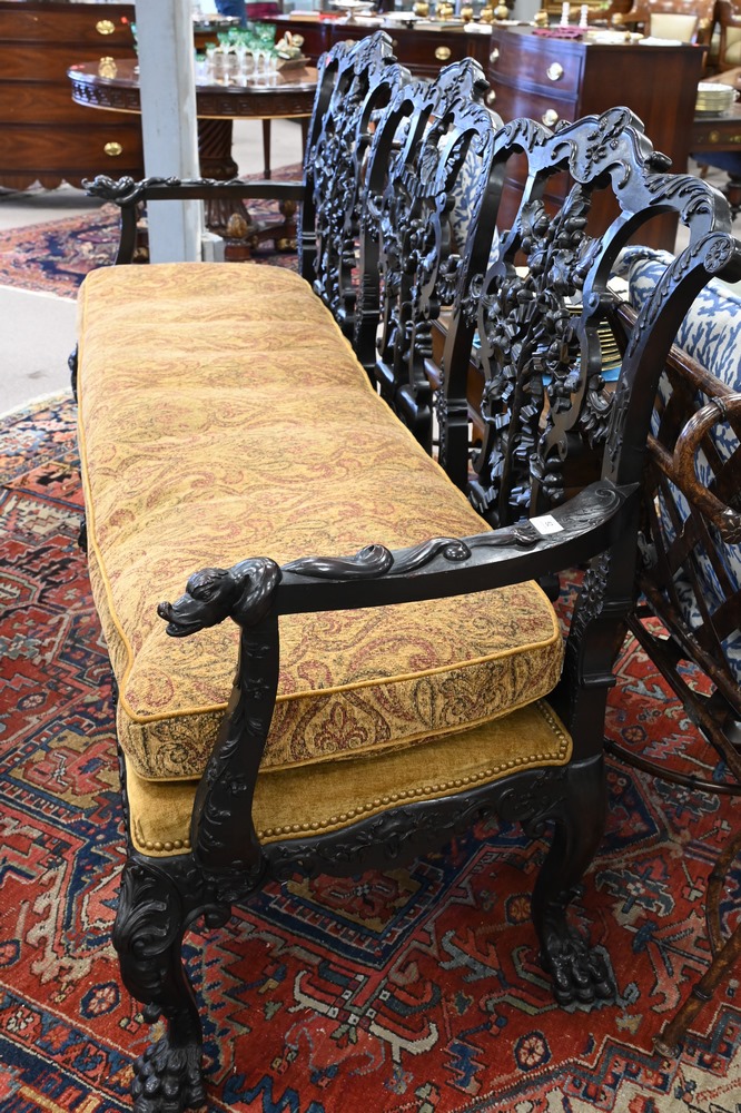 Lot 52: Chippendale Style Triple Chair Back Settee, having piece carved oak leaves and bird, having carved bird handrests, custom upholstery cushion center carved face and hairy paw feet, height 35 inches, length 81 1/2 inches.