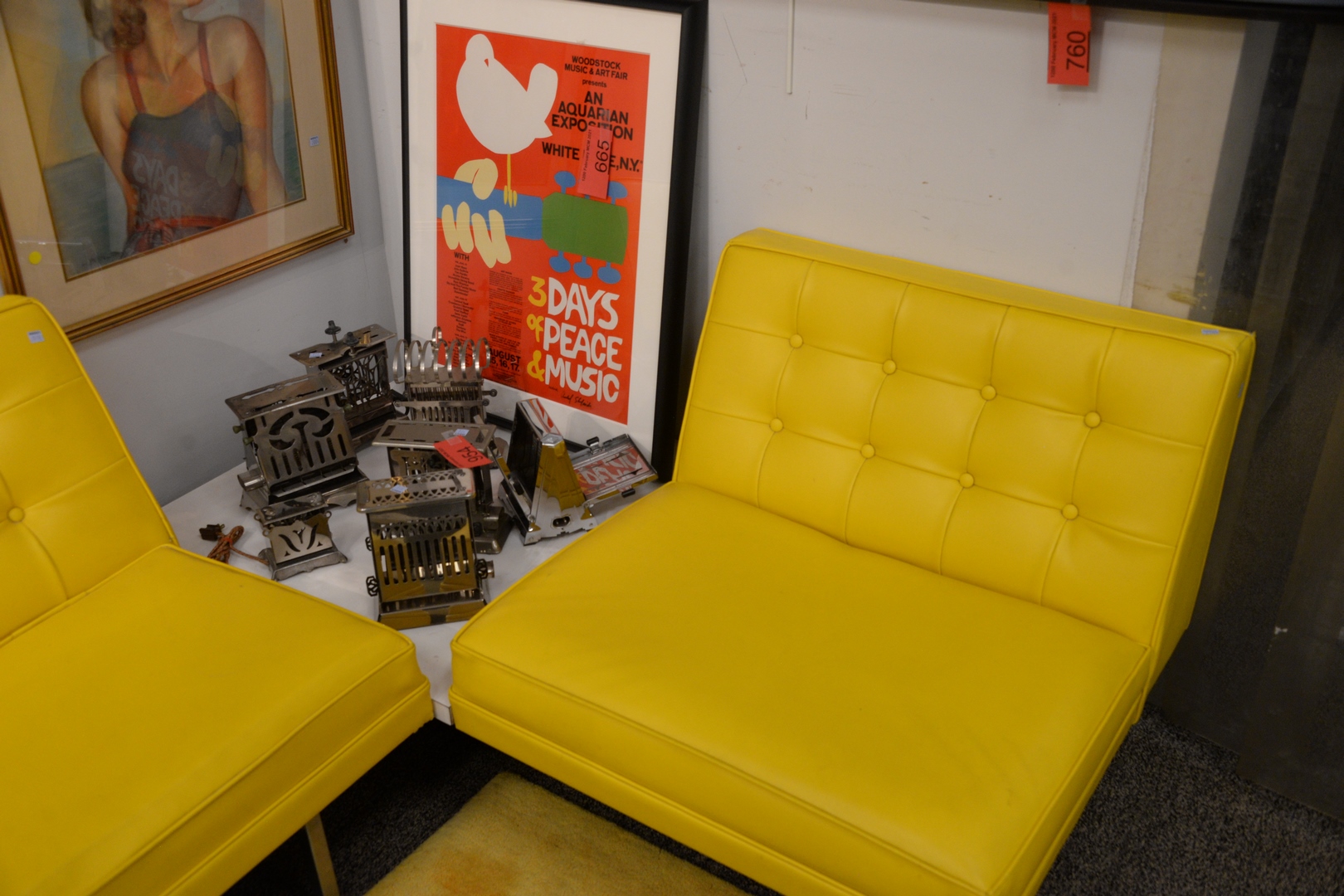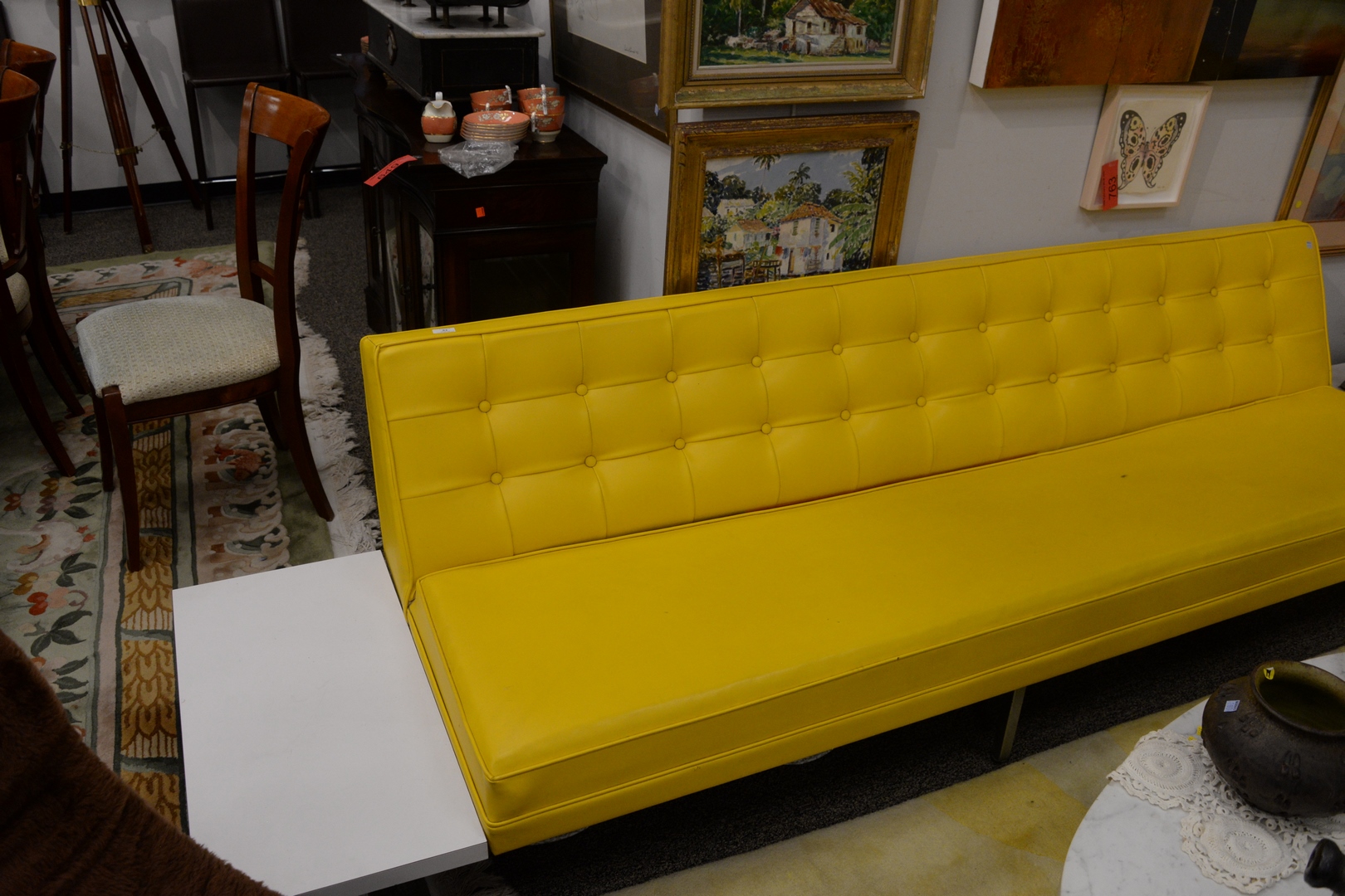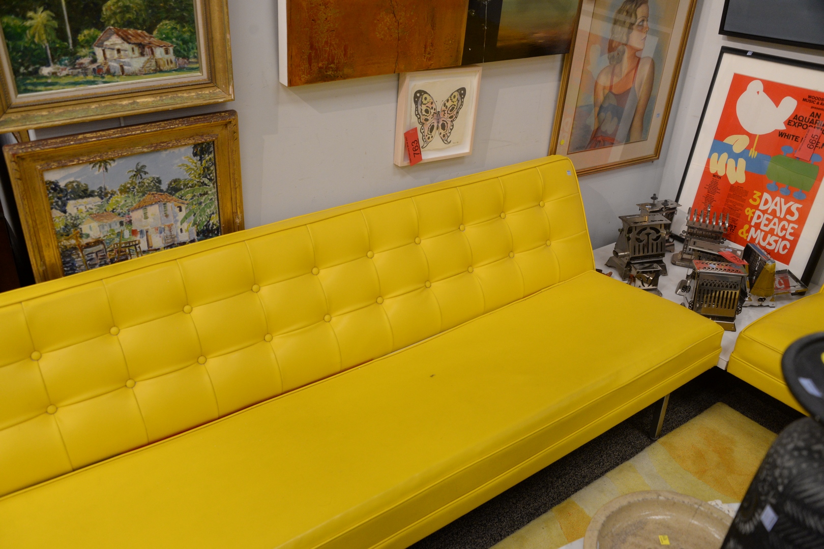 Lot 52: George Nelson for Herman Miller Two-Part Sectional Sofa, with tables, having steel frame, yellow vinyl upholstery, height 27 inches, 136″ x 60″.