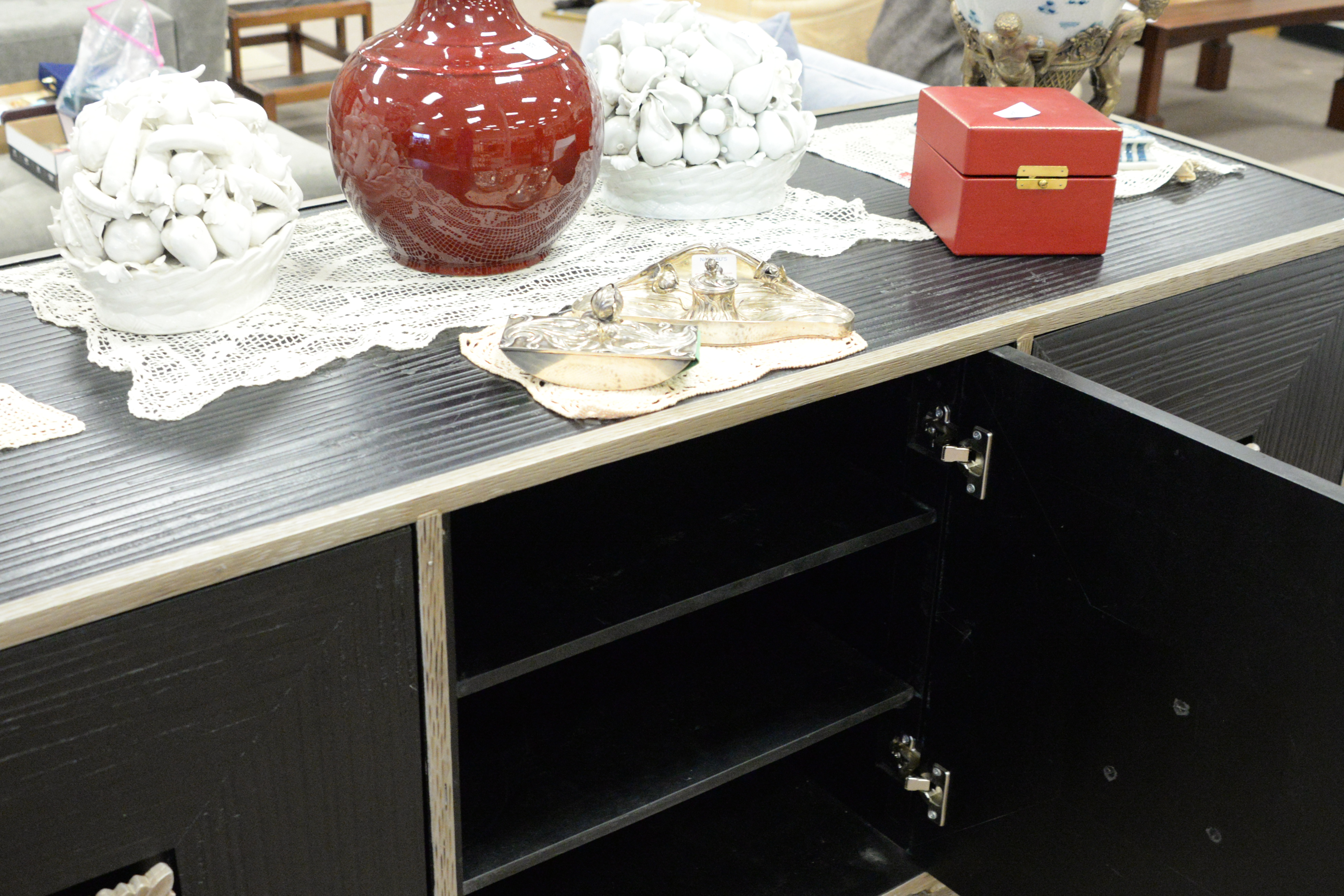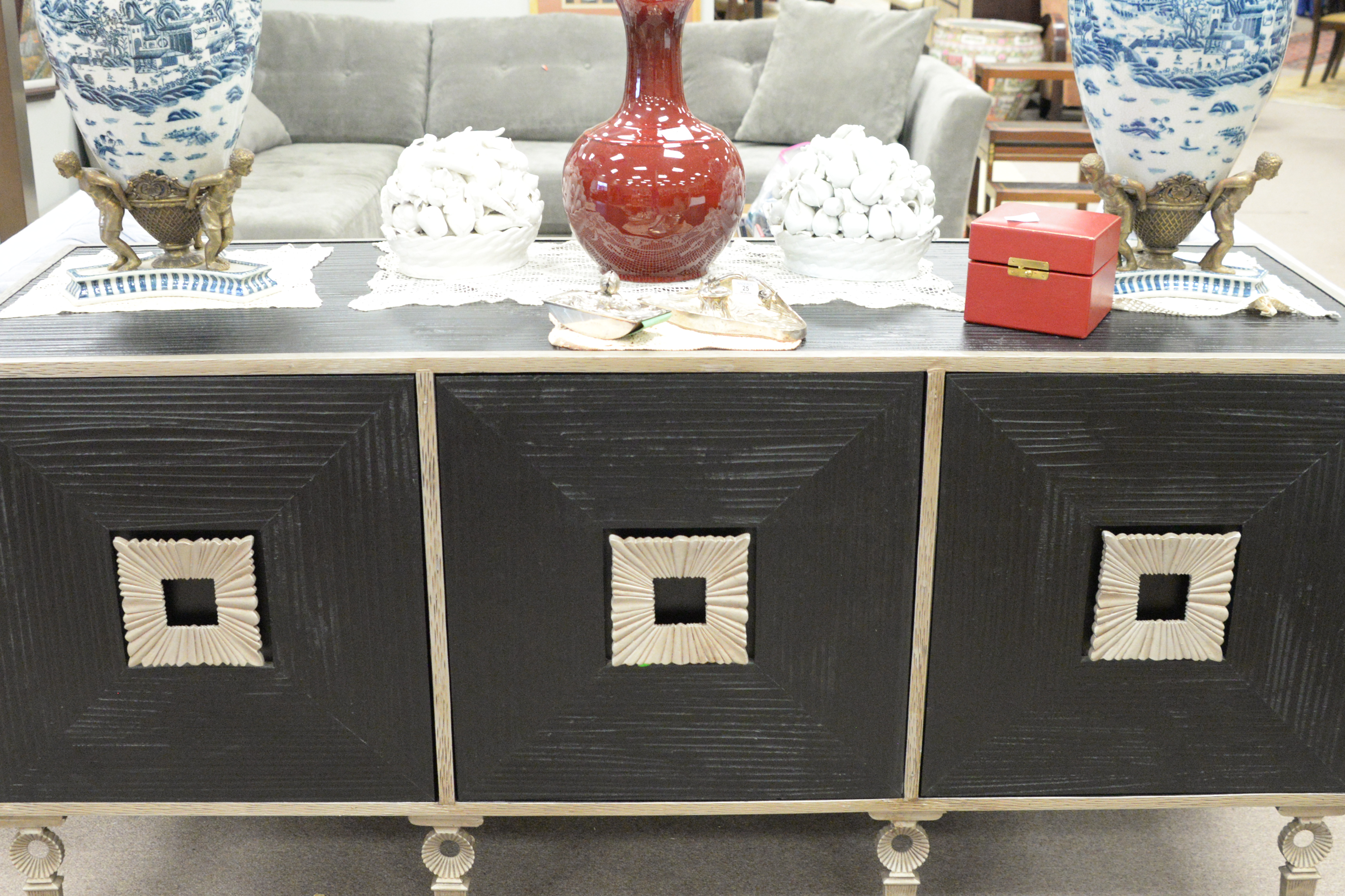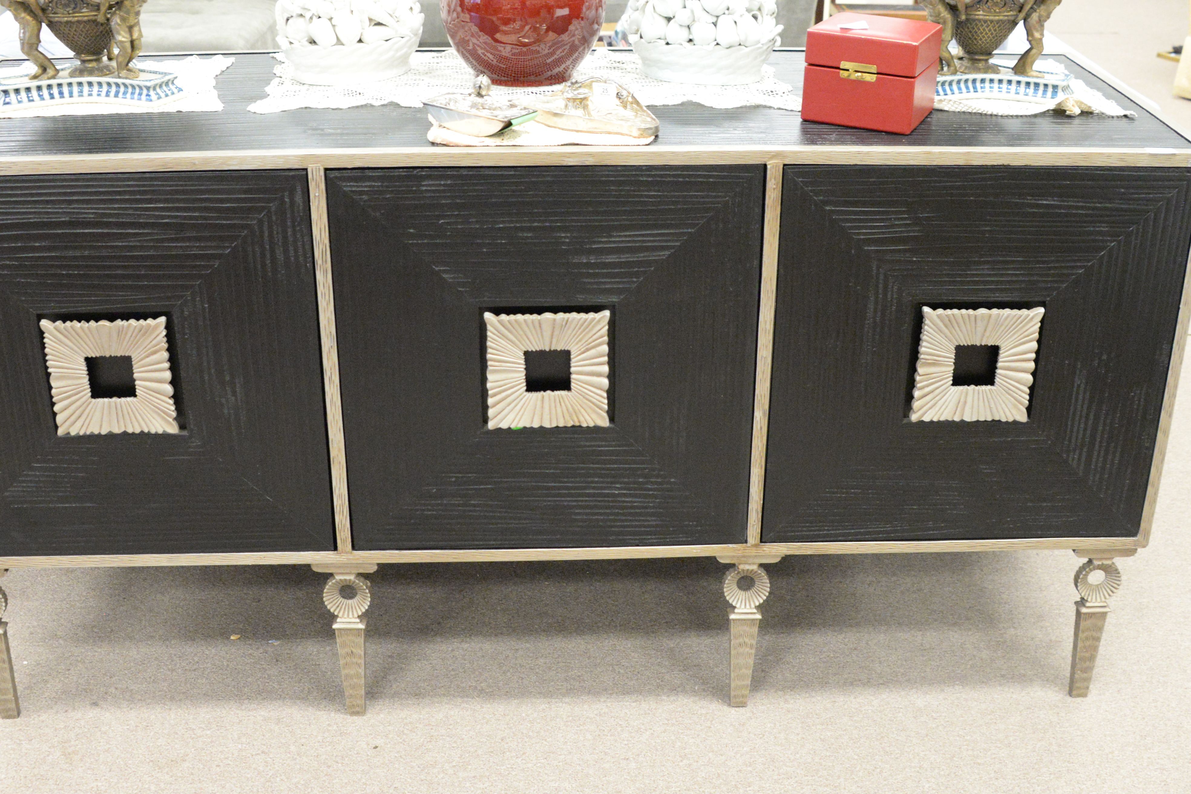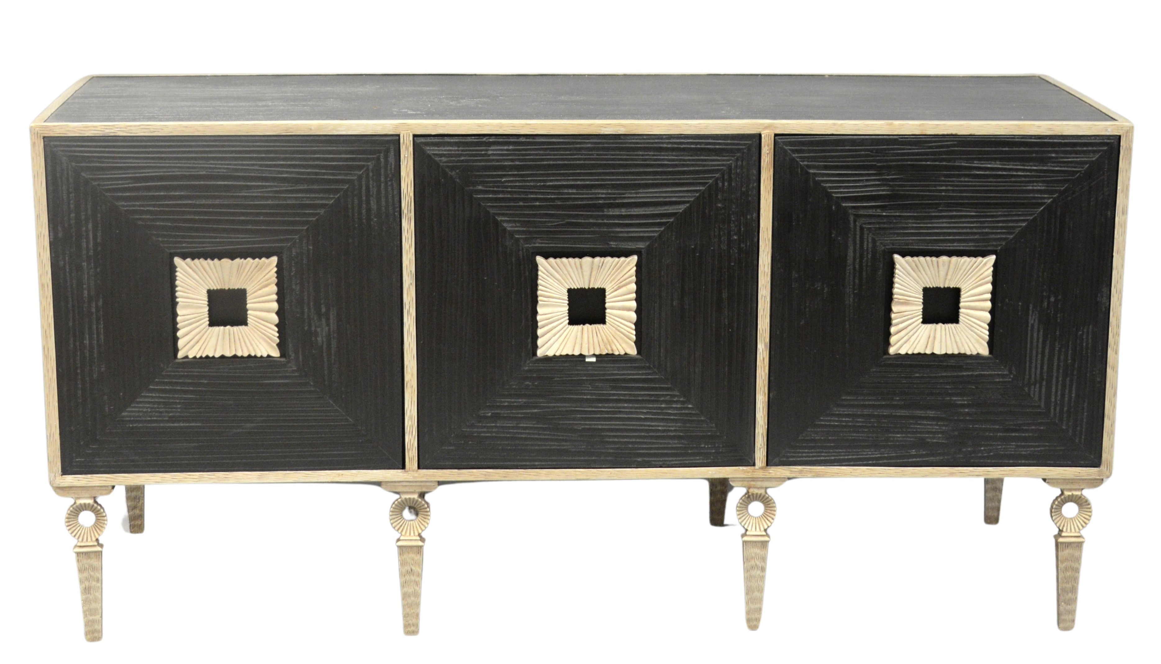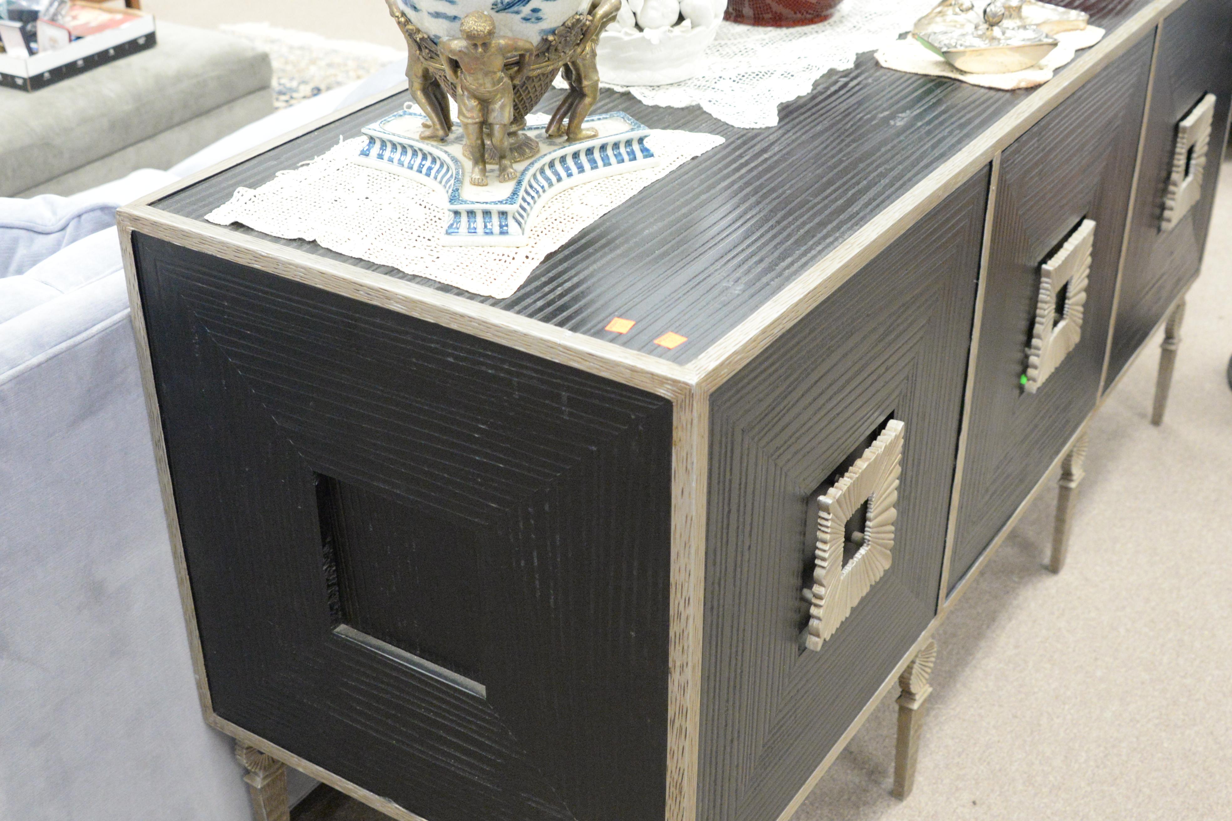 Global Views “Artisan” Triple Chest, having three doors opening to interior shelving, set on forged iron frame, height 34 3/4 inches, top 20″ x 40 1/2″