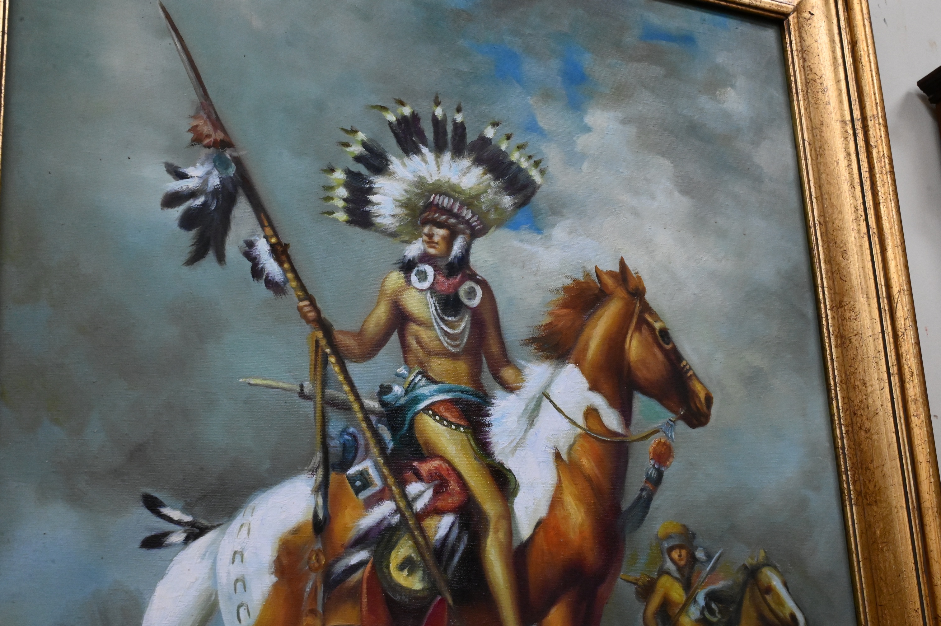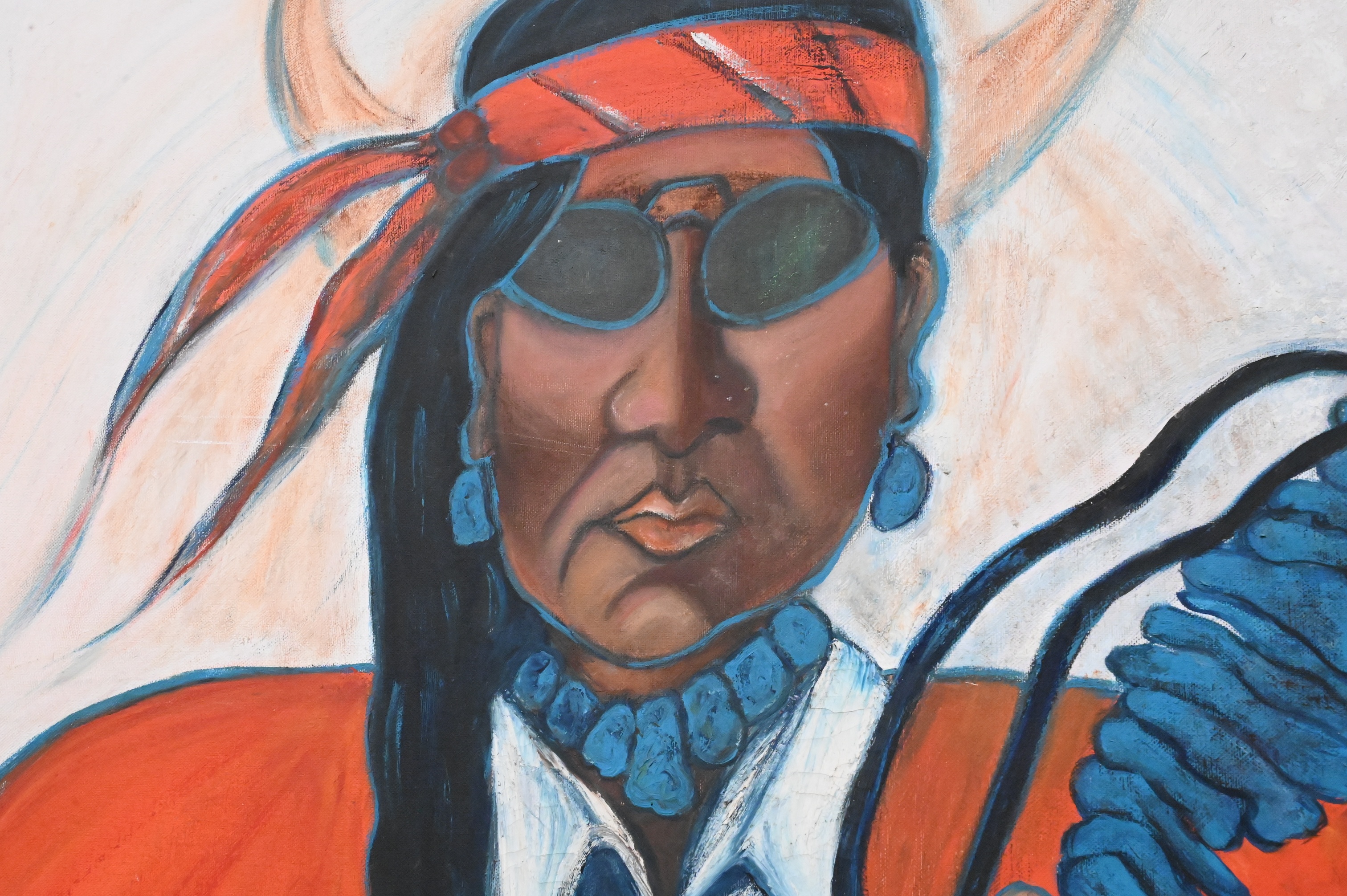Large portrait of a Native American Indian man with sunglasses, horns and turquoise jewelry, 1990