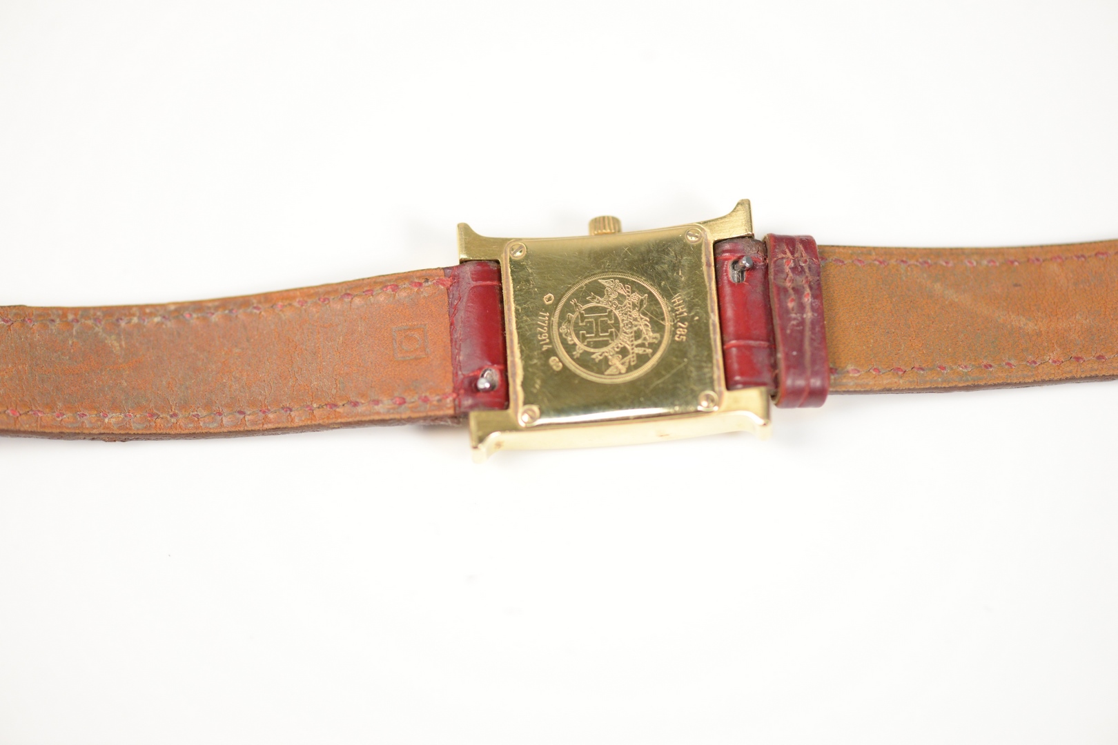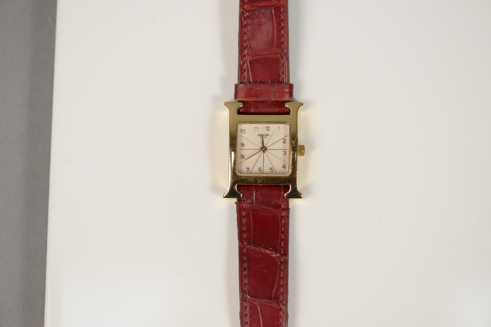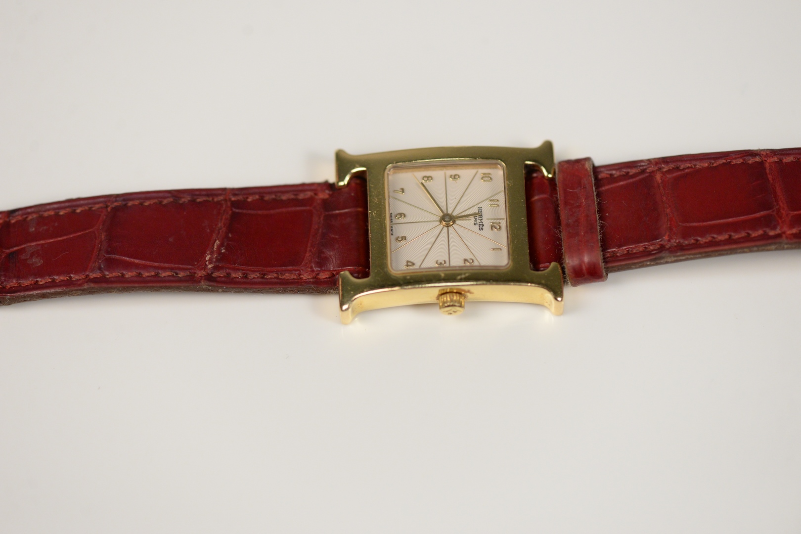 Lot 52: Hermes 18 Karat Gold Ladies Wristwatch with Hermes 18 karat gold, and red leather band 21.3 millimeters