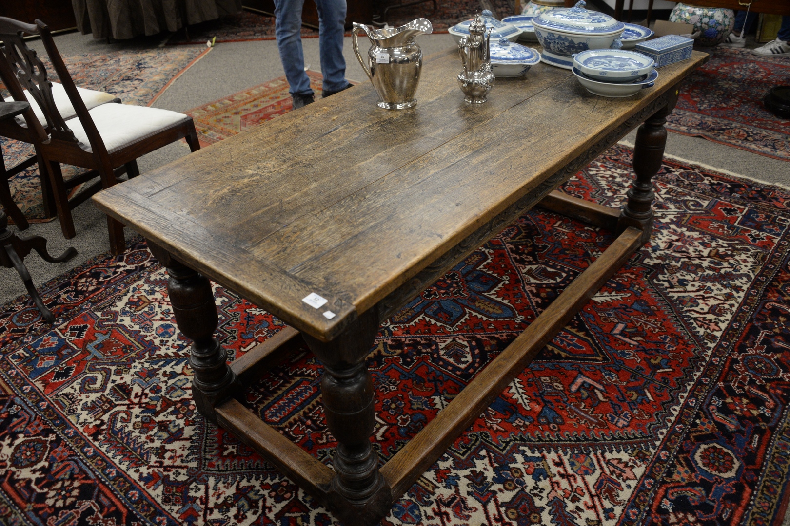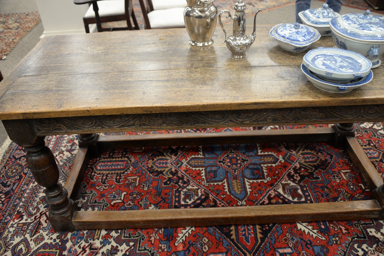 Lot 52: Jacobean Style Oak Table Top with breadboard ends on carved frieze, on large turned legs with box stretcher, possibly made up of older elements, height 28 3/4 inches, top 30 x 72.