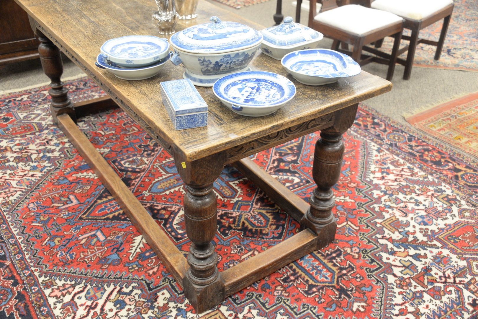 Jacobean Style Oak Table Top with breadboard ends on carved frieze, on large turned legs with box stretcher, possibly made up of older elements, height 28 3/4 inches, top 30 x 72.
