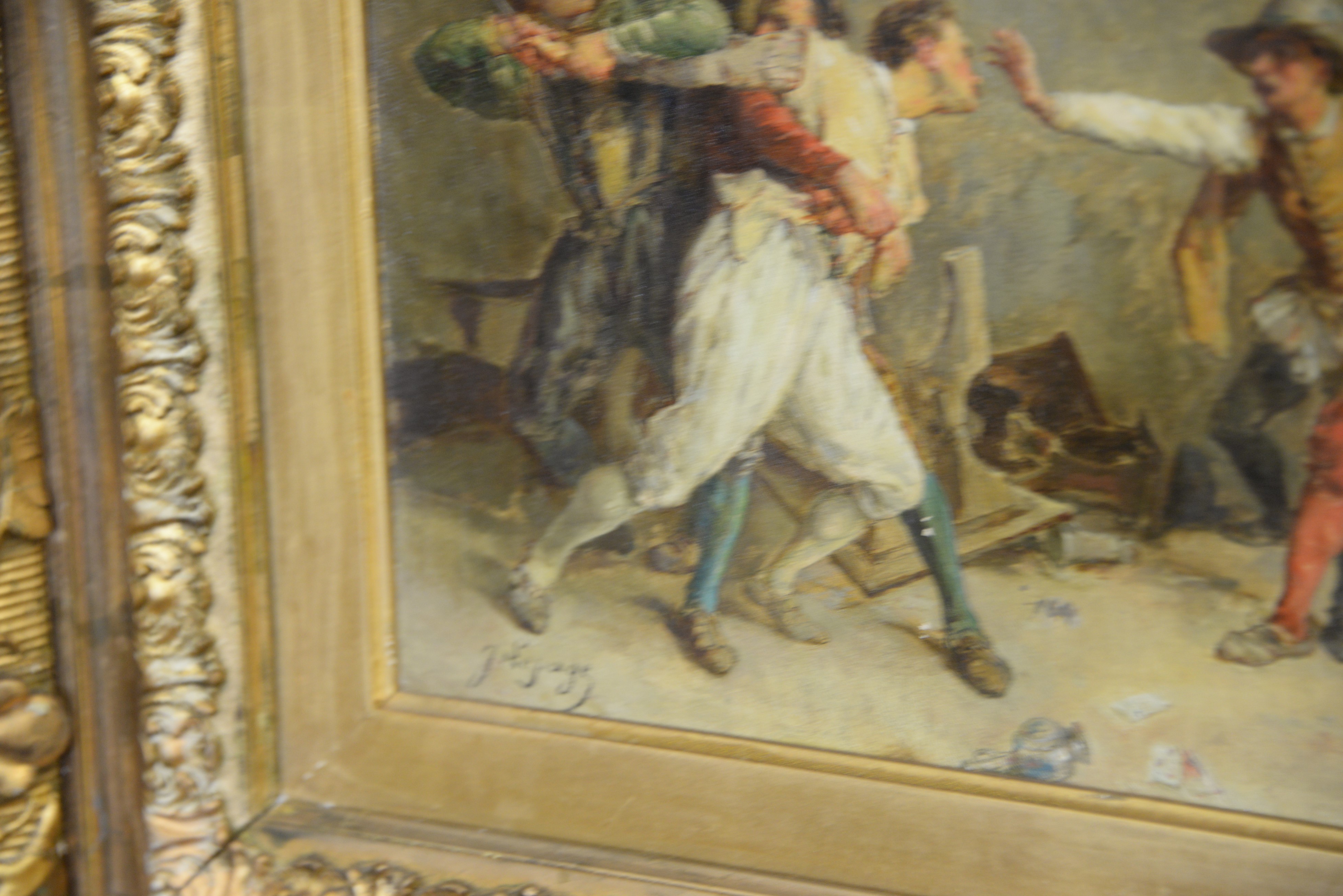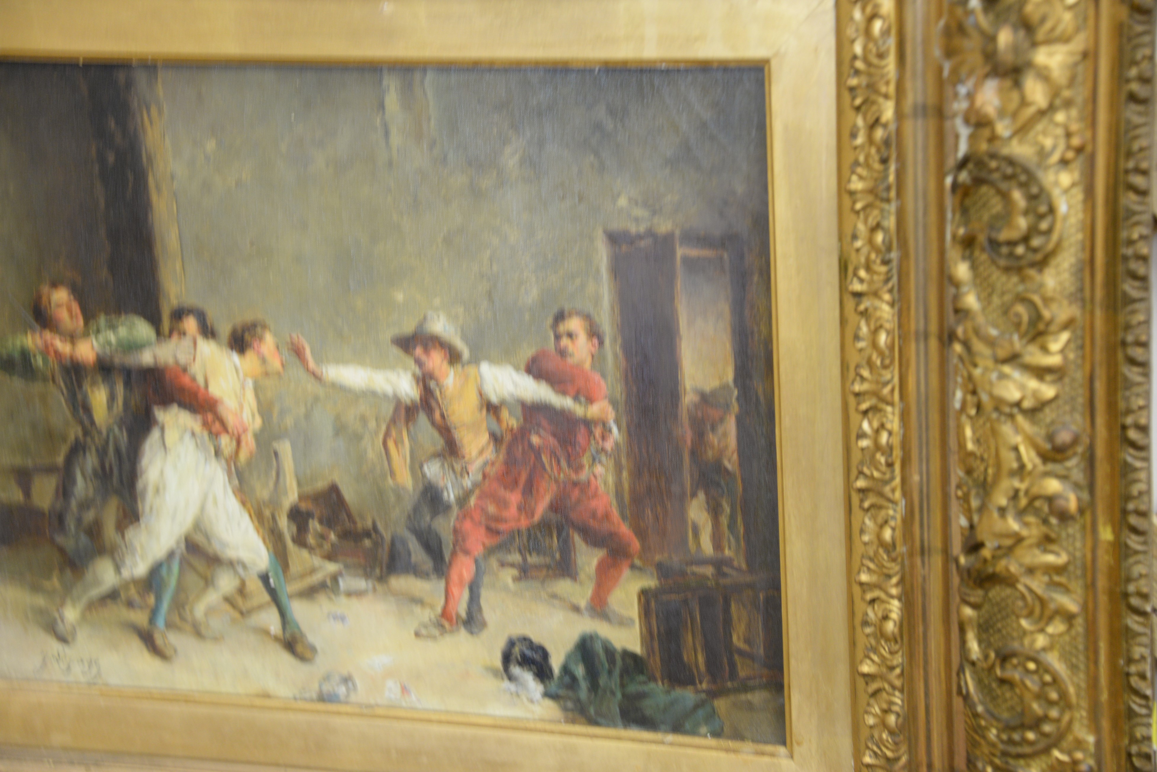 Lot 52: LePage, oil on canvas, The Duel, 19th century French School, signed lower left J. LePage, in gilt frame, 11 x 14.