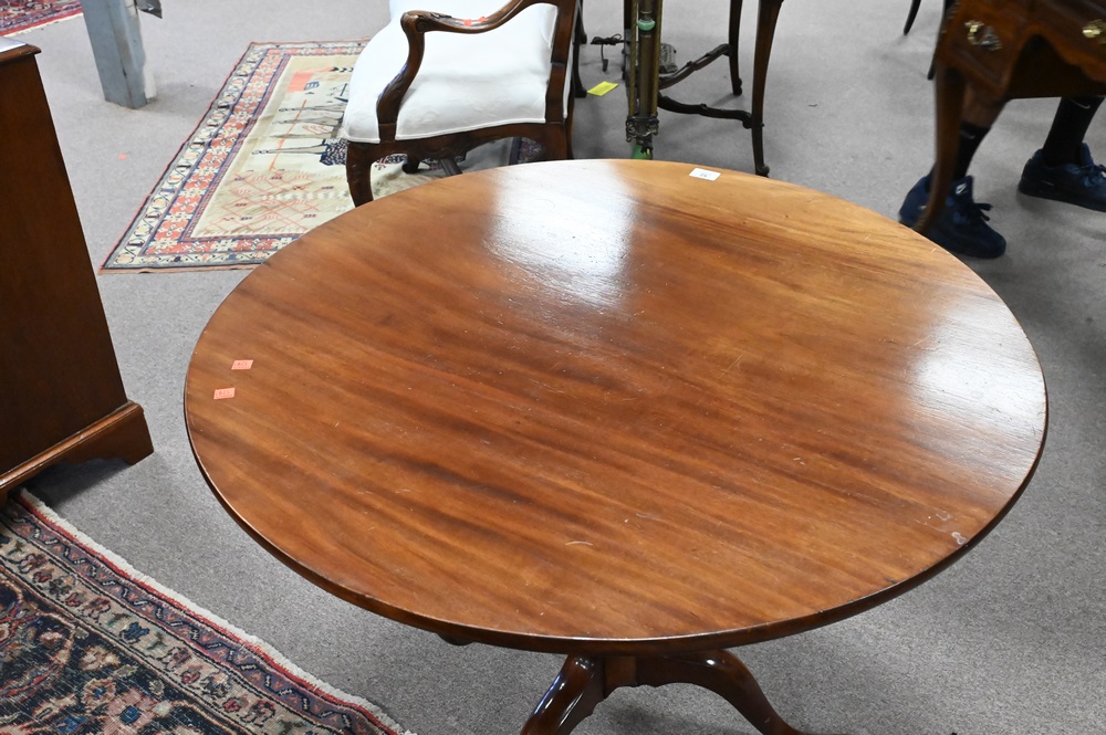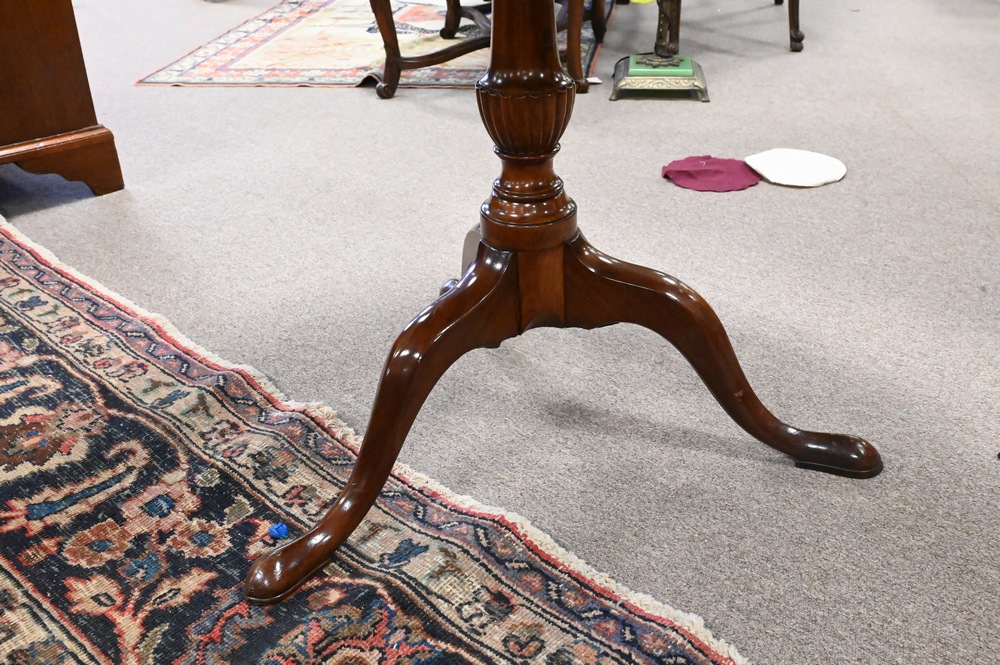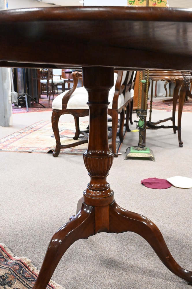 Mahogany Round Top Tip Table, on pedestal with fluted urn, set on tripod base, probably Massachusetts circa 1800, height 28 1/2 inches, top 35 1/2″ x 36 1/4″.