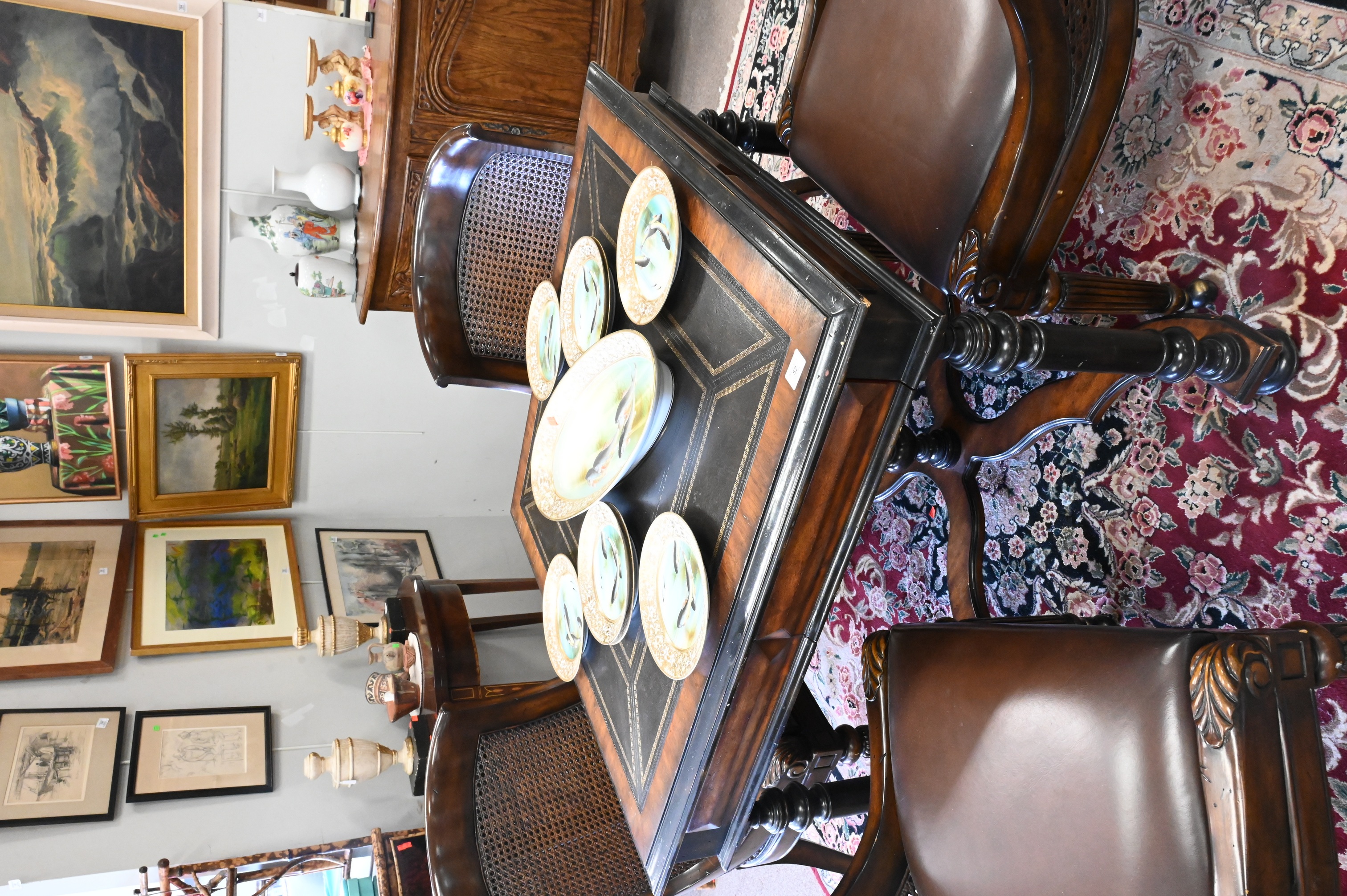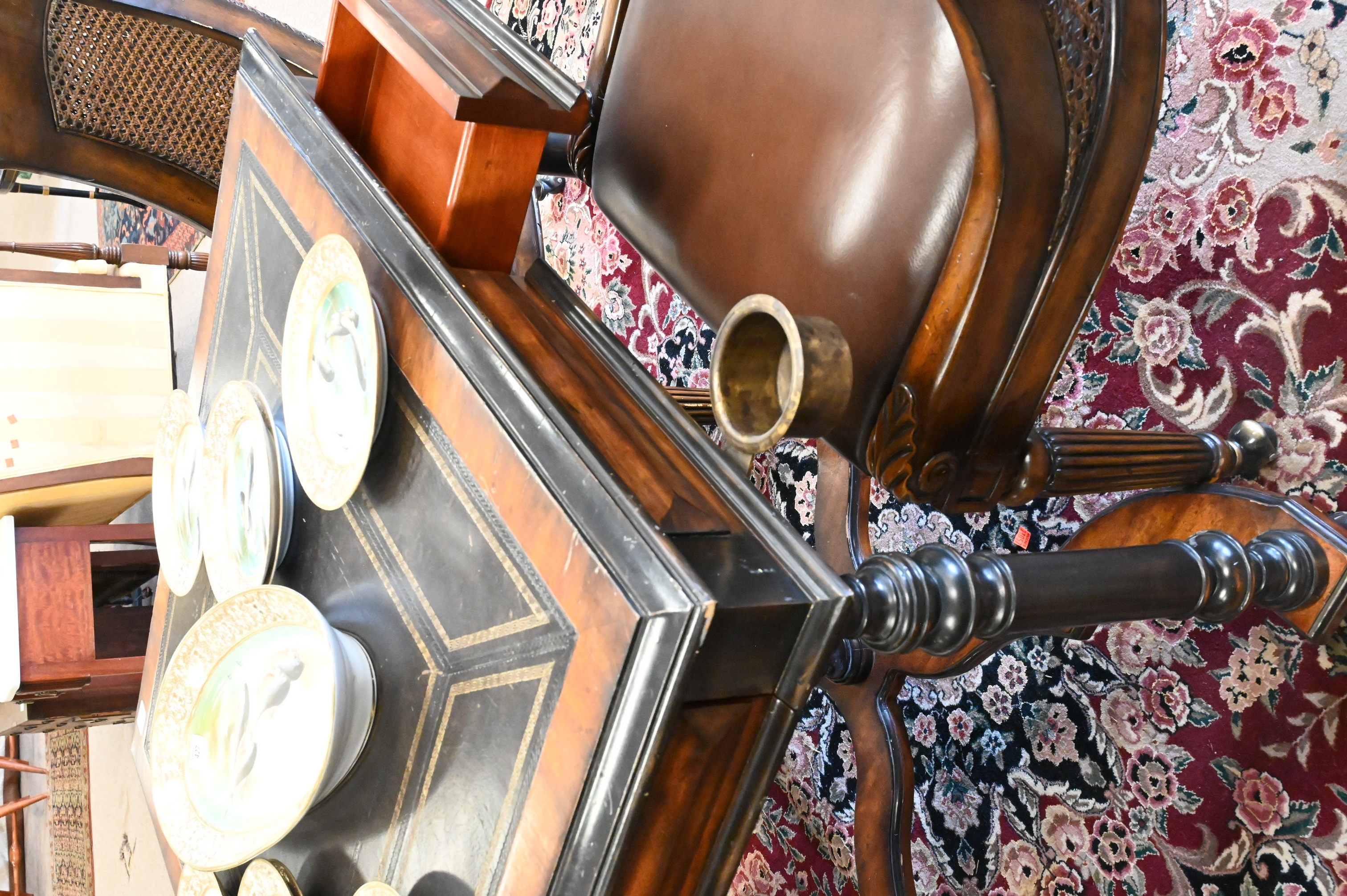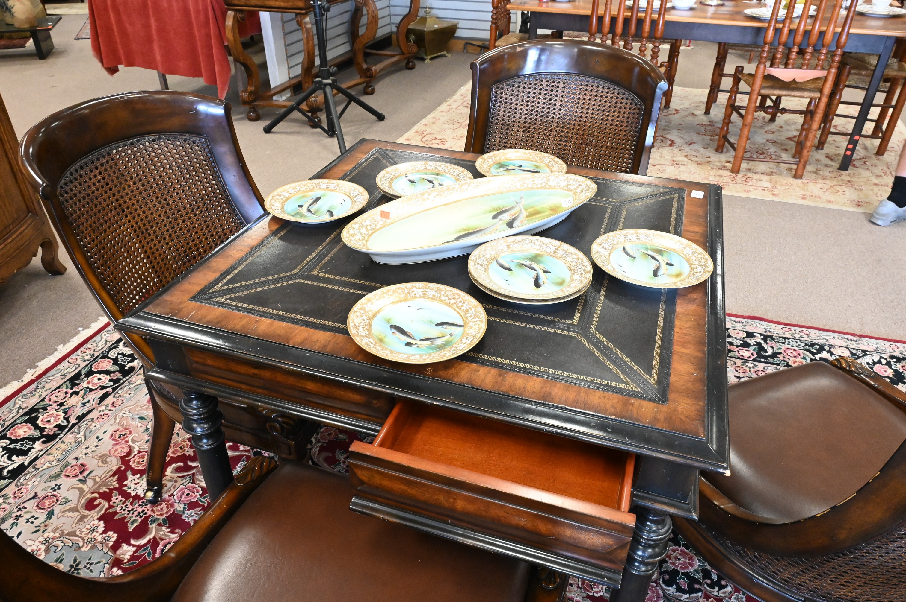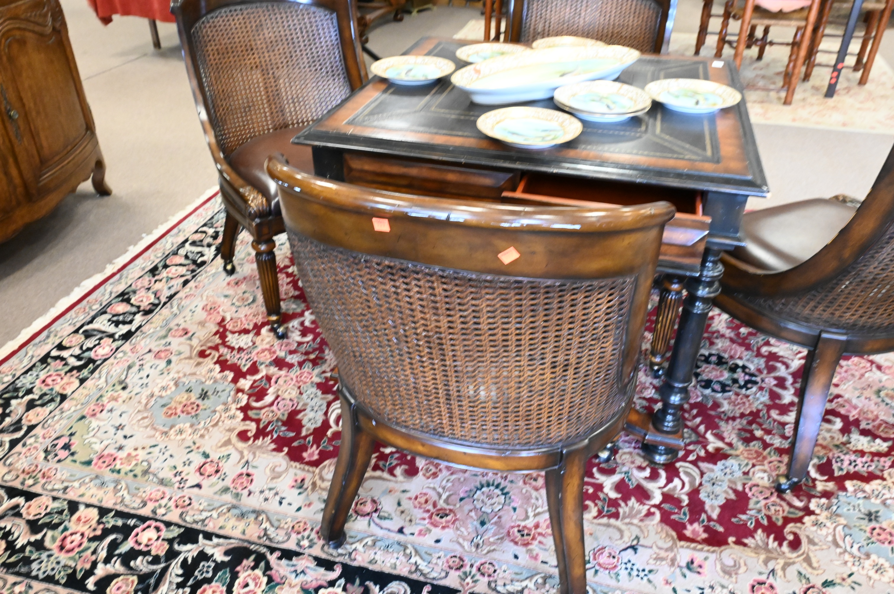 having leather top, four drawers, and swing out cup holders along with four cane back chairs