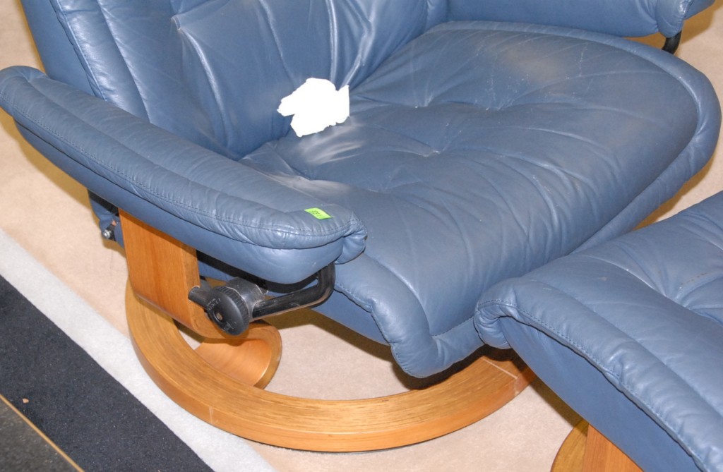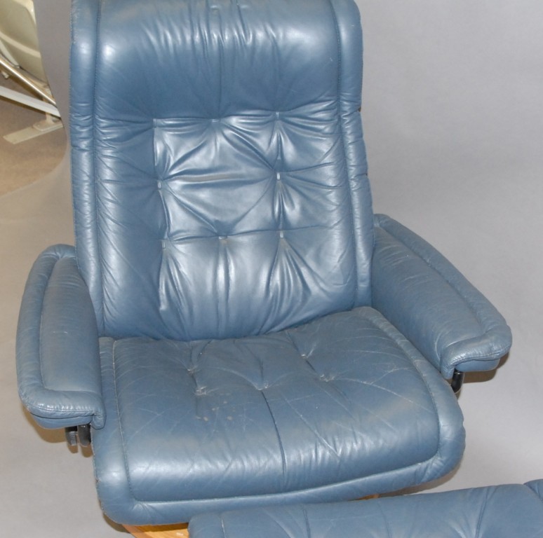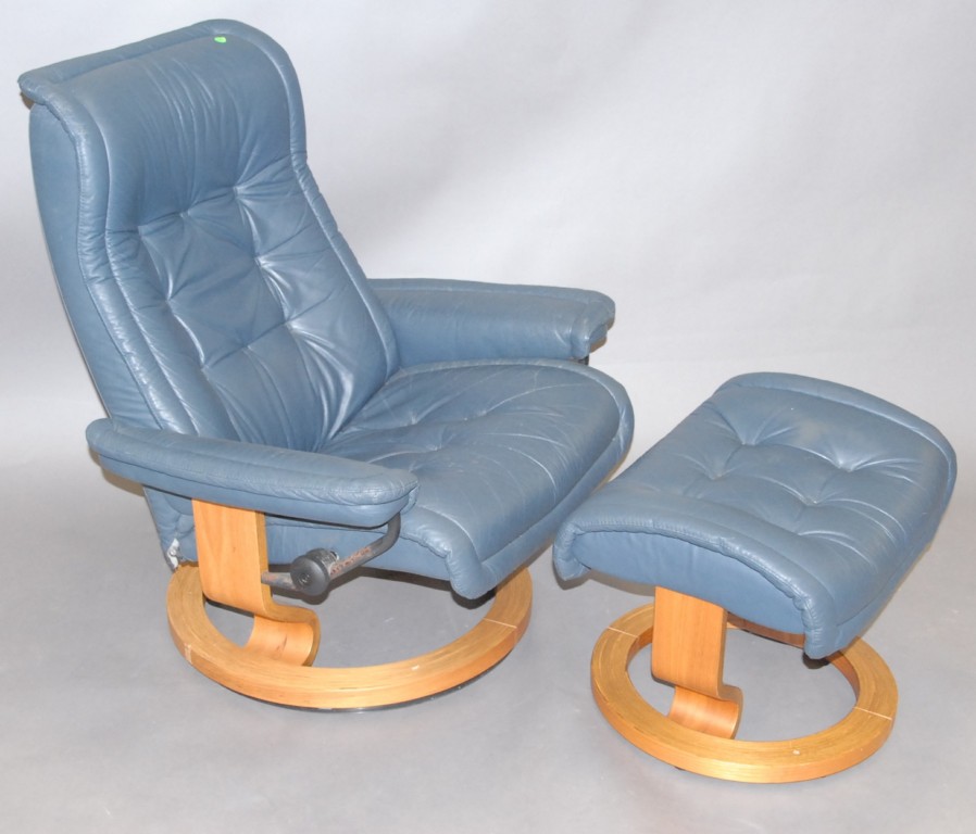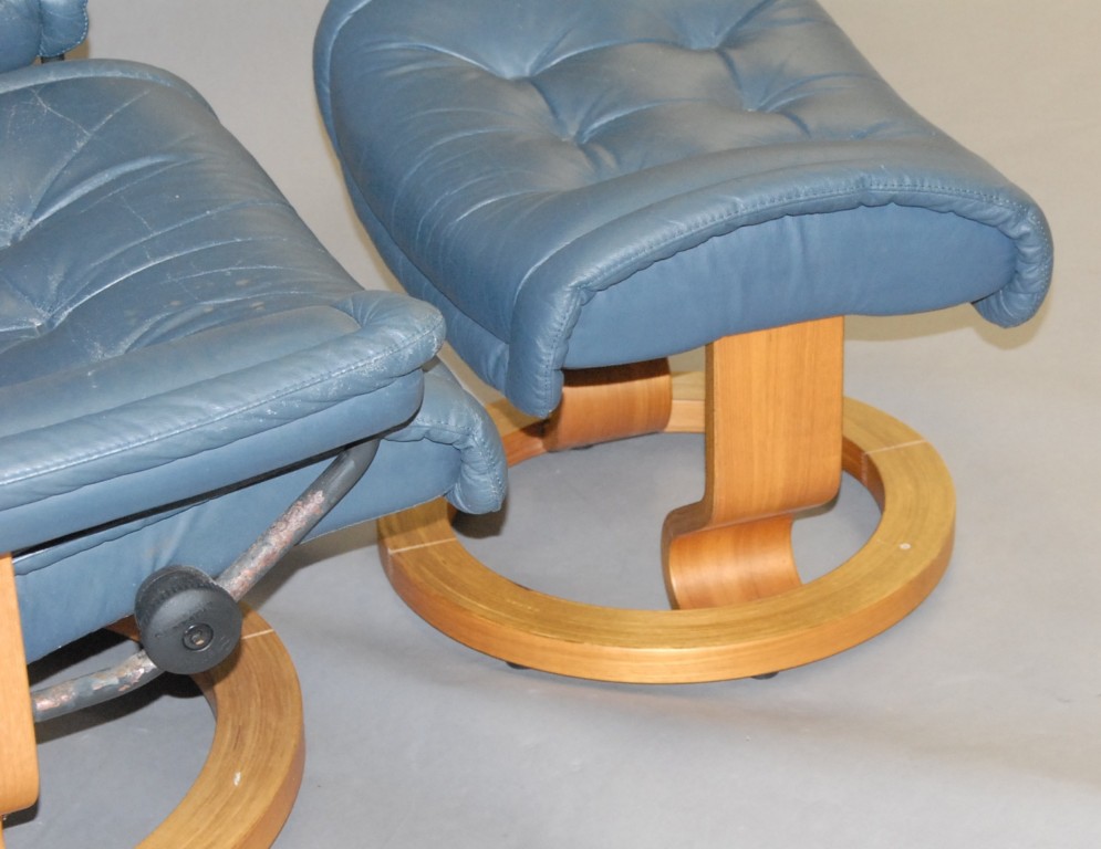 Pair of Ekornes Stressless reclining chairs in dark grey leather with ottomans to match.