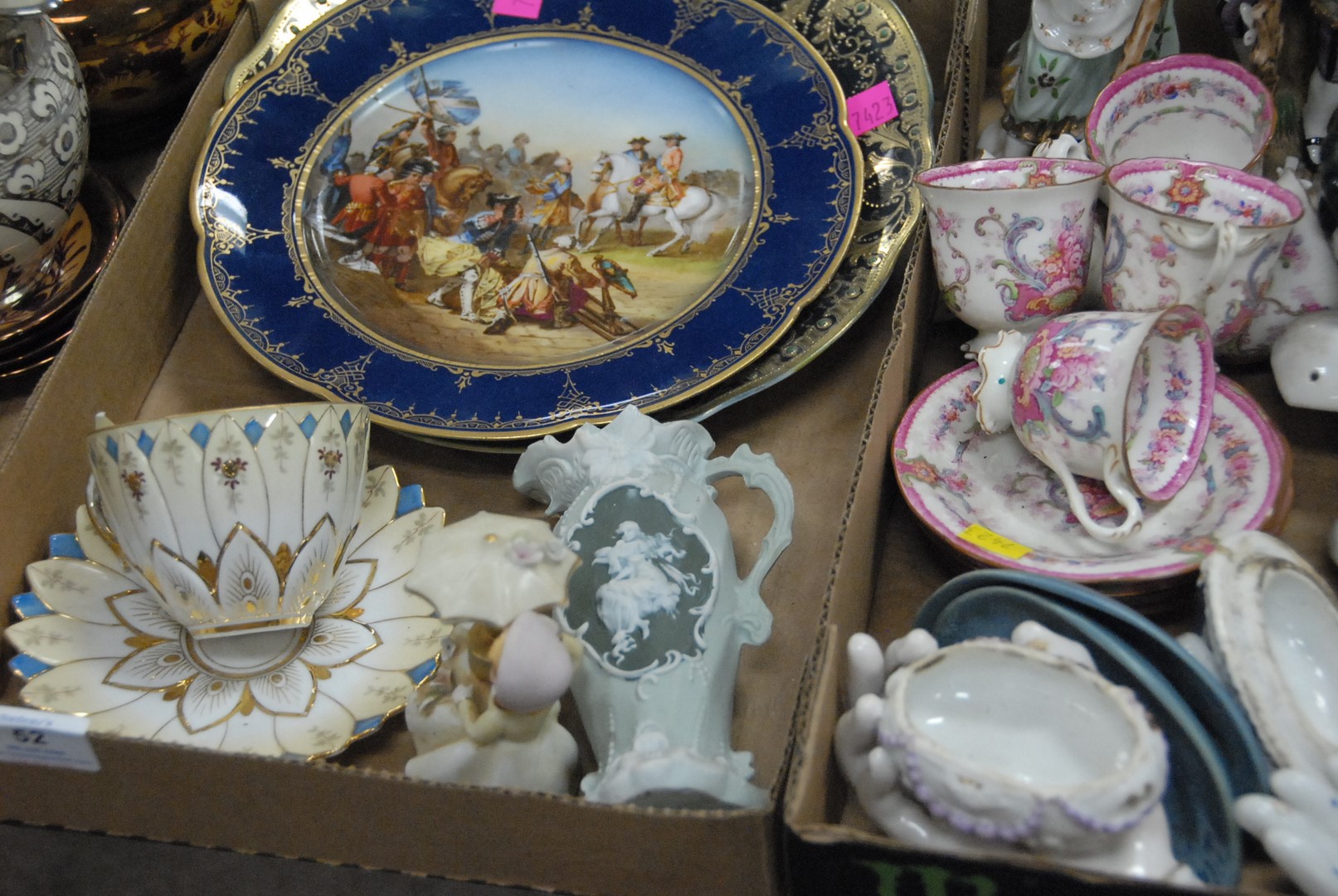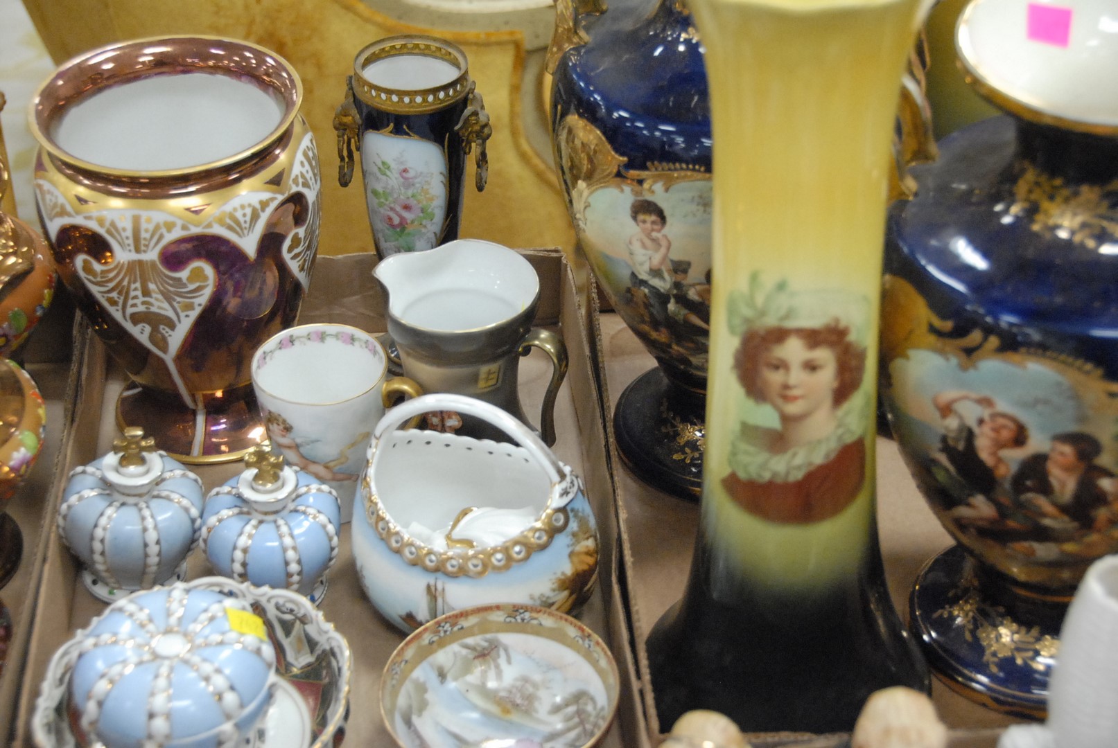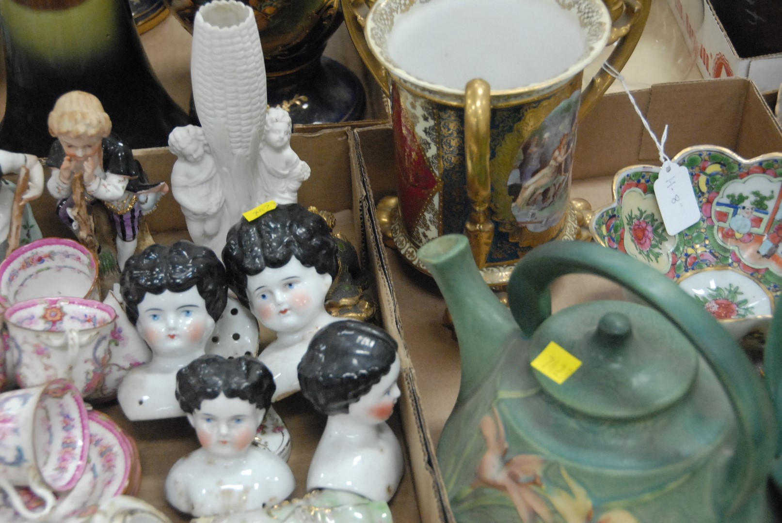 Six box lots of porcelain including two Roseville pieces, two figures, hand painted plates, pink luster vase, four doll heads, etc.