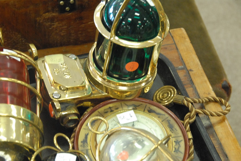 Six piece lot of brass brass and glass lights, ship’s portal, and barometer.