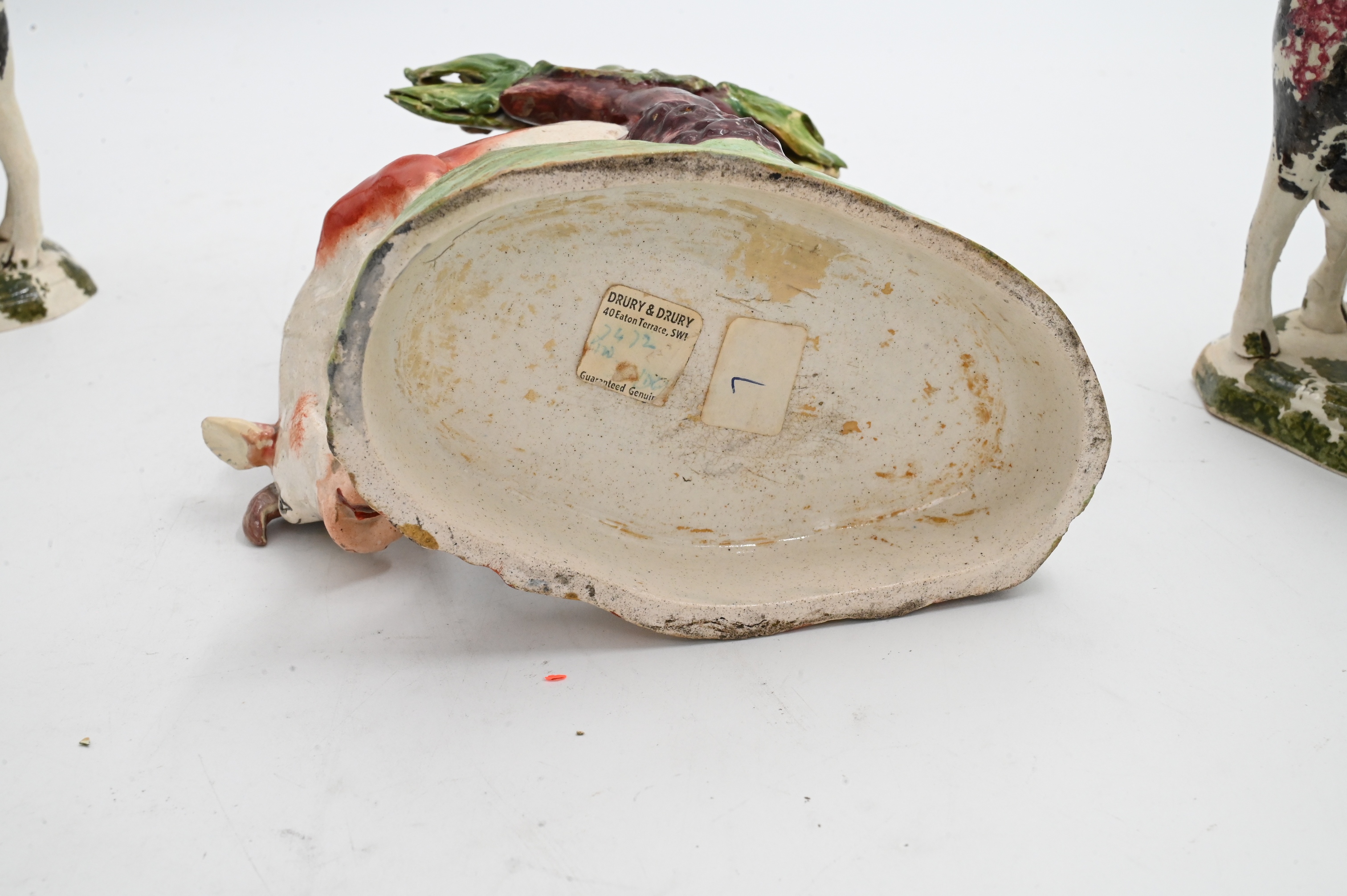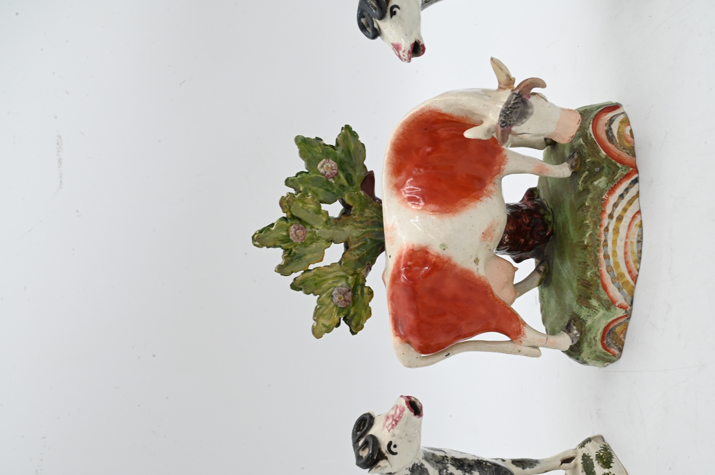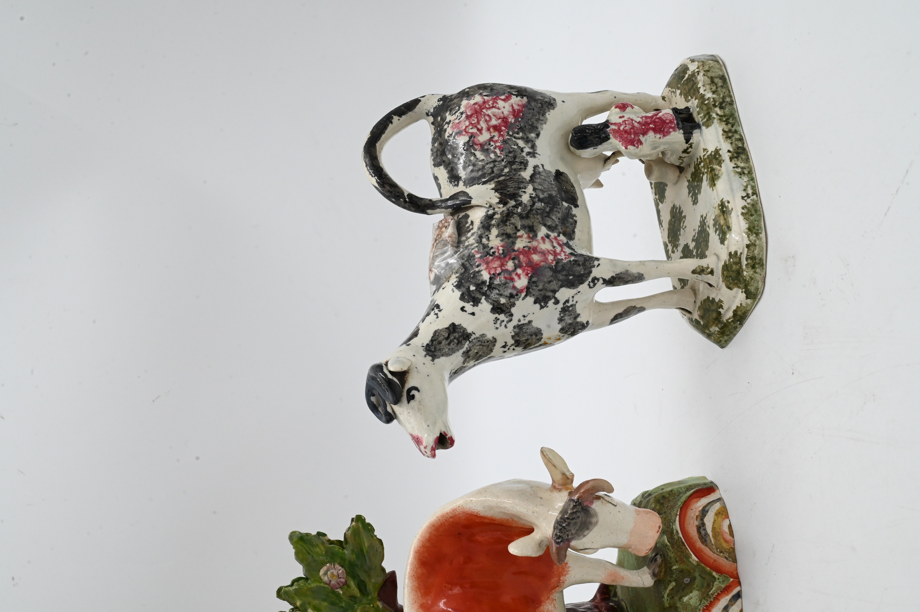 to include oaur of cow and milkmaid creamers, both black and brown spongeware, one with lid on green shaped boxes 19th century, along with attributed to Obadiah Sherratt cow in front of leaf shaped bocage with flowers on rainbow colored base Drary and Drary label