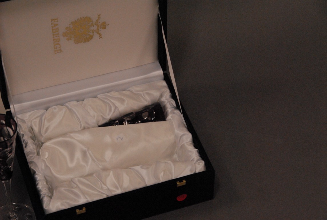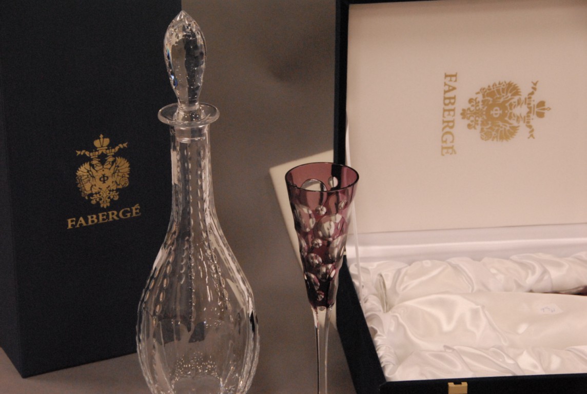 Two lots of Faberge, crystal decanter and a pair of amethyst to clear stems
