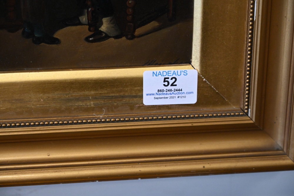 Lot 52: Two Piece Lot, to include Continental School (20th Century), Interior Scenes, oil on tin, both signed indistinctly lower right, in matching gilt frames, 7 1/2″ x 6″.