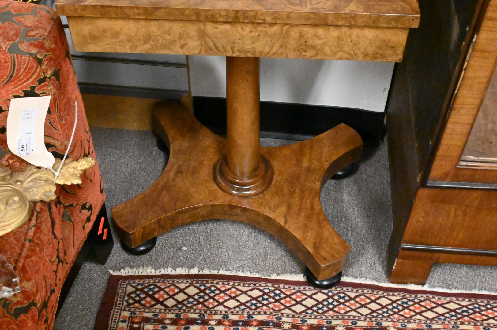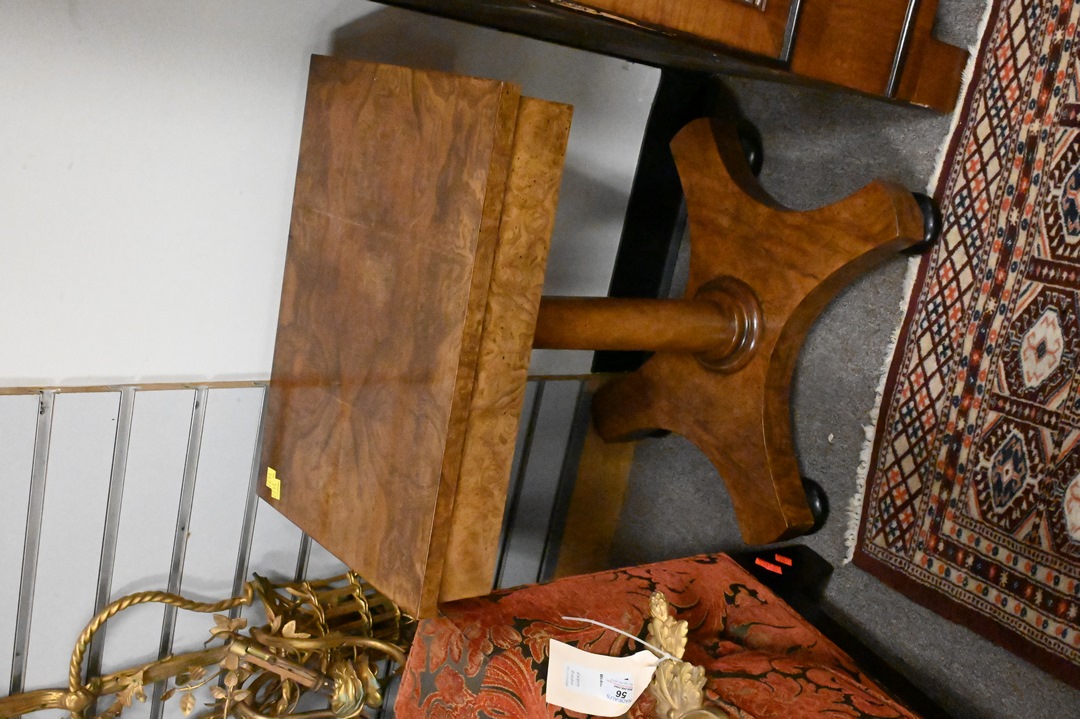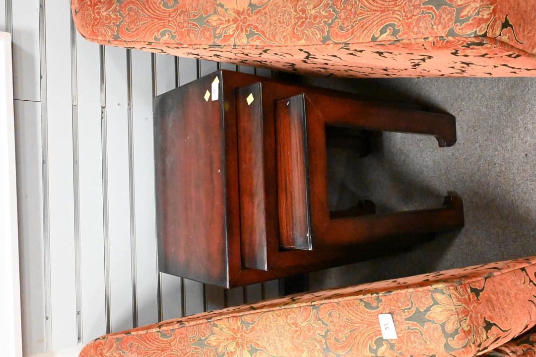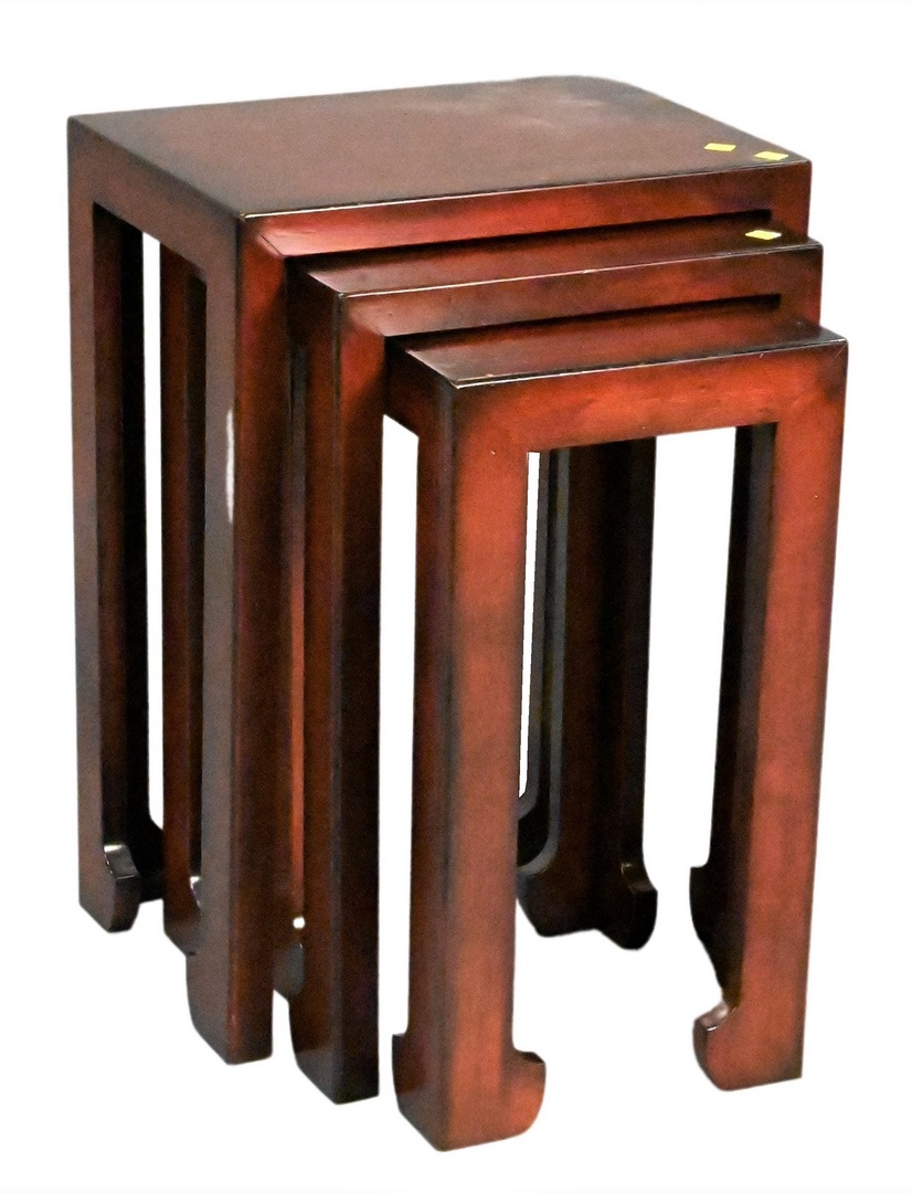 Two Piece Lot, to include a Baker burlwood stand, along with set of three stacking tables in the Chinese taste, height 25 inches.