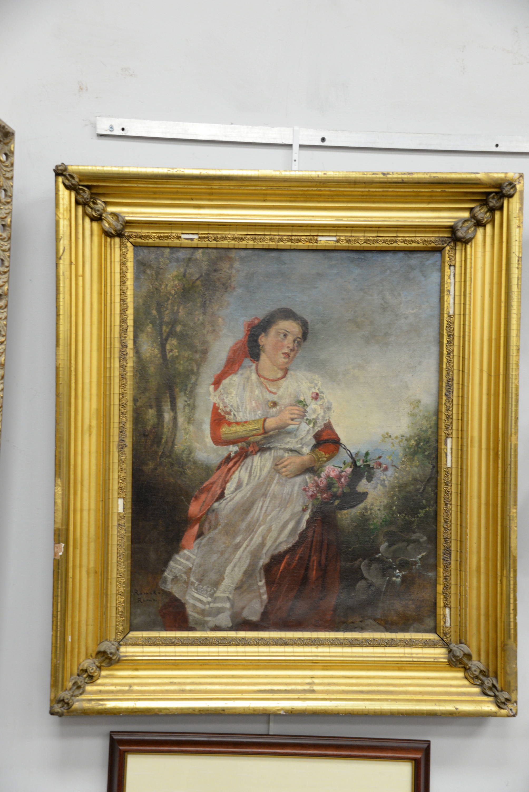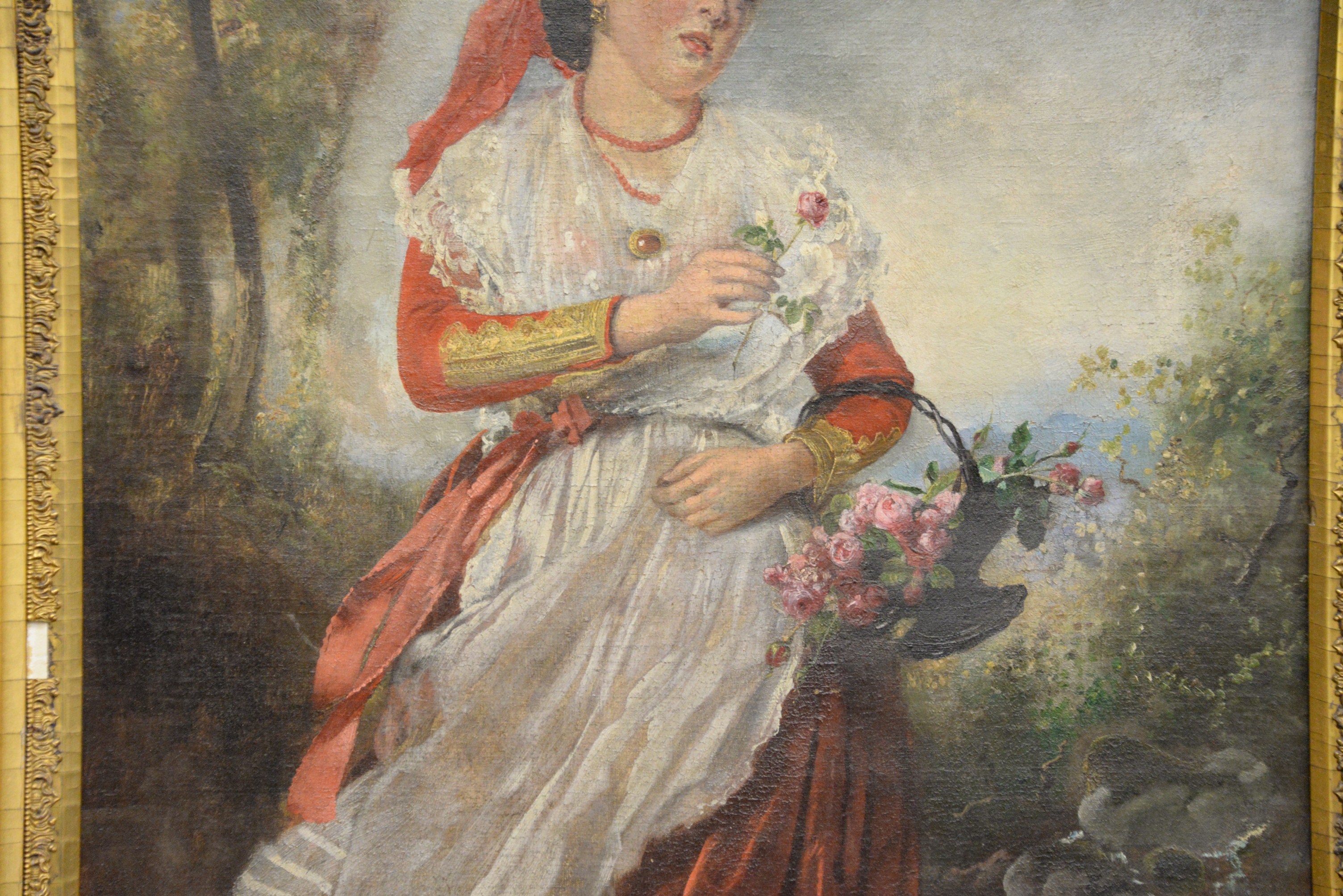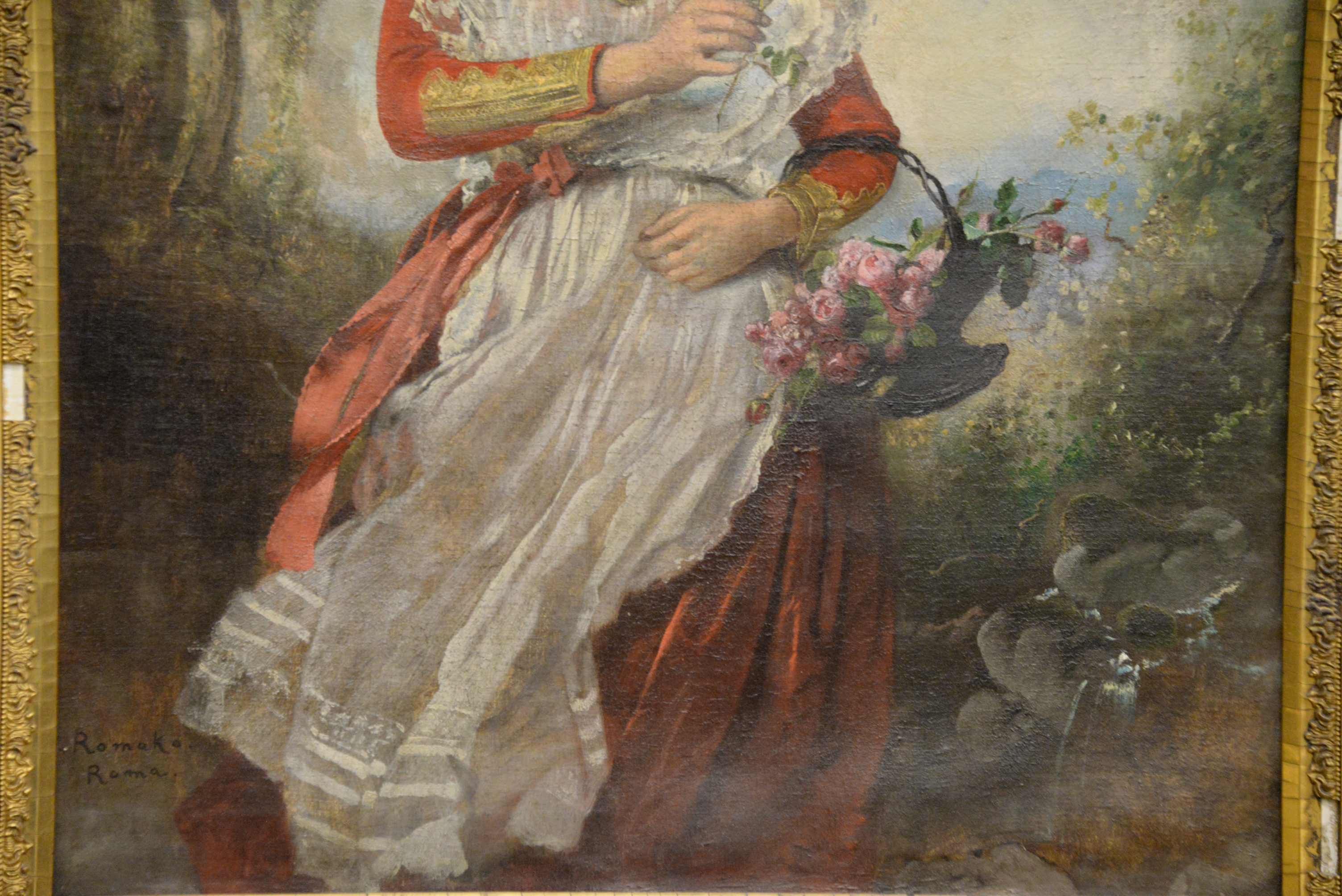 Anton Romako (Austrian 1832 – 1889) oil on canvas ” Flower Girl with Basket” signed A. Romako Roma” lower left, no date Provenance: Garfield Galleries on back, 25″ x 20″.