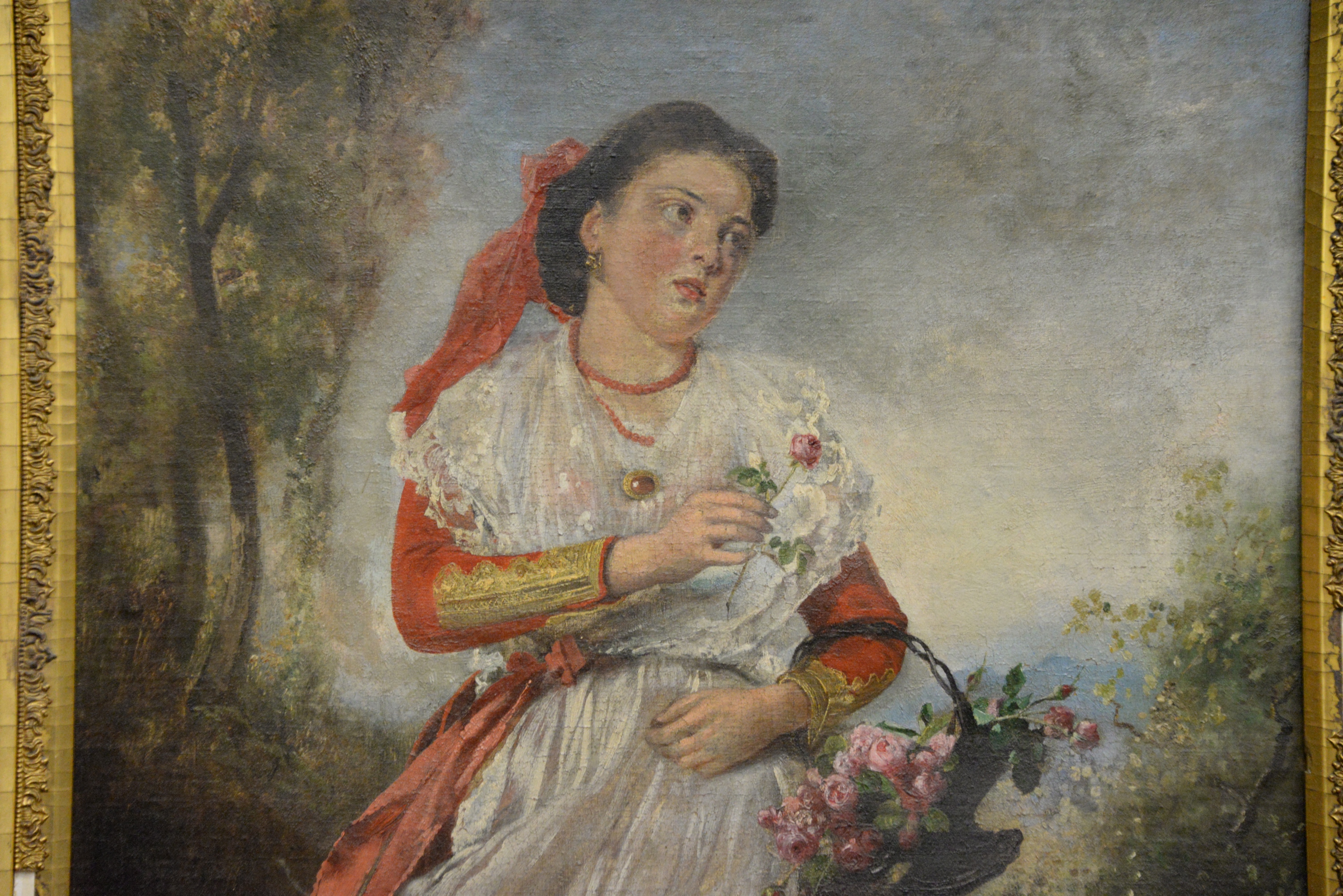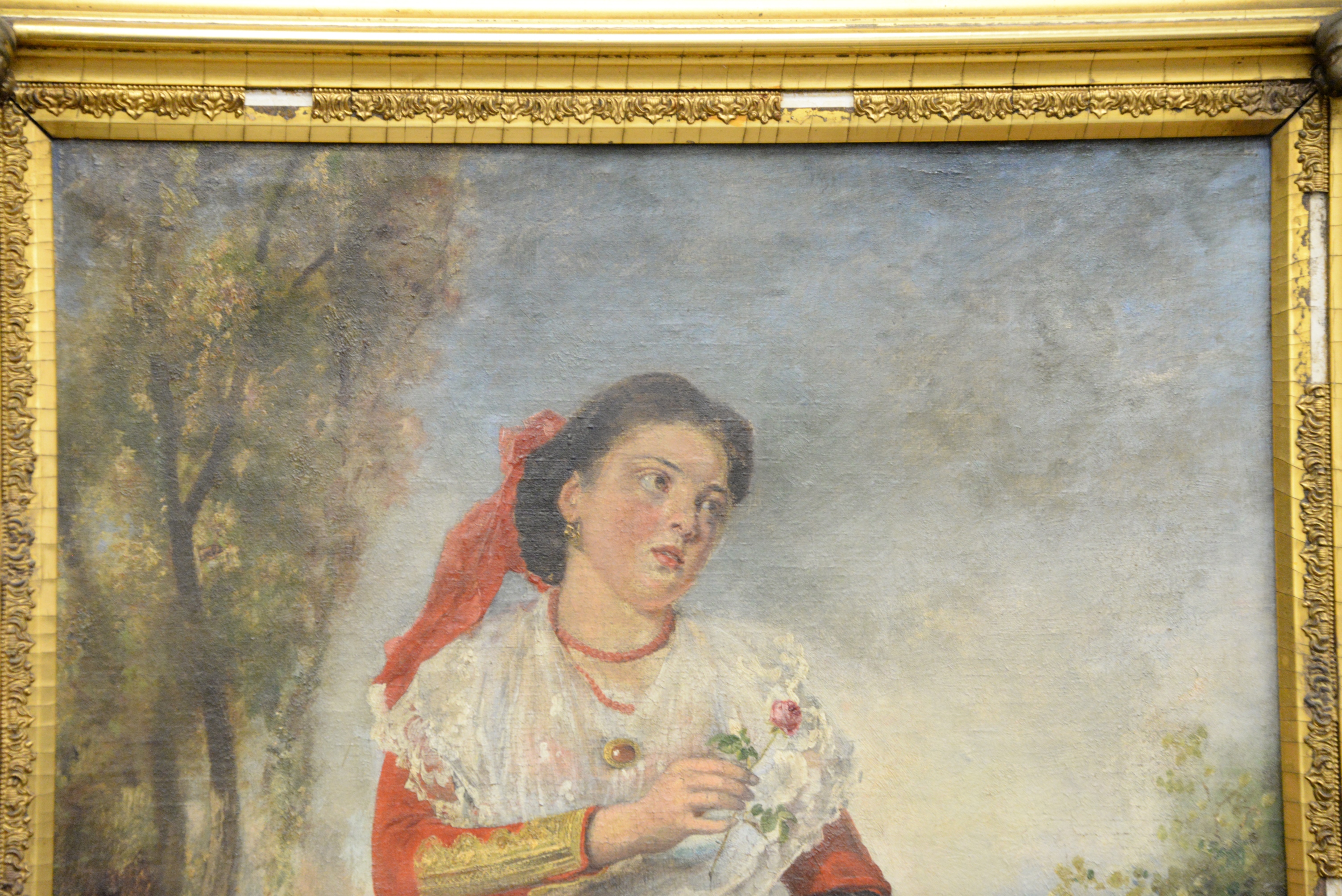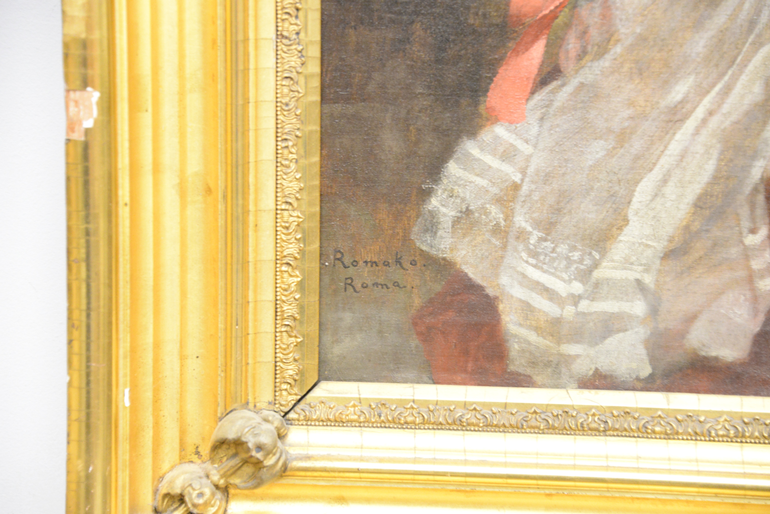 Anton Romako (Austrian 1832 – 1889) oil on canvas ” Flower Girl with Basket” signed A. Romako Roma” lower left, no date Provenance: Garfield Galleries on back, 25″ x 20″.