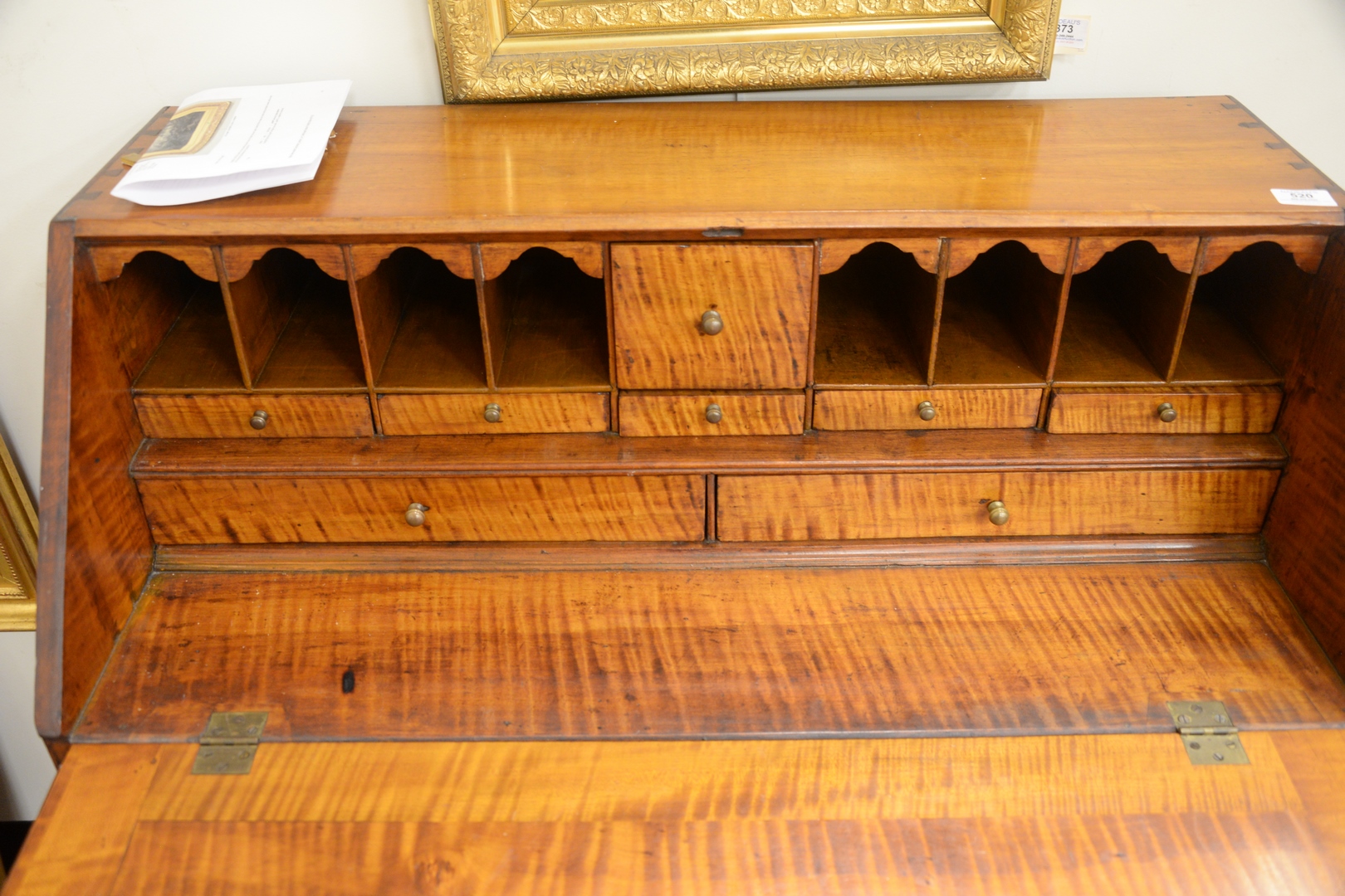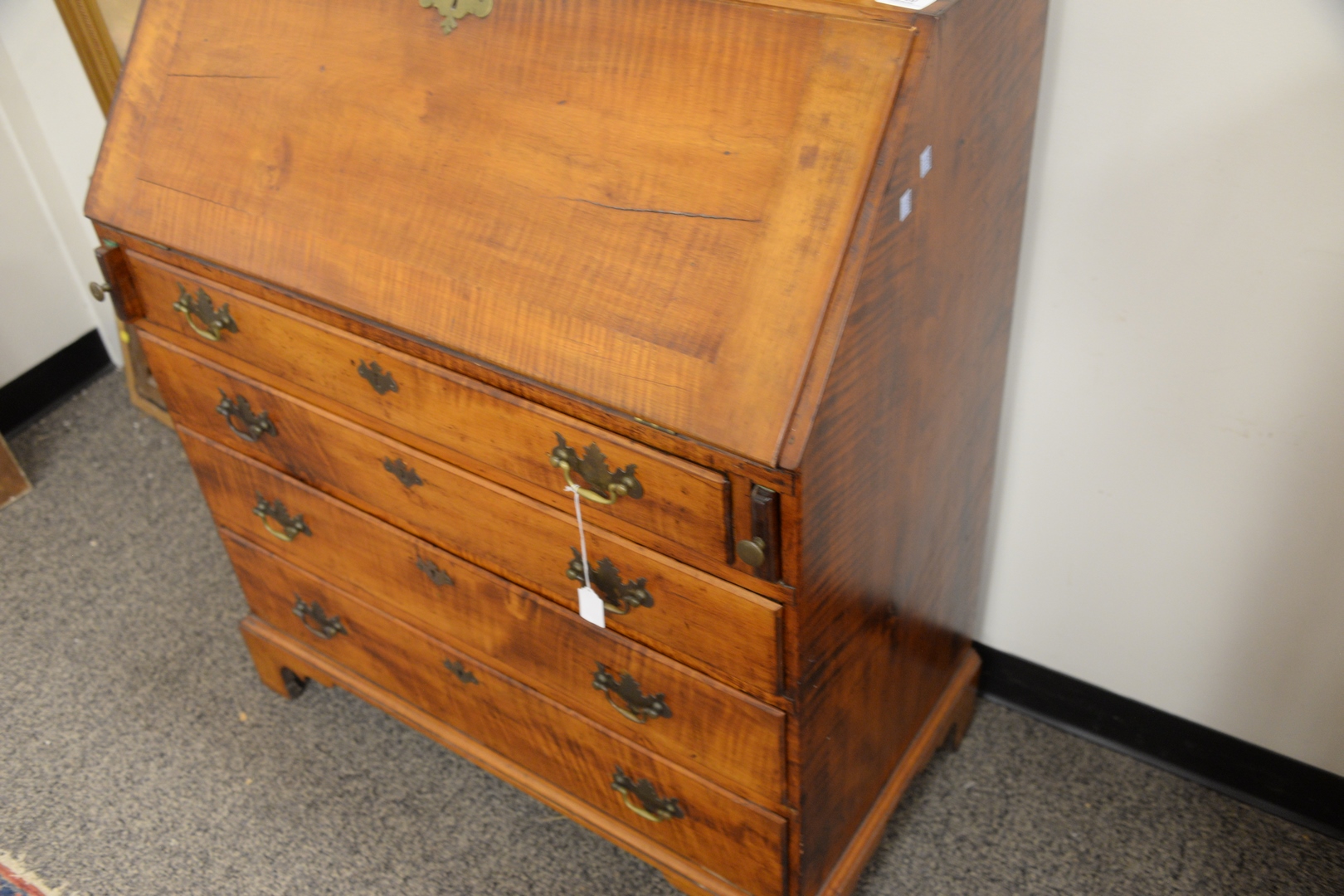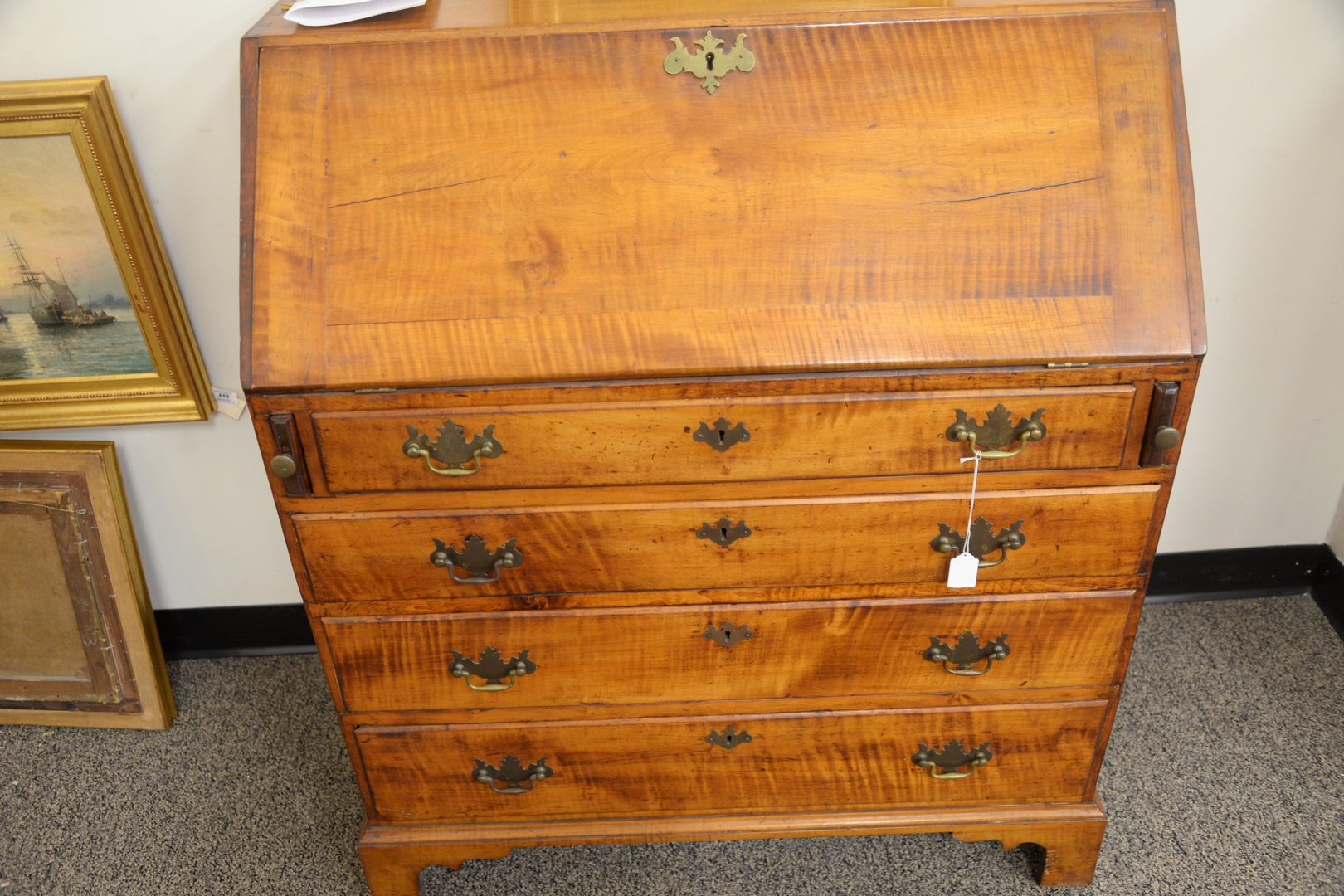 Lot 520: Chippendale Tiger Maple Desk, having slant front over four drawers on bracket base, interior with drawers and pigeon holes, circa 1760, height 41 1/2 inches, width 35 1/2 inches. Provenance: From a Glastonbury, Connecticut Collection.