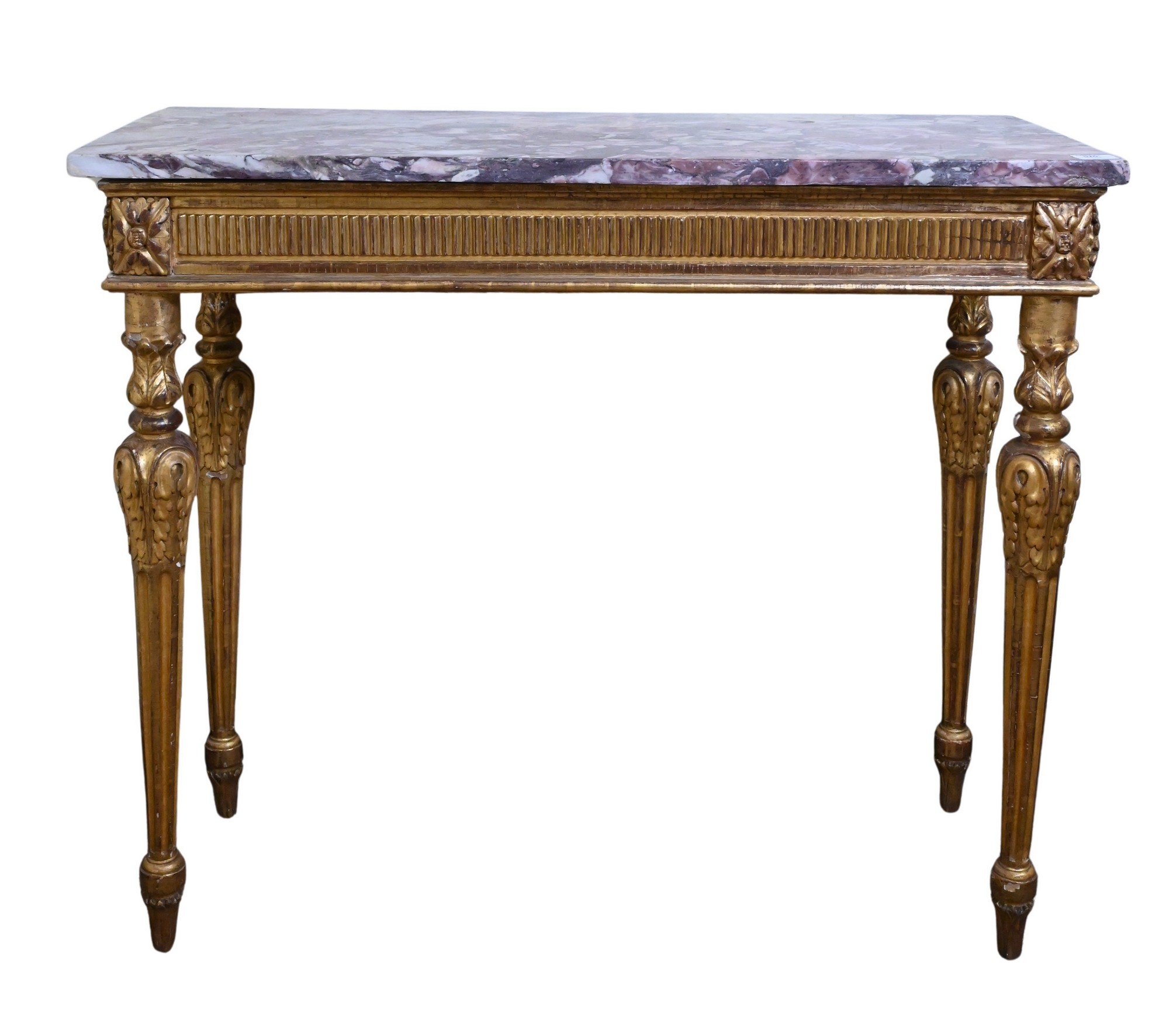 marble rouge top over ornate gilt wood carved base featuring acanthus leaf and fluted tapering legs, unbalanced due to poor repair job