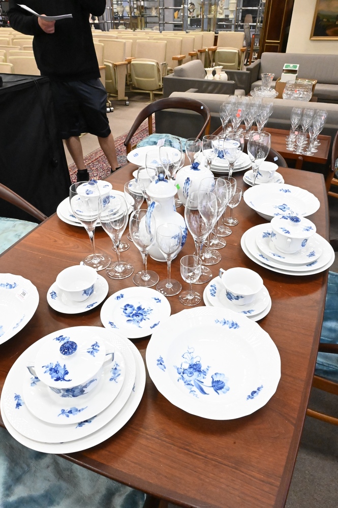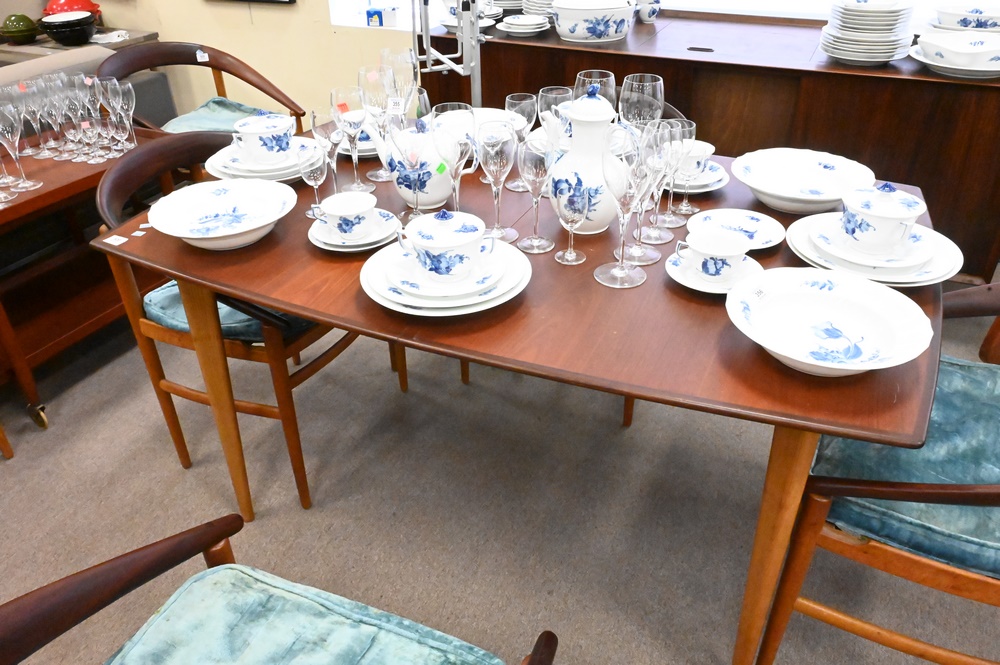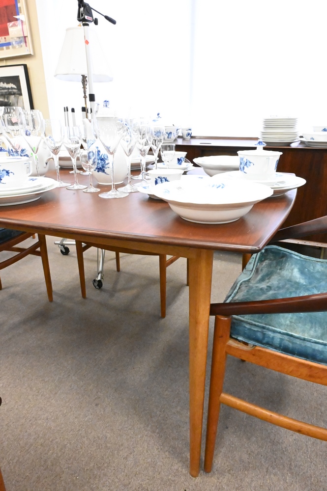 Lot 520: Mid Century Teak Dining Table, having two 13 1/2″ leaves, opens to 35″ x 80″, closed 35″ x 53″, height 28 inches.