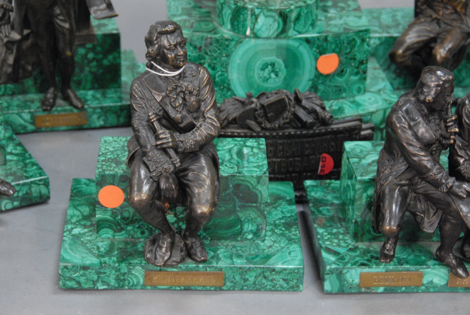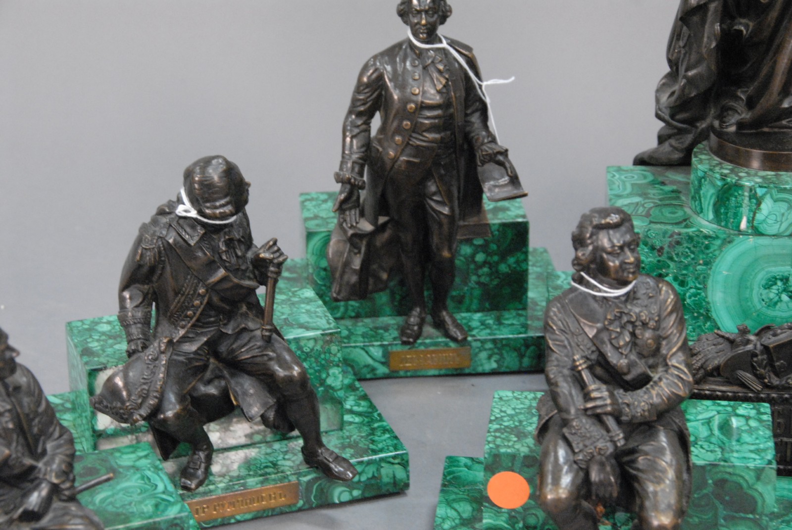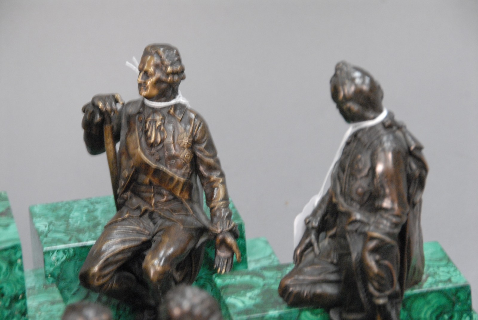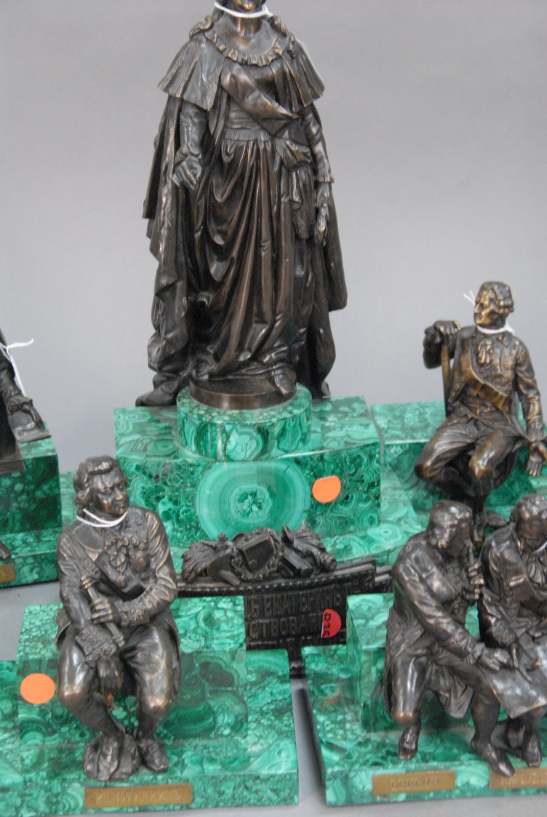 Nine bronze figures all on malachite overlay on marble bases, Catherine the Great and her court.