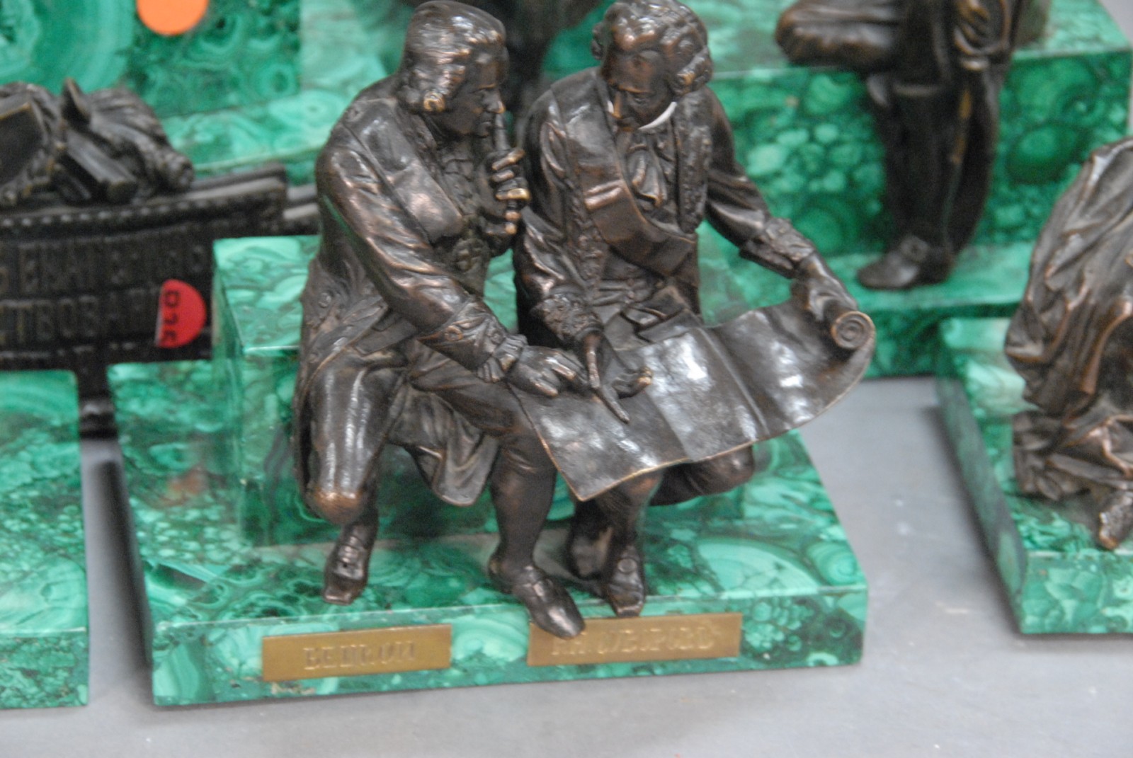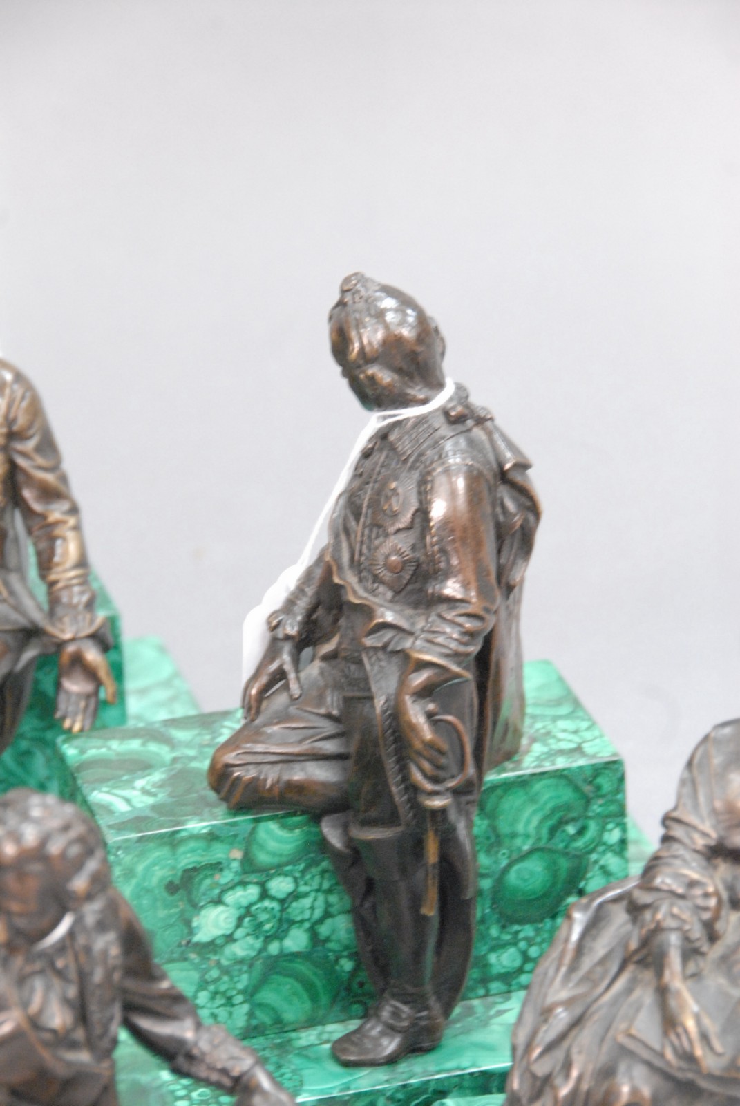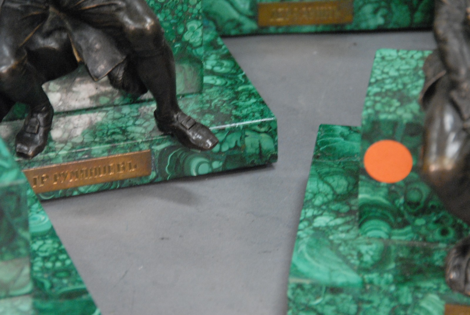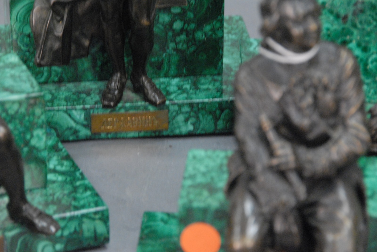 Nine bronze figures all on malachite overlay on marble bases, Catherine the Great and her court.