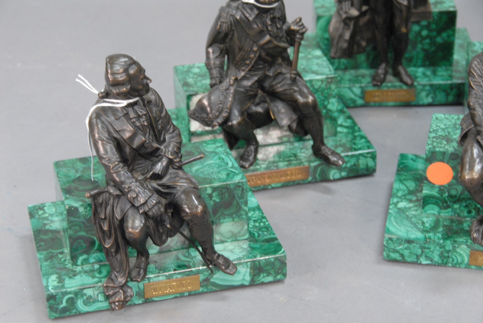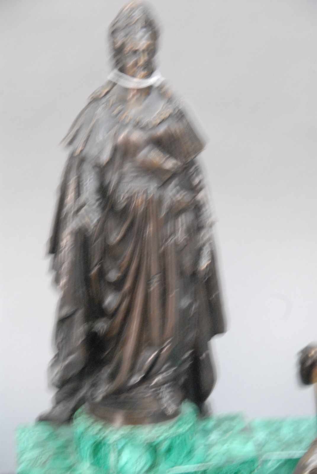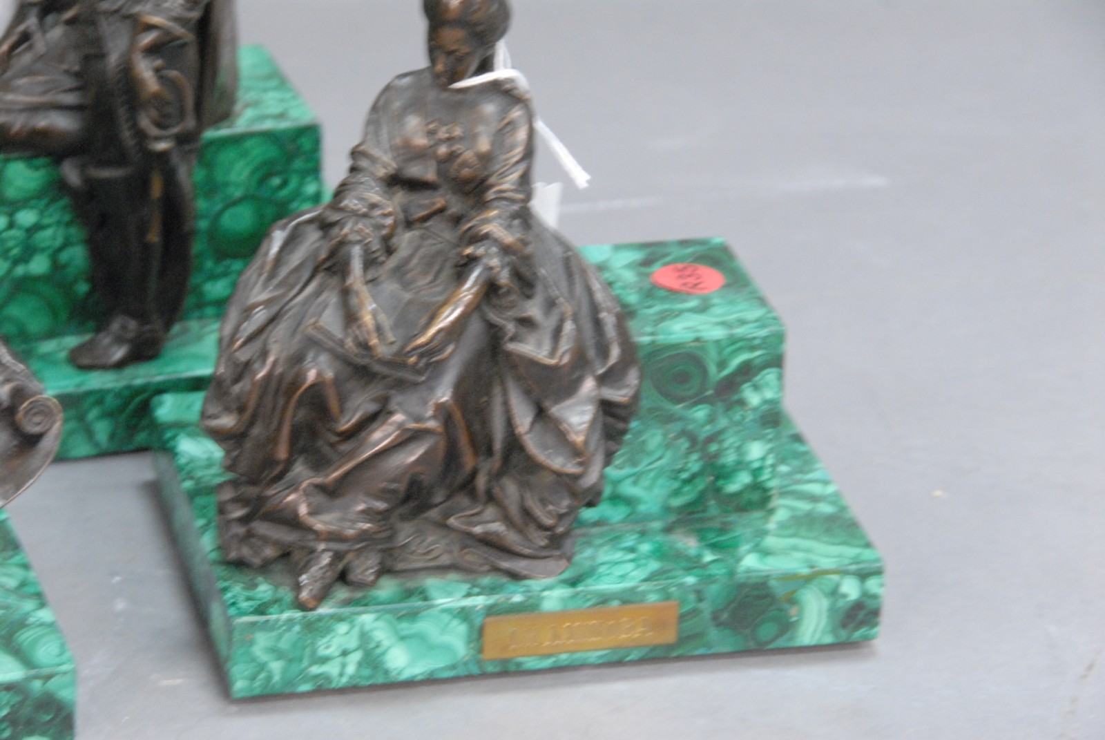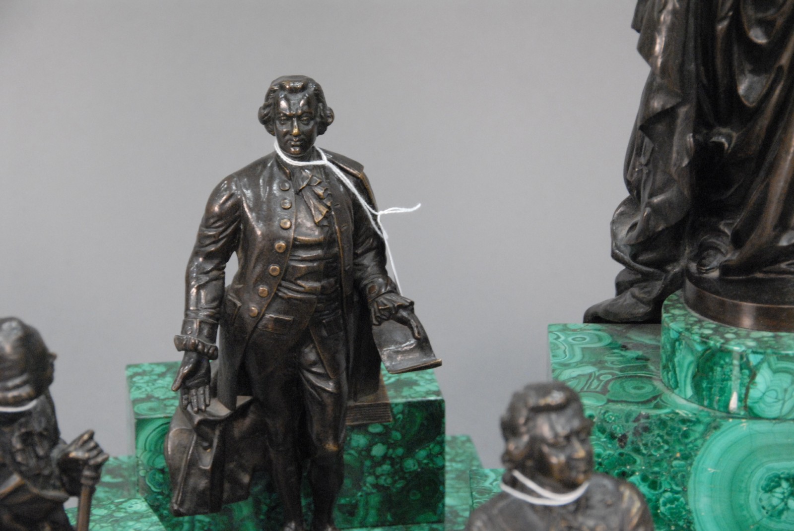 Nine bronze figures all on malachite overlay on marble bases, Catherine the Great and her court.