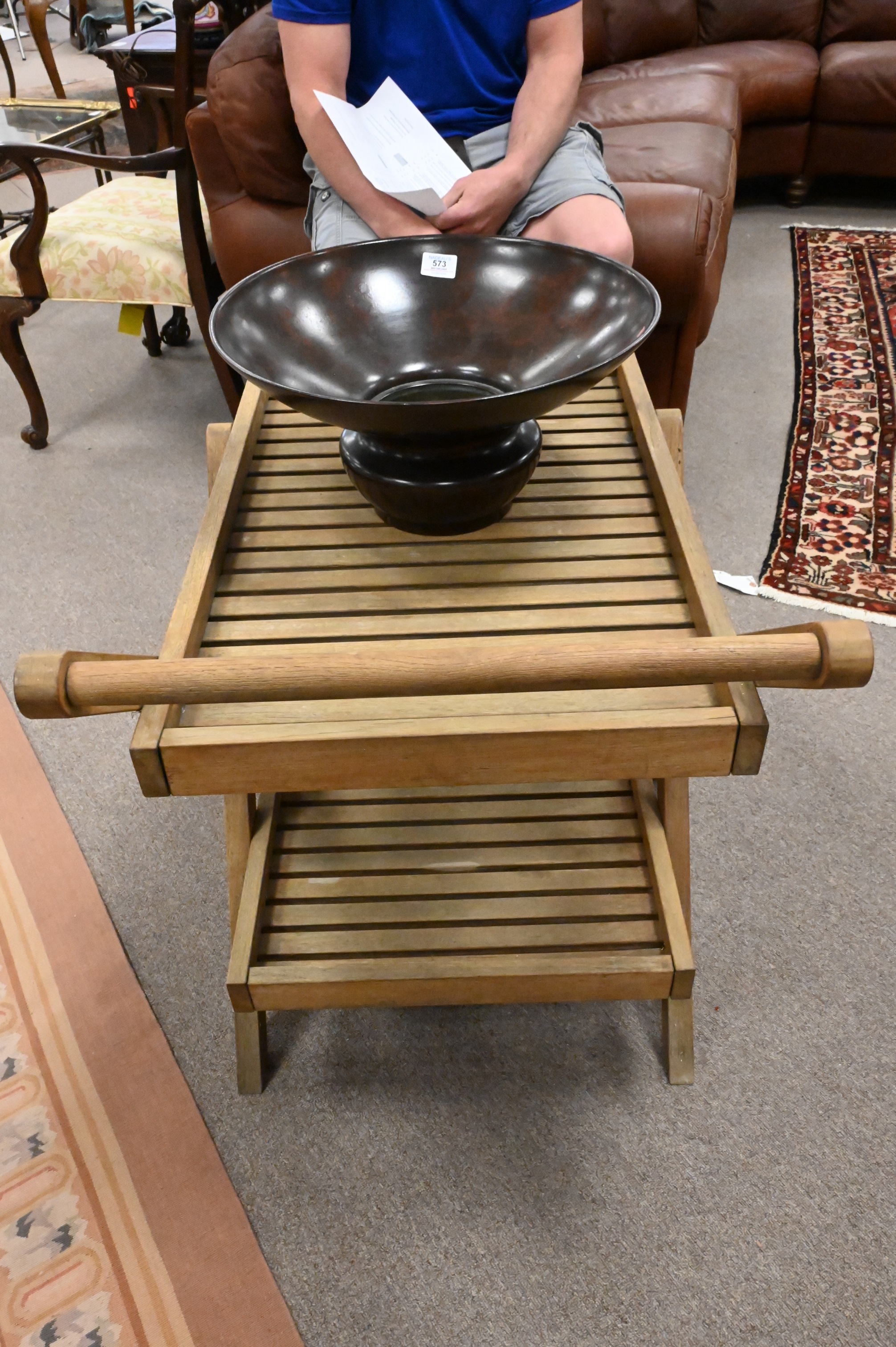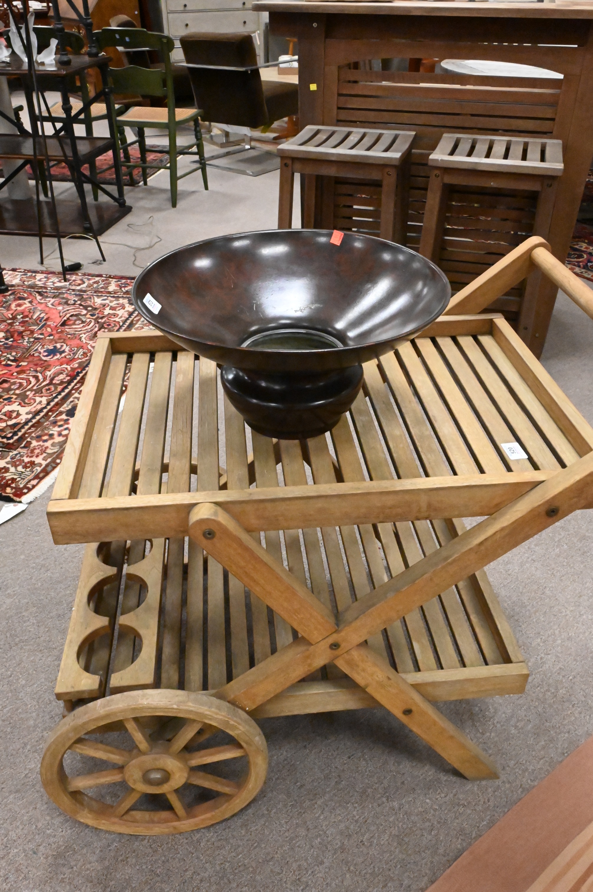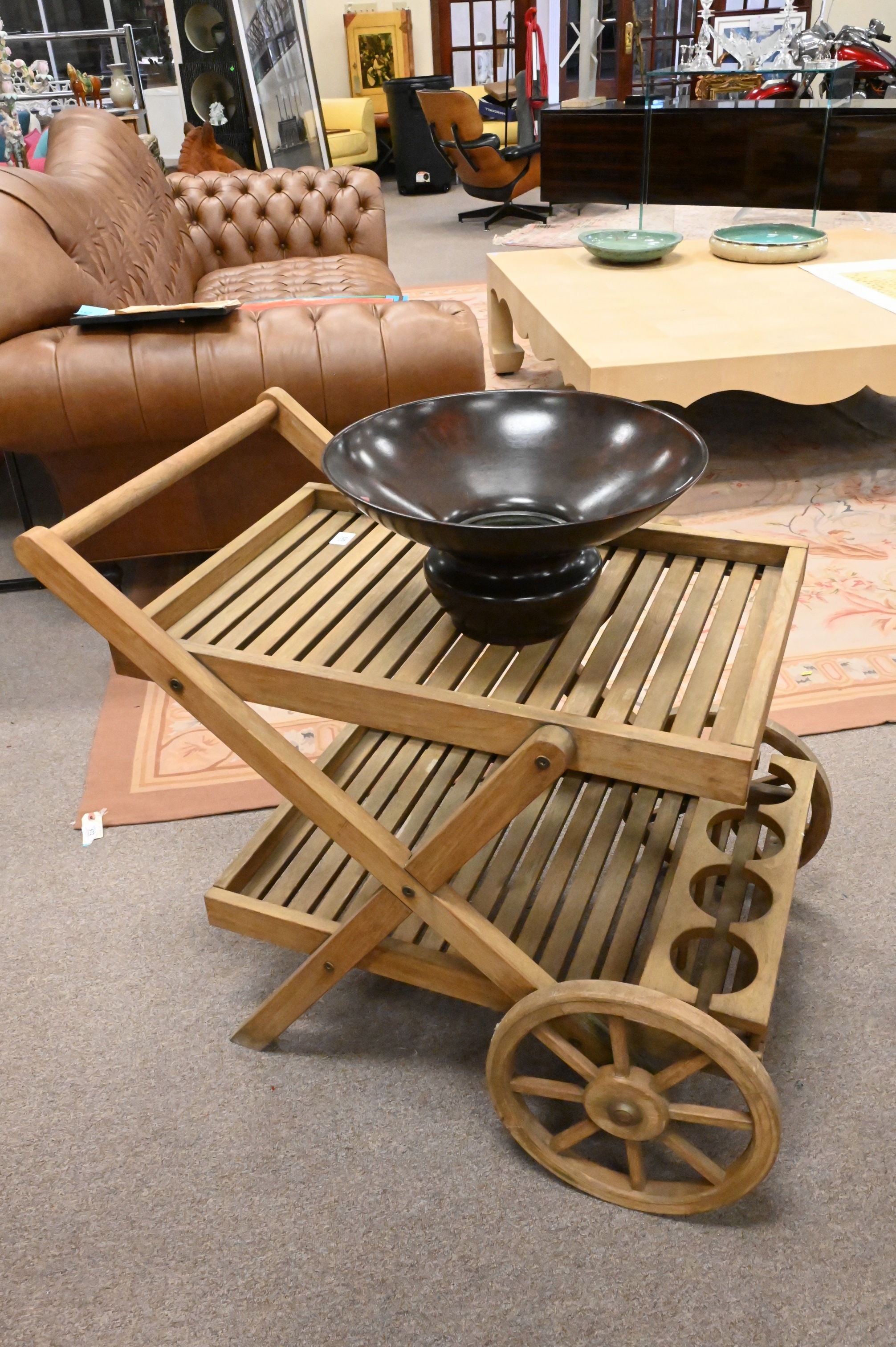 Outdoor Teak Bar Cart, having two tiers and bottle holders, height 30 1/2 inches, top 29″ x 19 1/2″