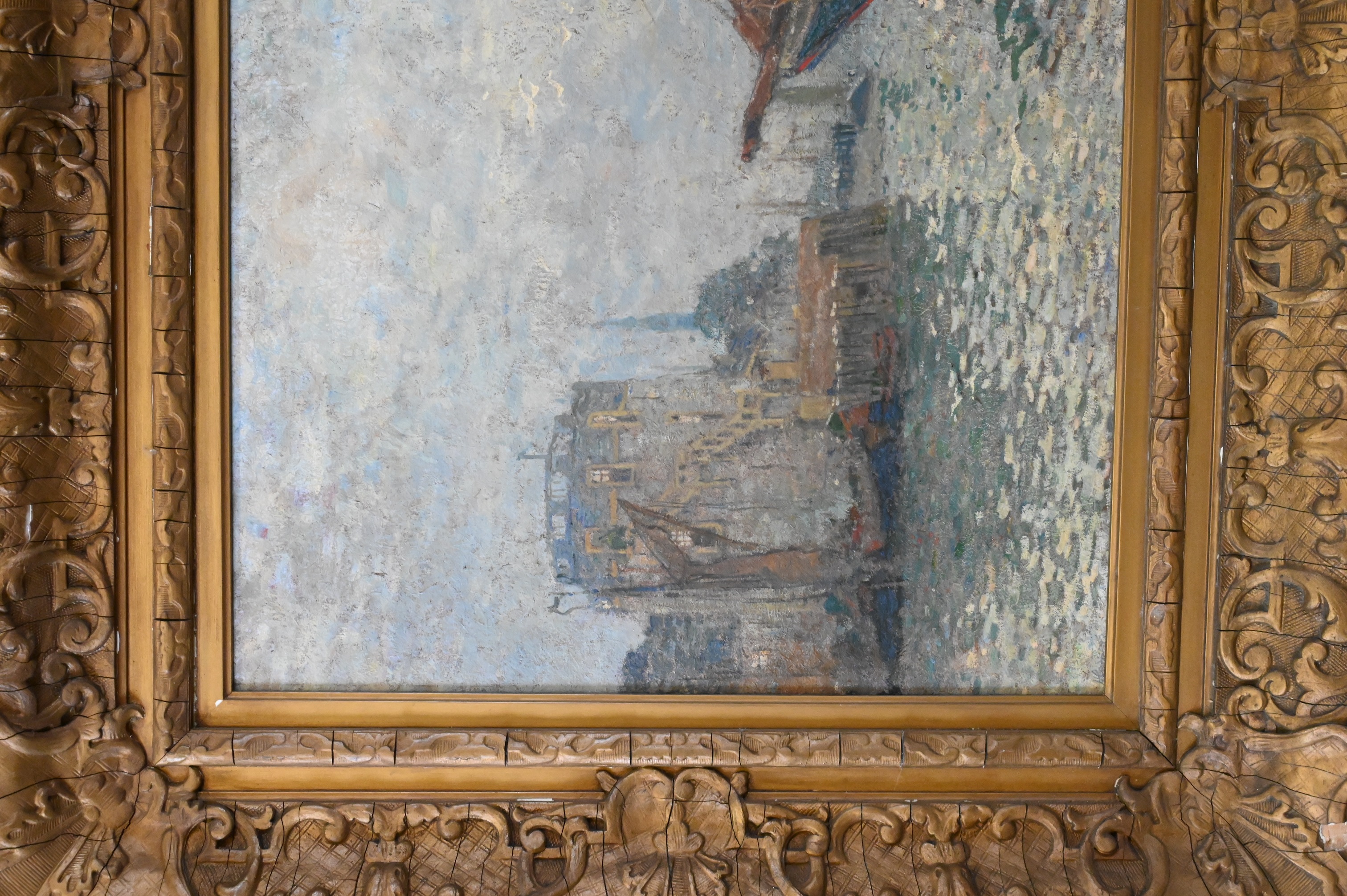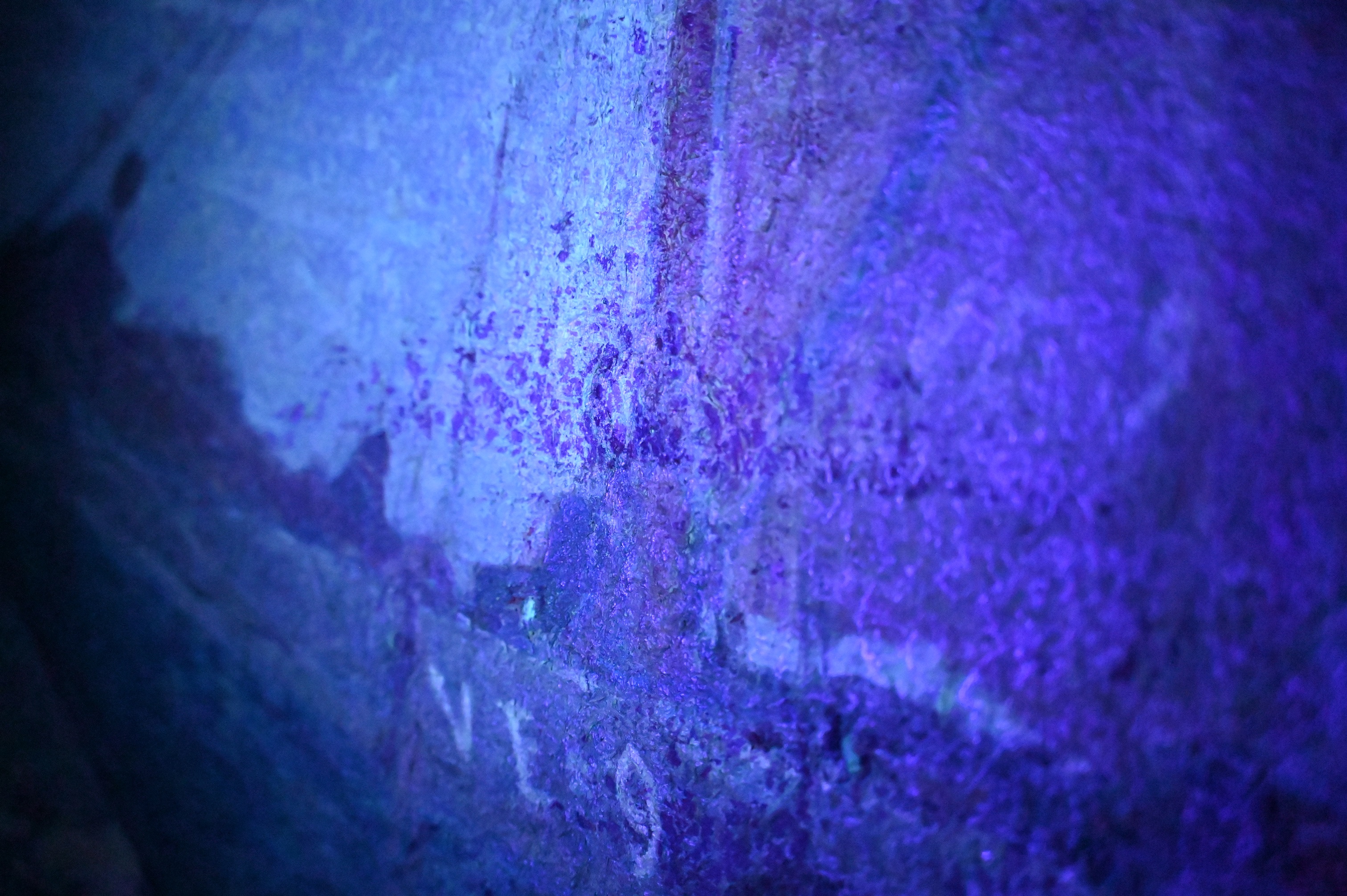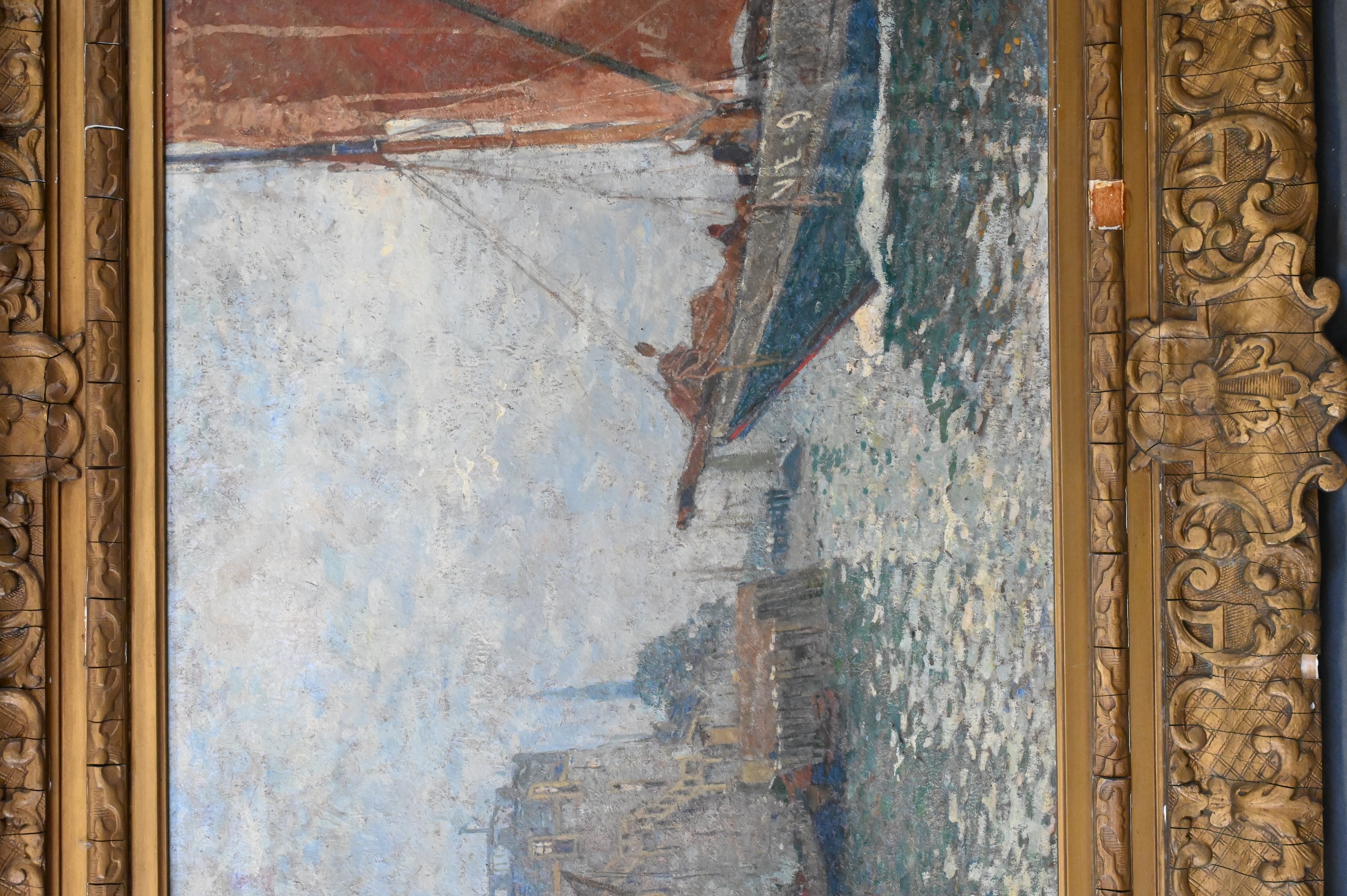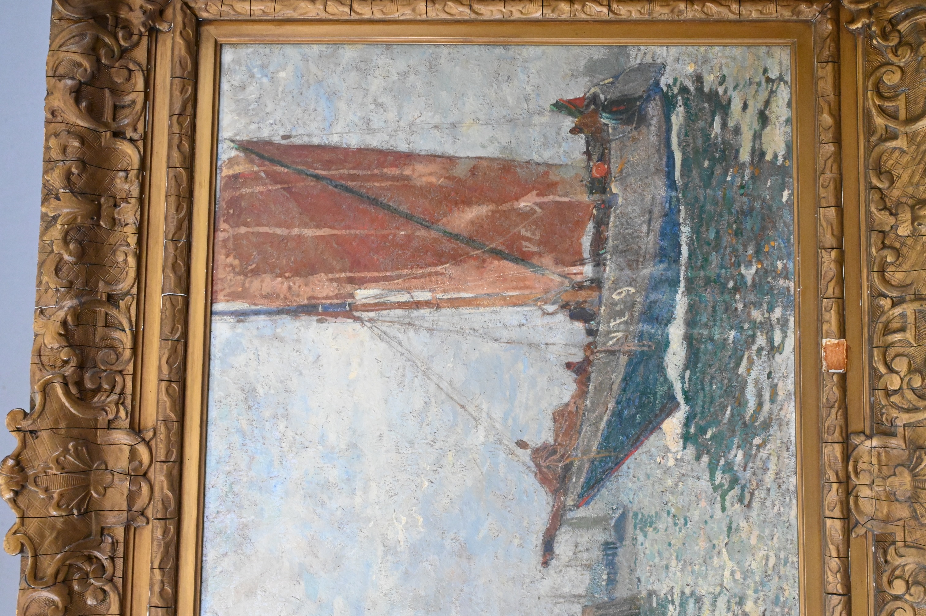 Condition: craquelure from impasto, heavy inpainting to sky, some inpainting to boat, drip marks covering boat, surface grime