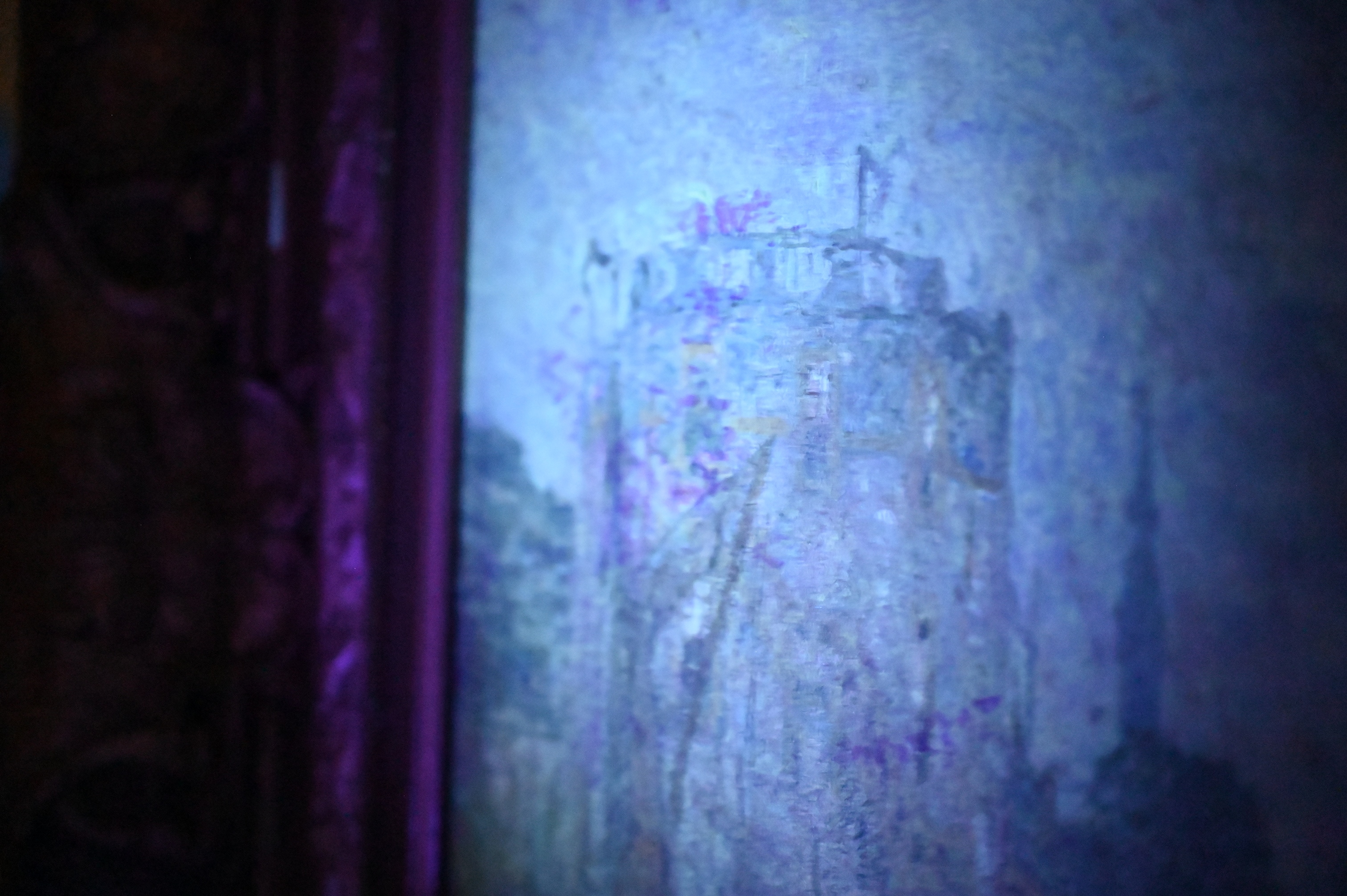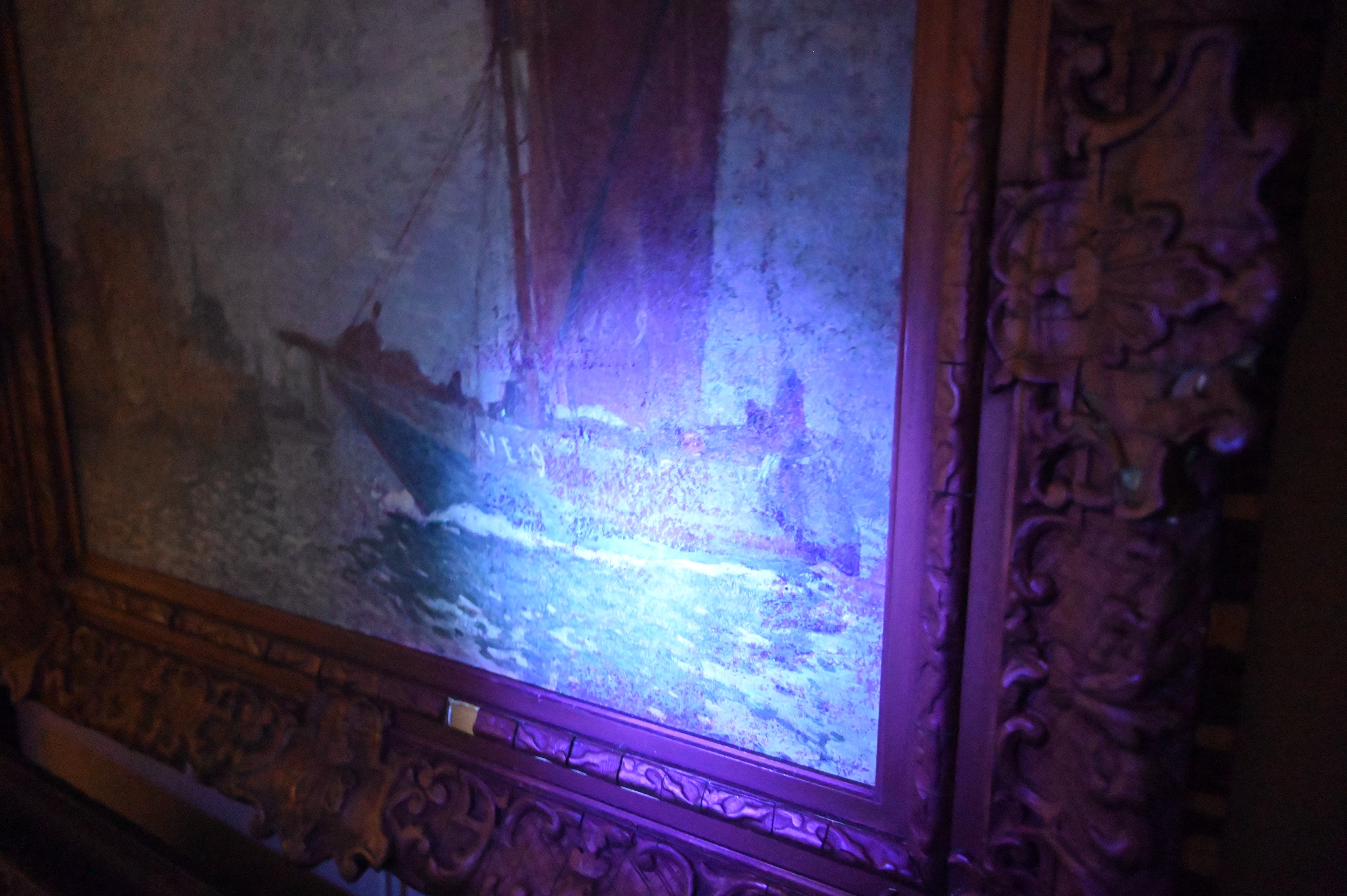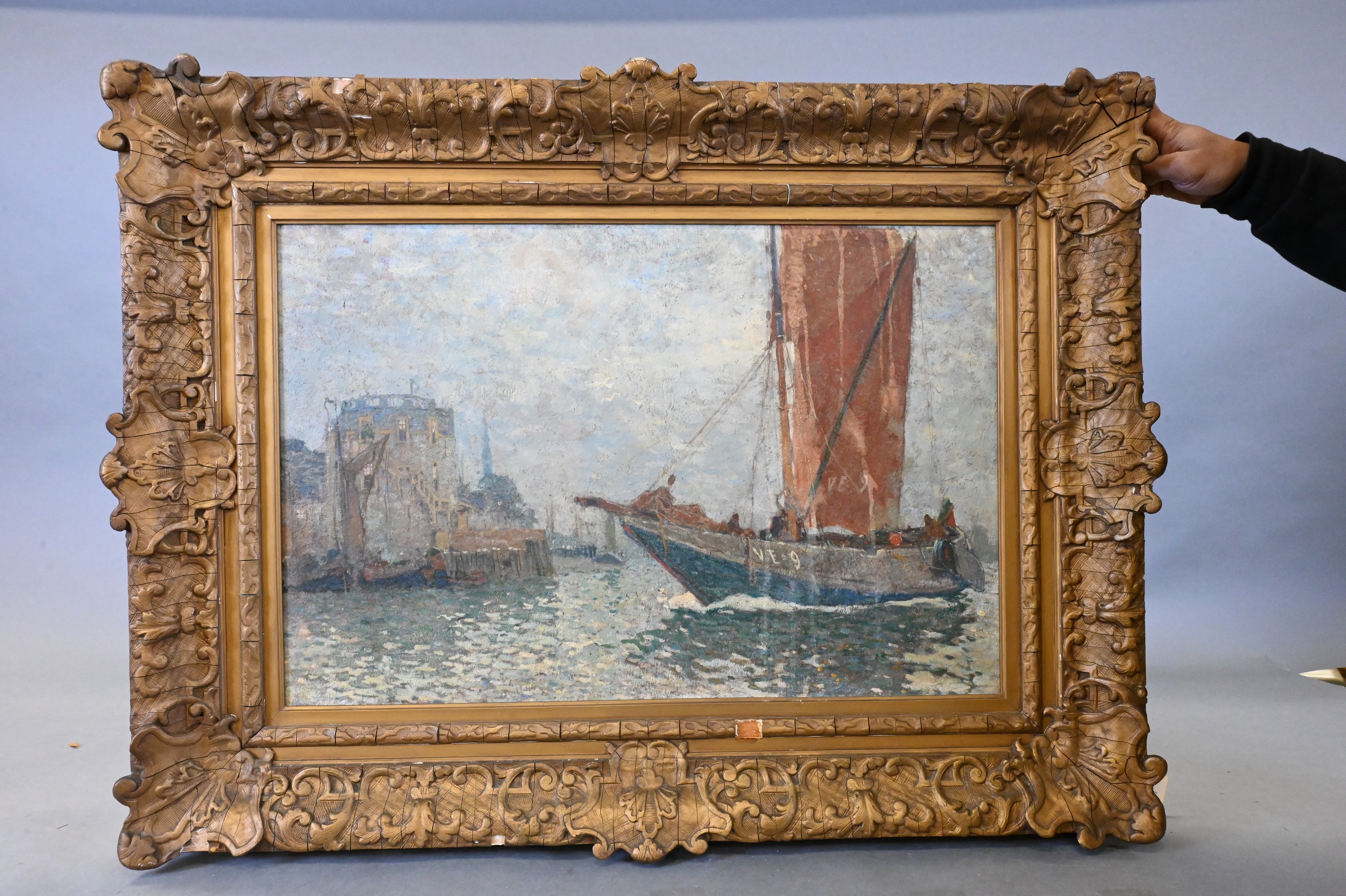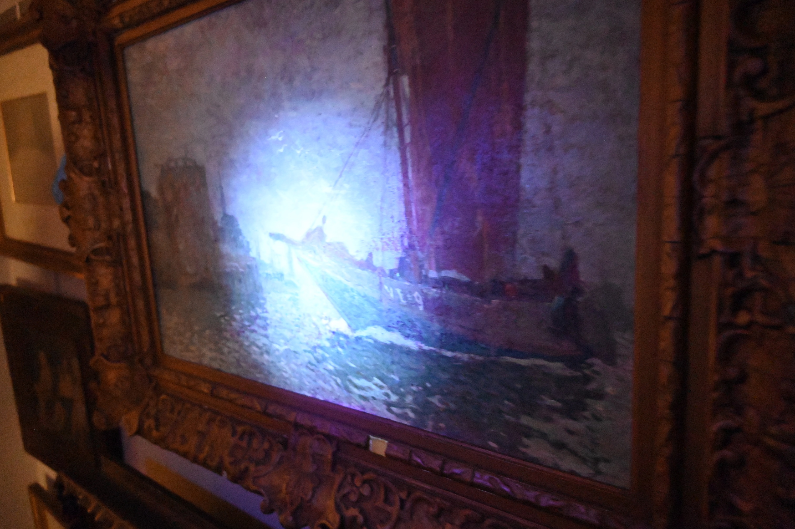 Condition: craquelure from impasto, heavy inpainting to sky, some inpainting to boat, drip marks covering boat, surface grime