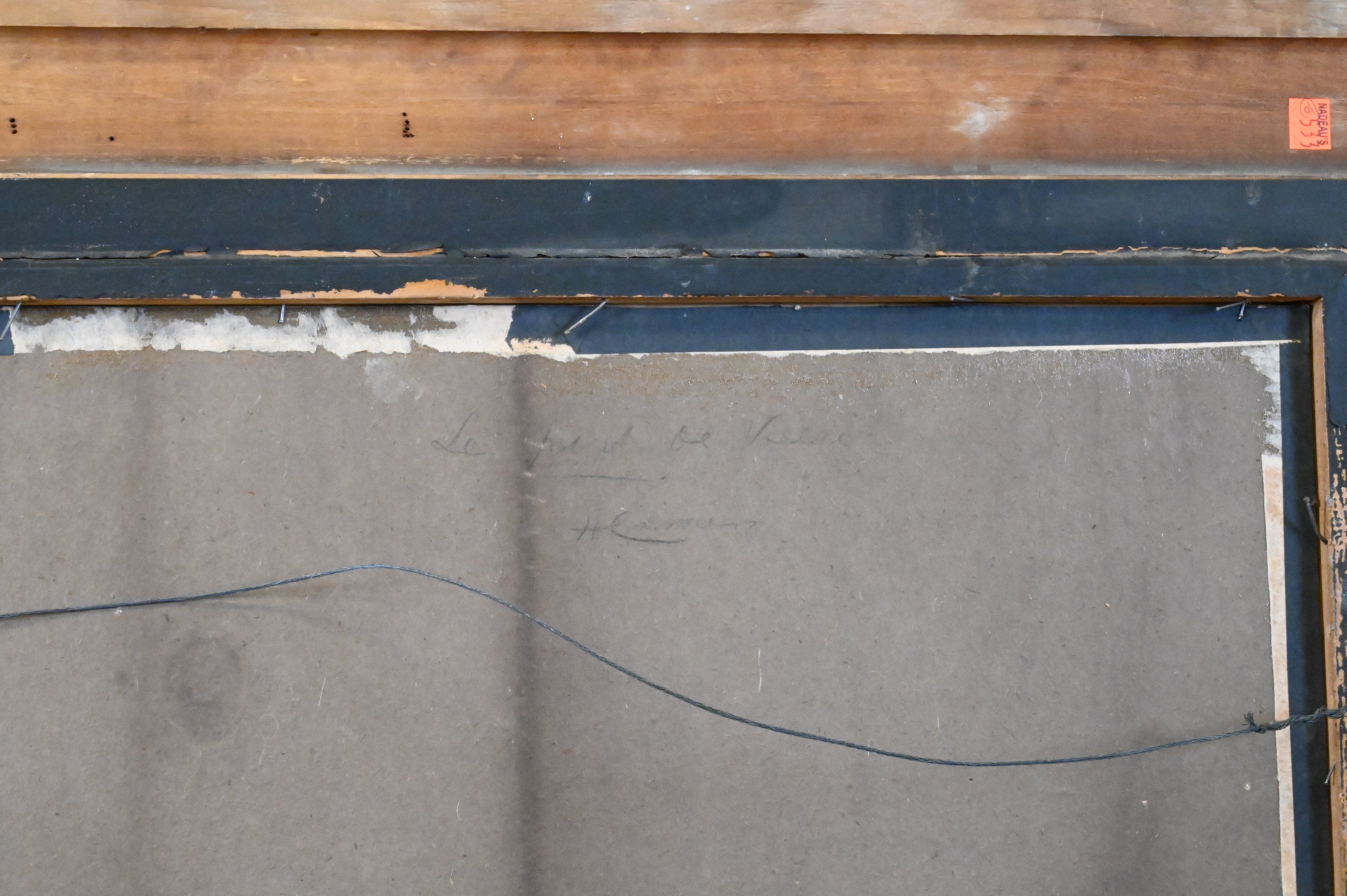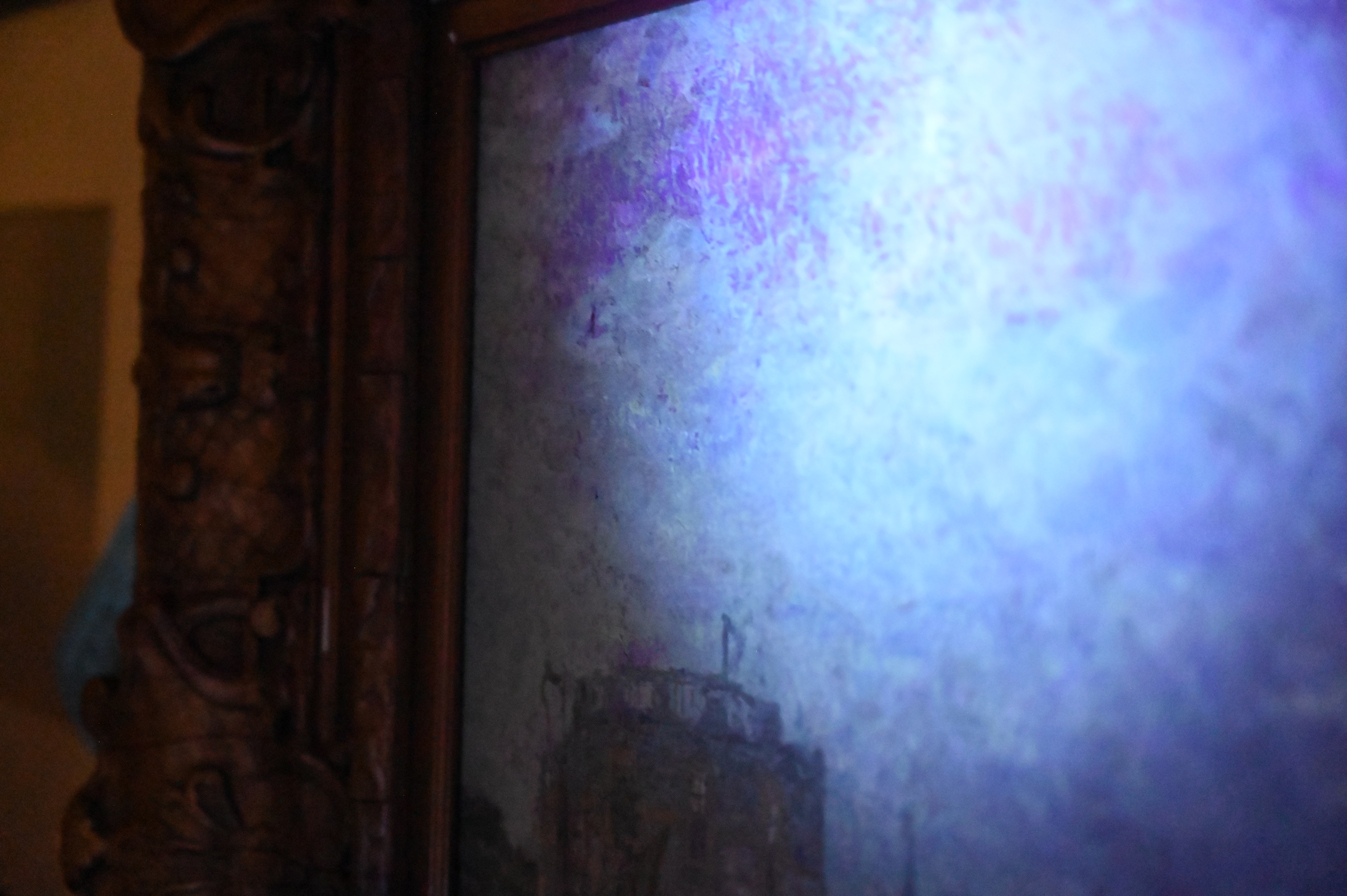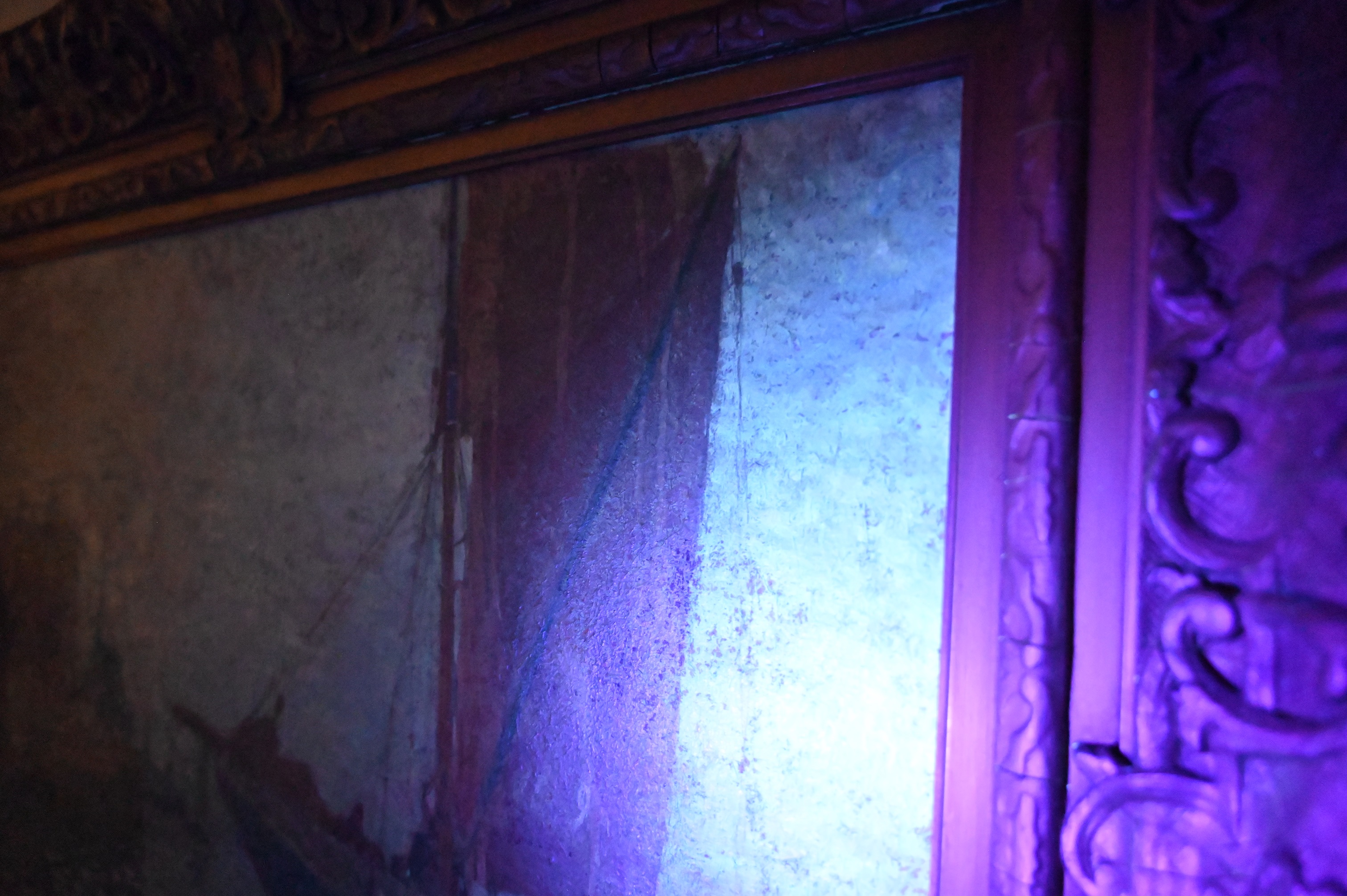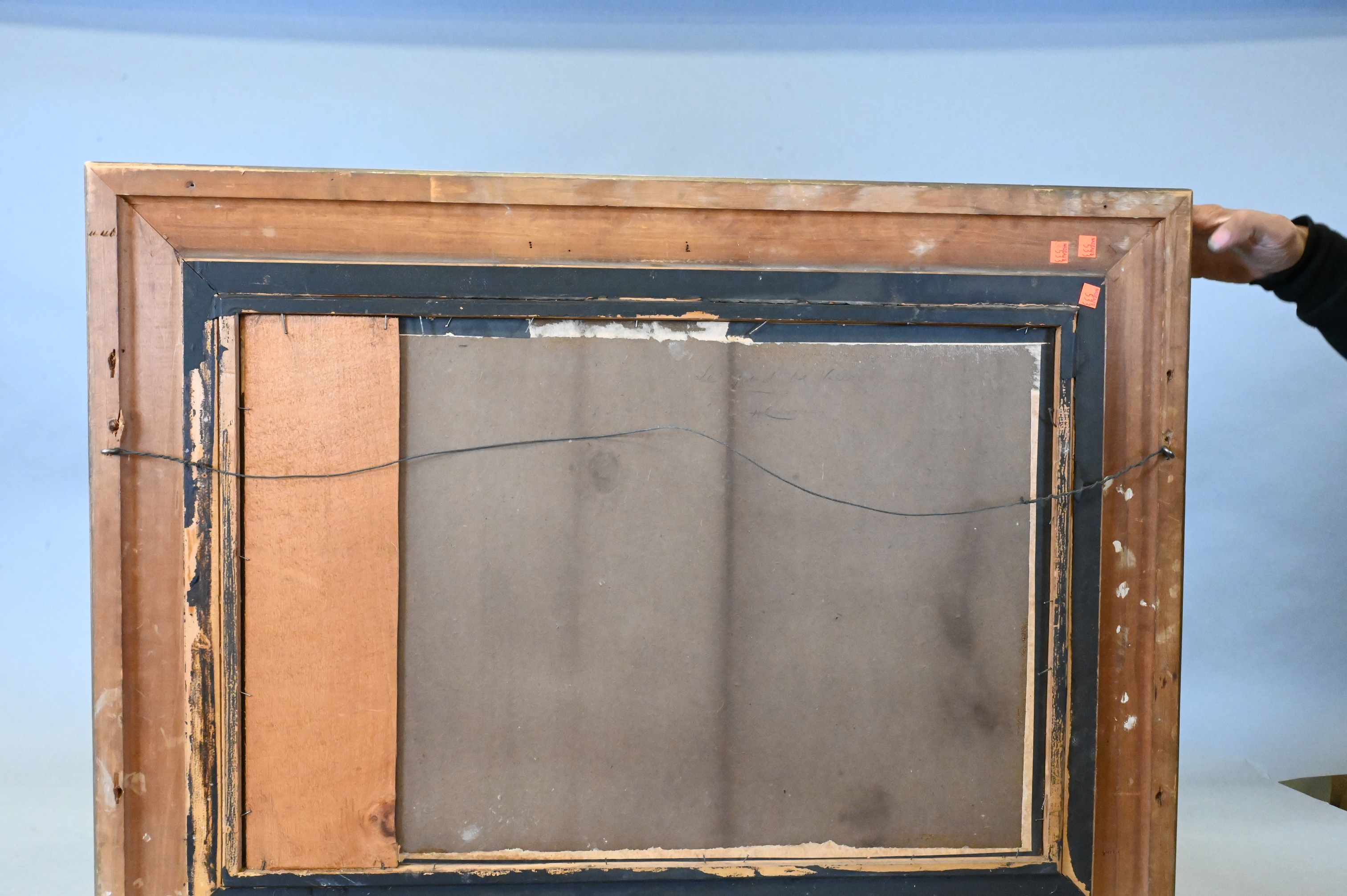 Condition: craquelure from impasto, heavy inpainting to sky, some inpainting to boat, drip marks covering boat, surface grime