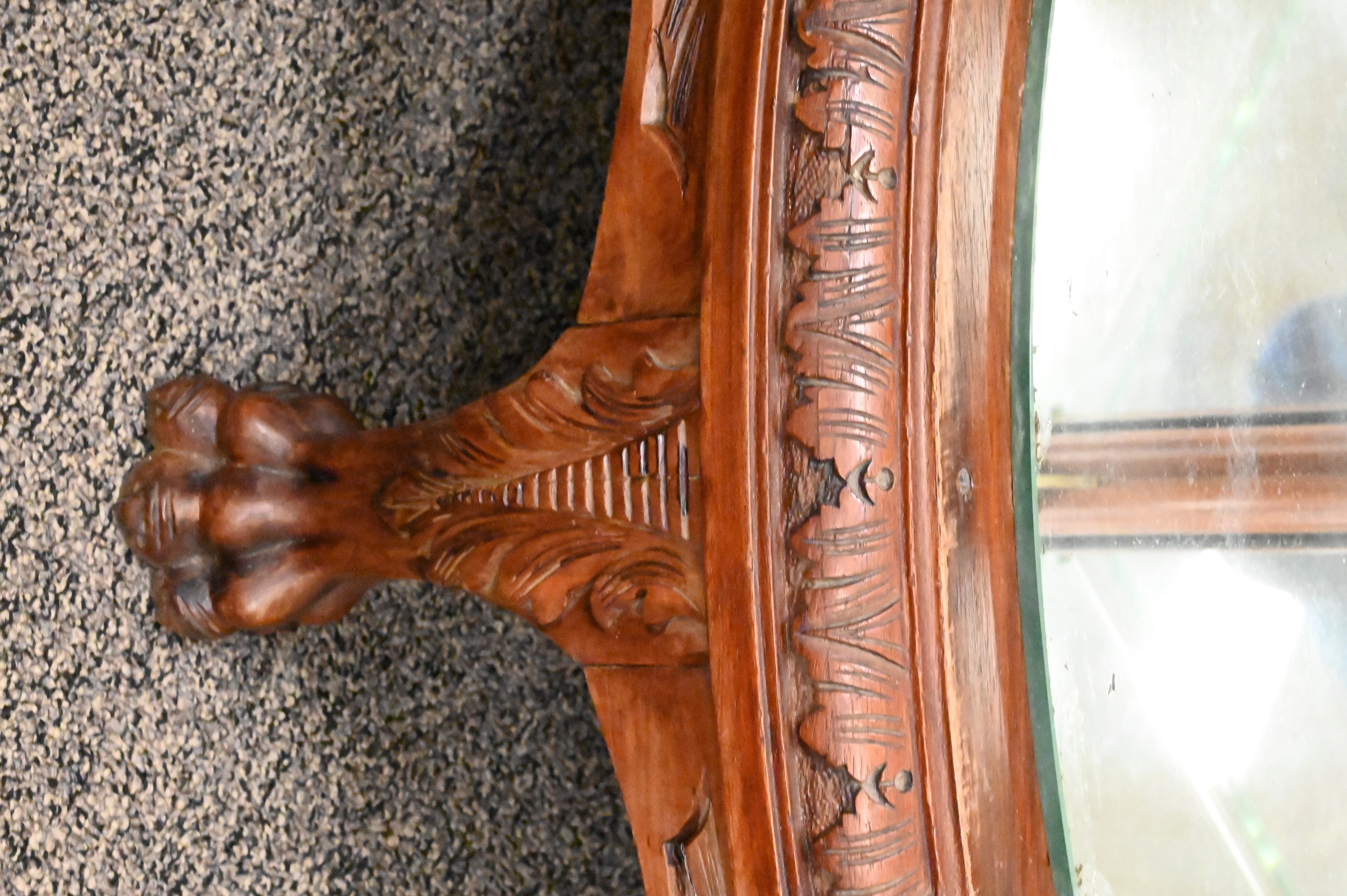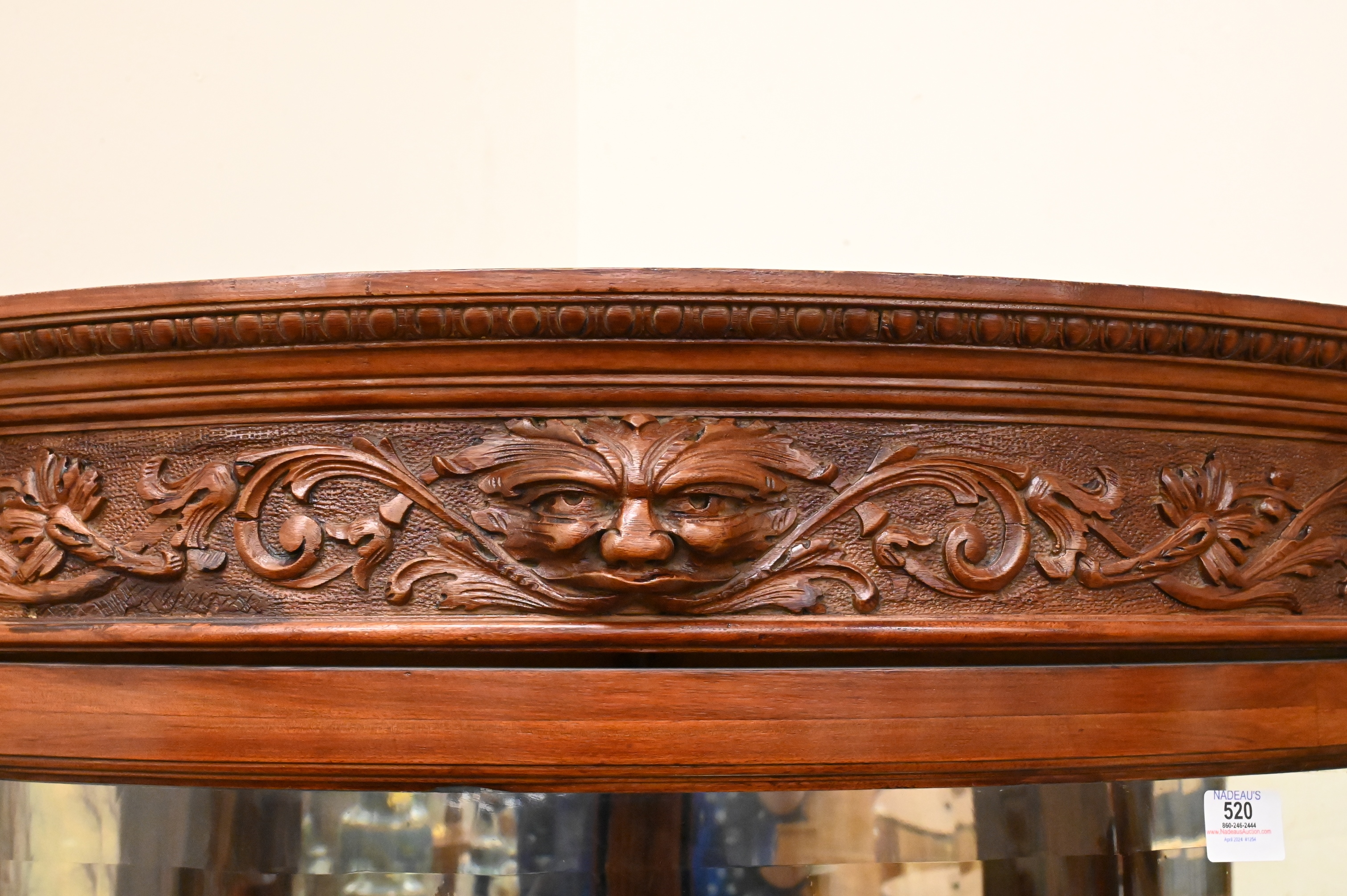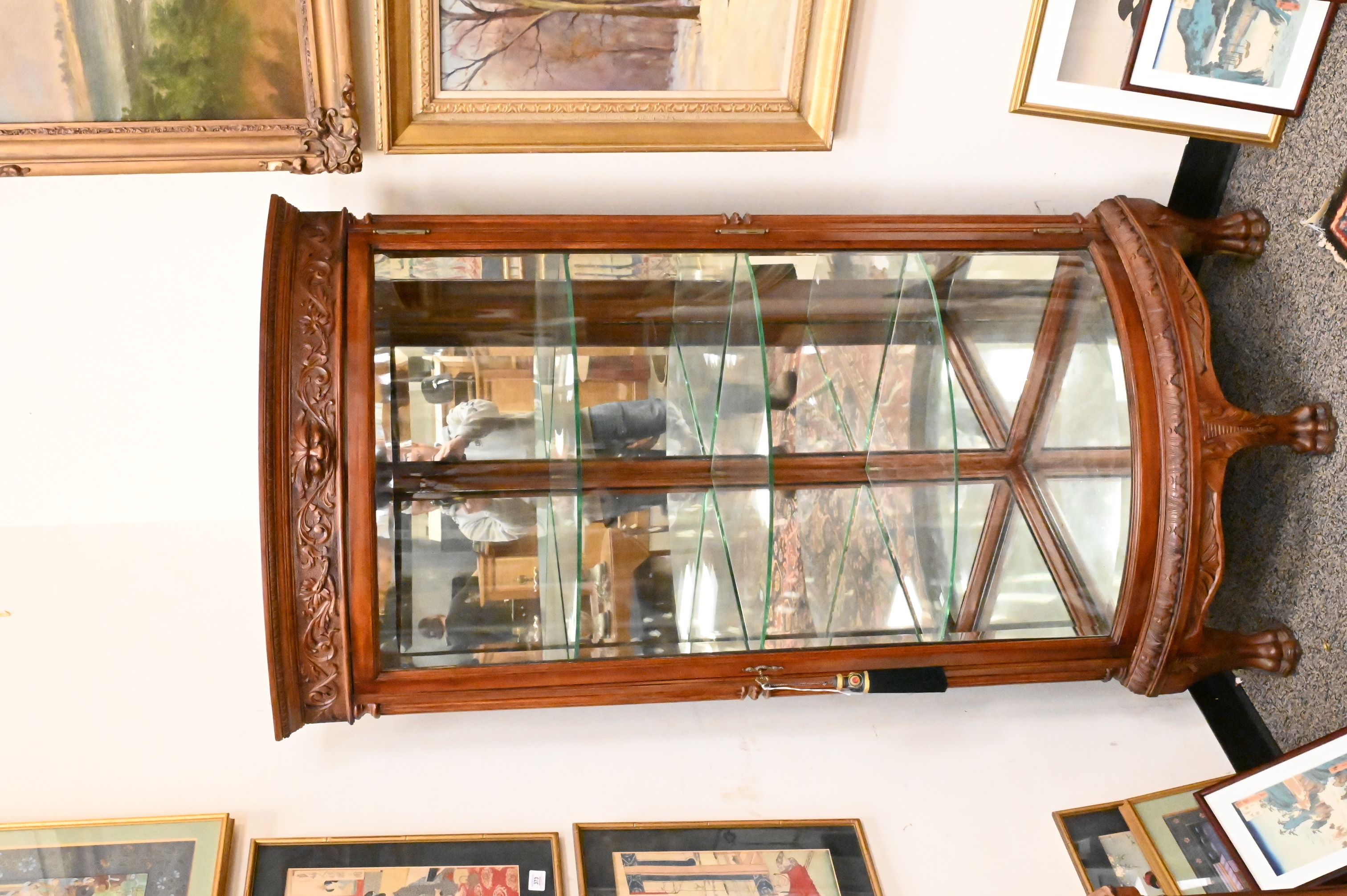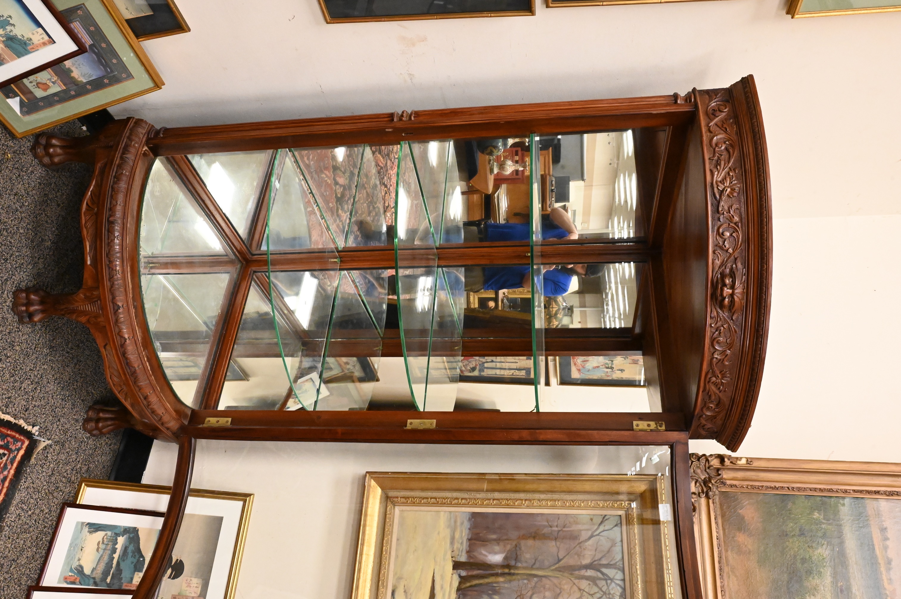 having glass curved door and mirrored back with glass shelves and carved North Wind Face all raised on claw feet