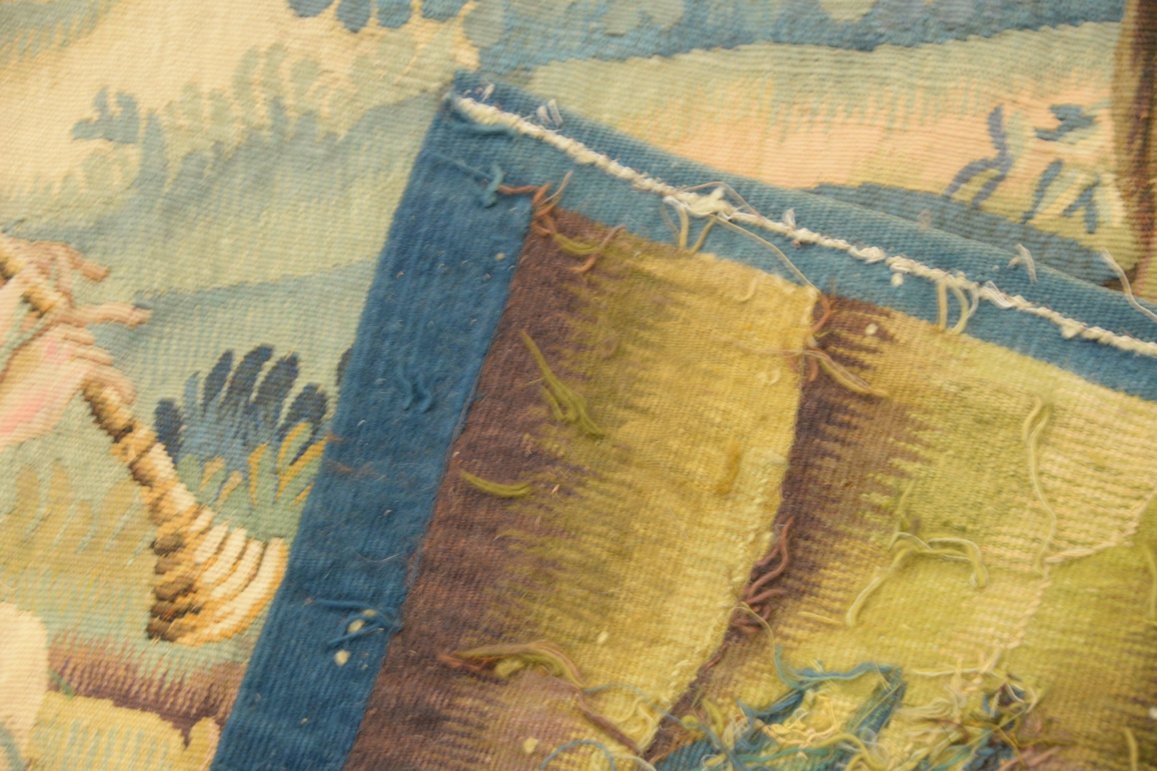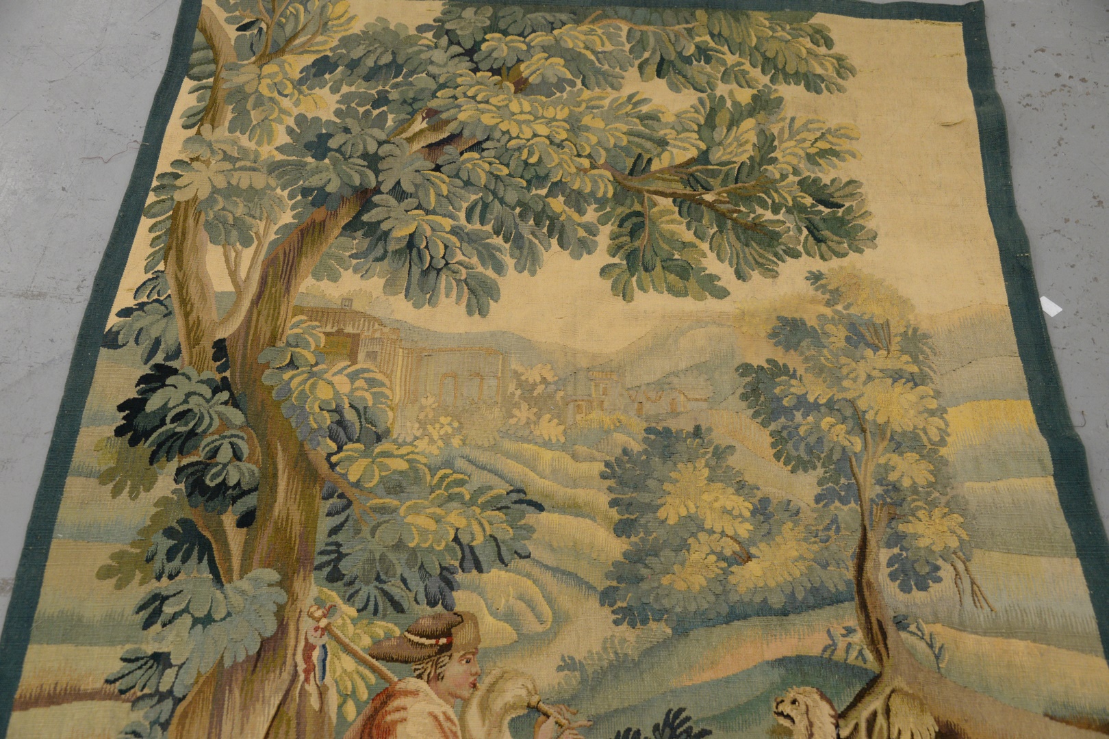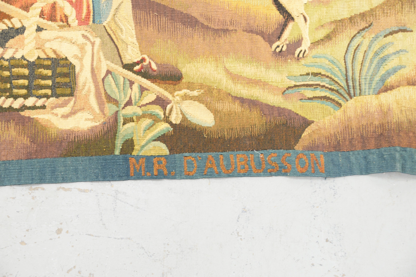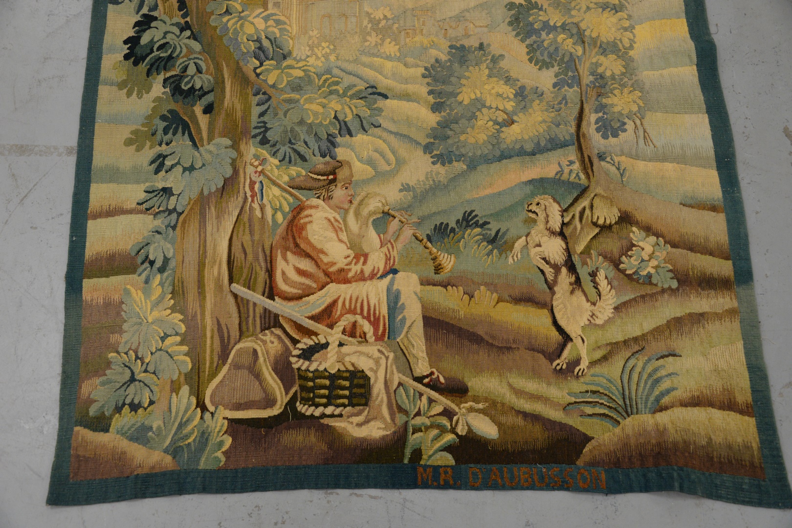 Lot 521: Aubusson Pastoral Tapestry depicting a man playing a musical instrument to a dog marked Mr. D’Aubusson along the lower edge 7′ x 4′ 9