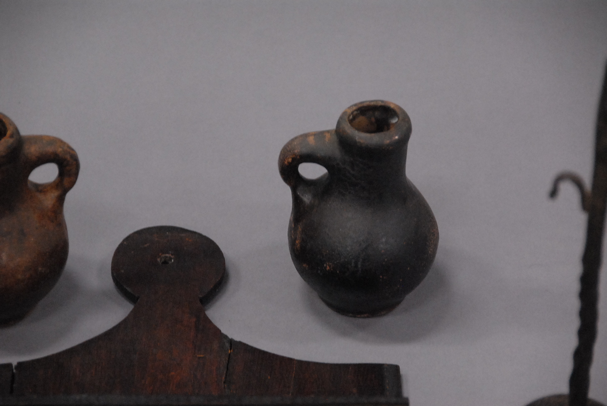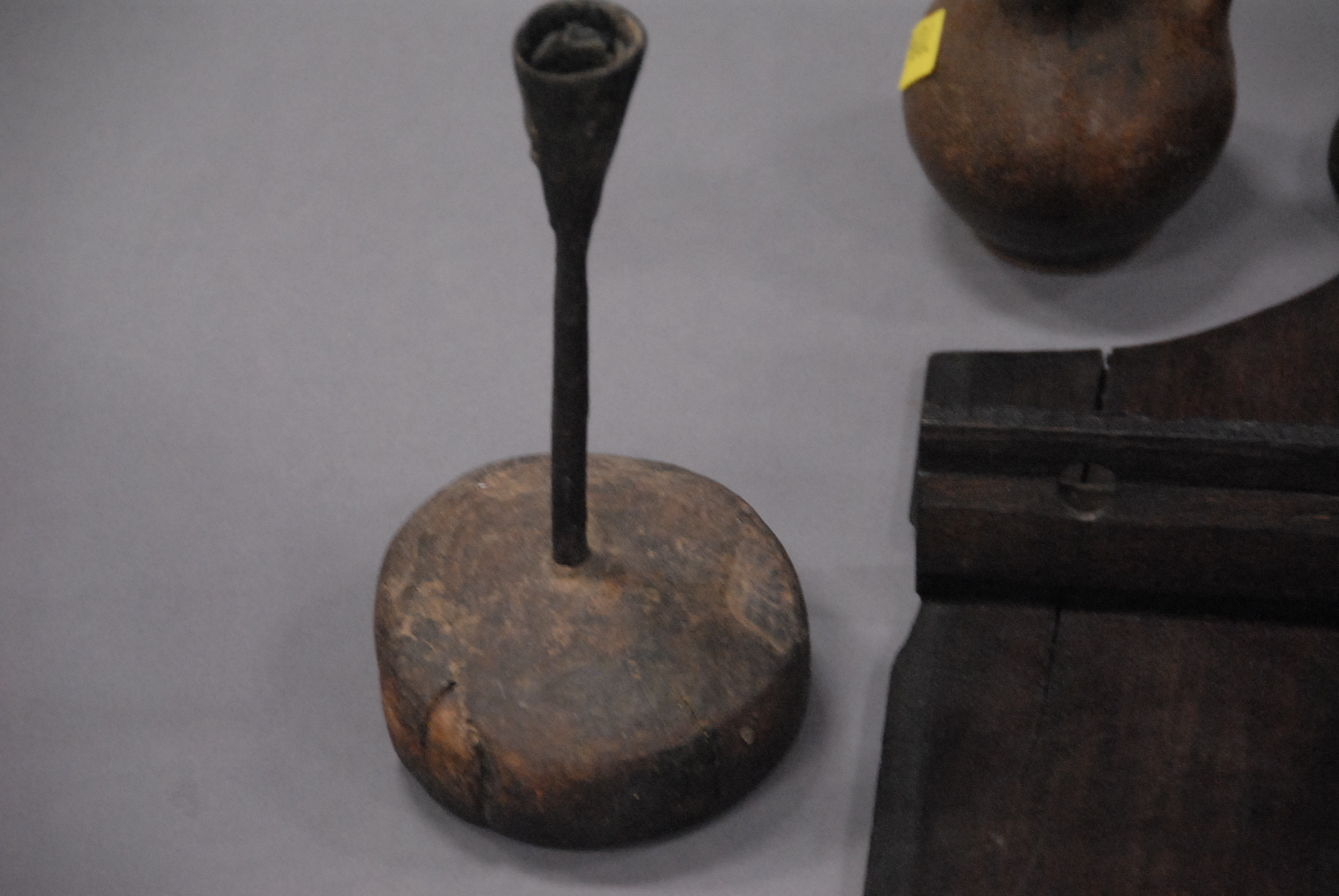 Lot 521: Five piece lot to include primitive spoon rack, two primitive iron and wood candle holders and two reproduction jugs.