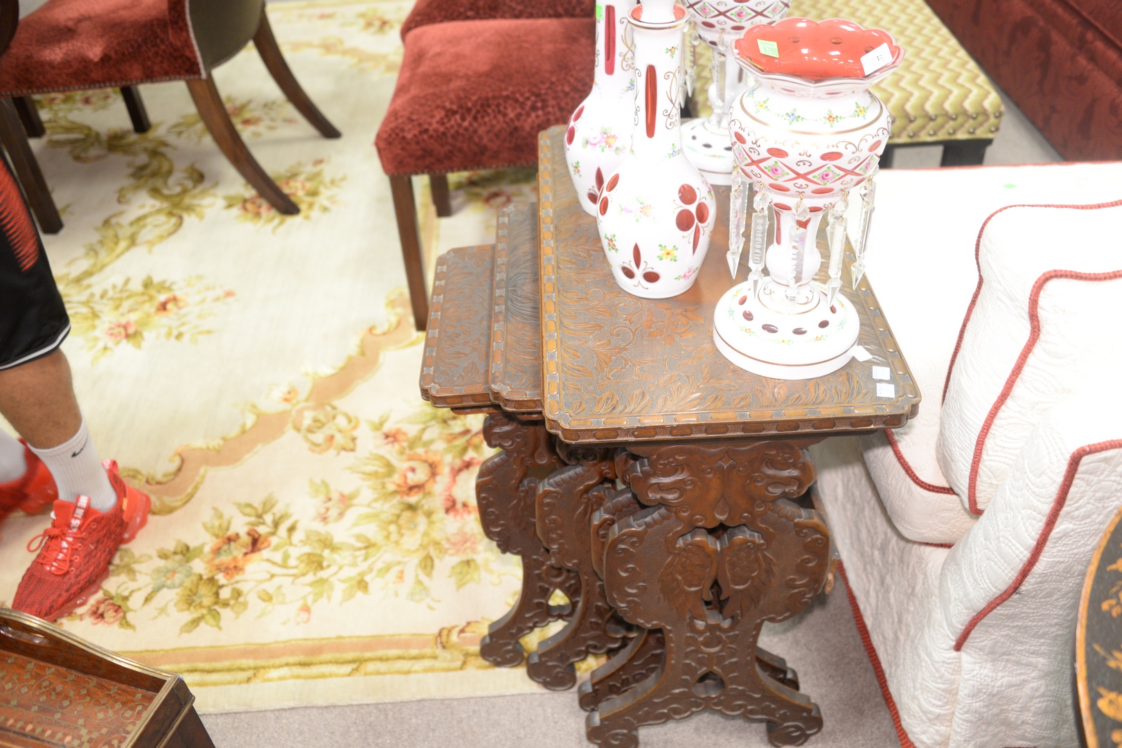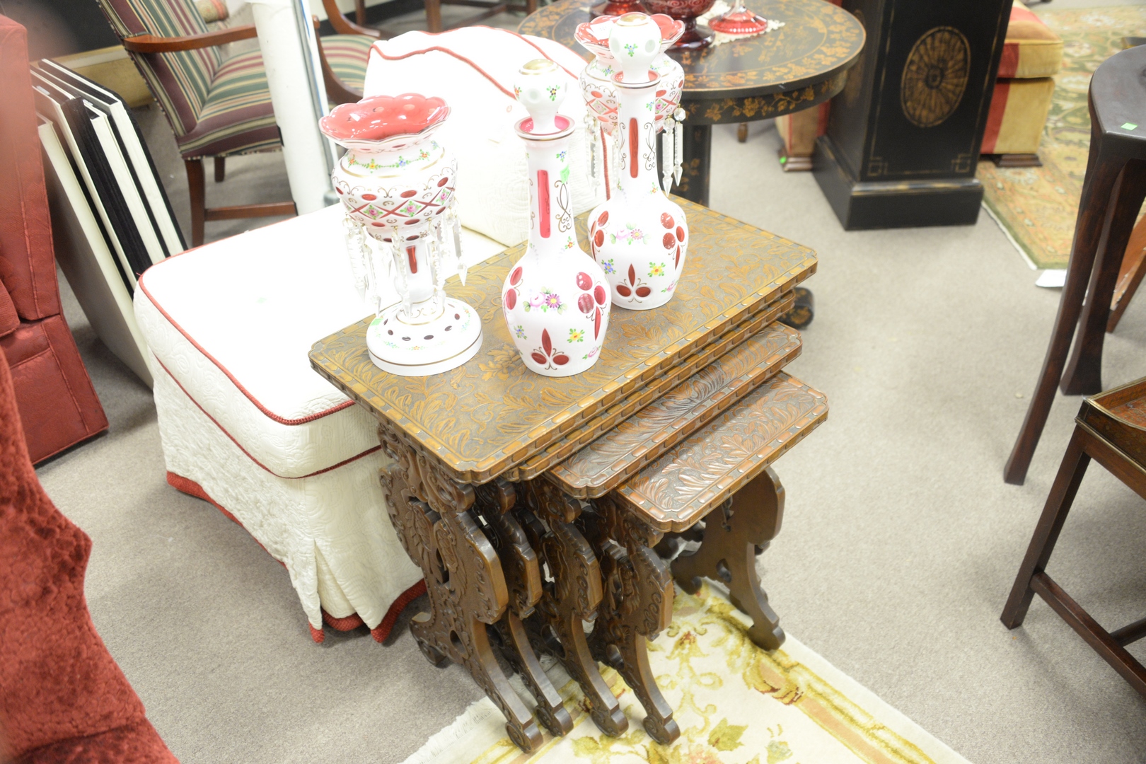 Lot 521: Five Piece Lot to include Set of Four Chinese Carved Nesting Tables, largest height 25 1/2 inches, top 14 3/4″ x 26 1/2″ along with brass and copper inlaid serving tray on stand, height 22 inches, top 14″ x 25″.