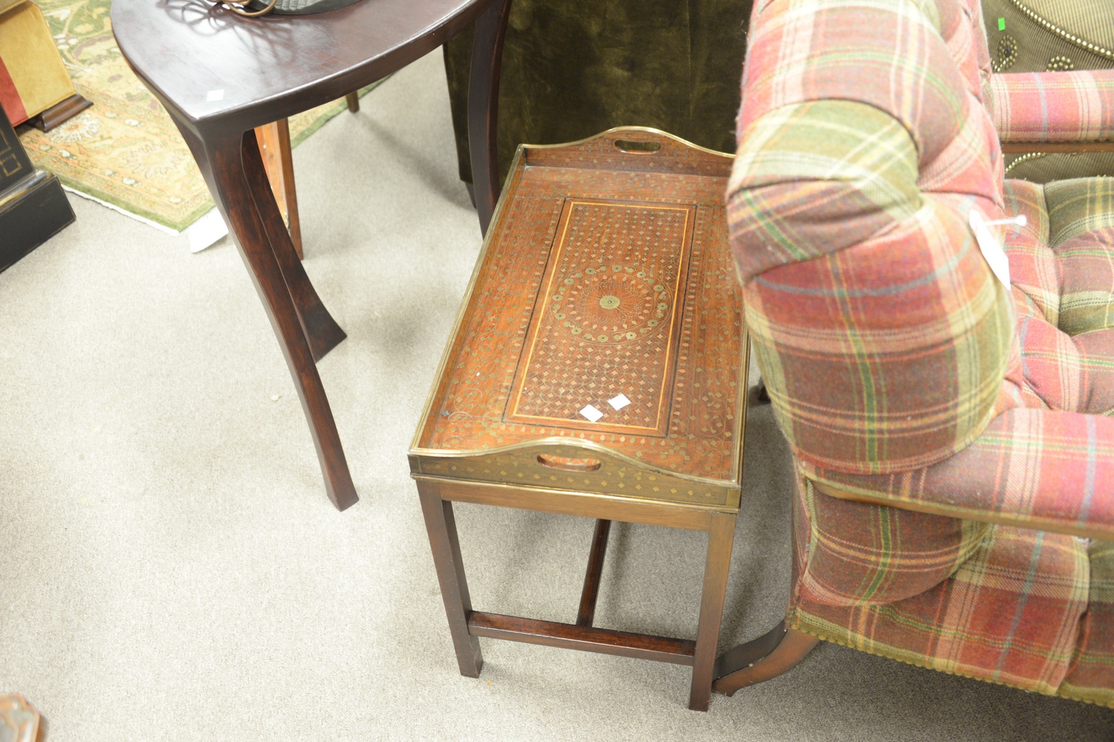 Five Piece Lot to include Set of Four Chinese Carved Nesting Tables, largest height 25 1/2 inches, top 14 3/4″ x 26 1/2″ along with brass and copper inlaid serving tray on stand, height 22 inches, top 14″ x 25″.