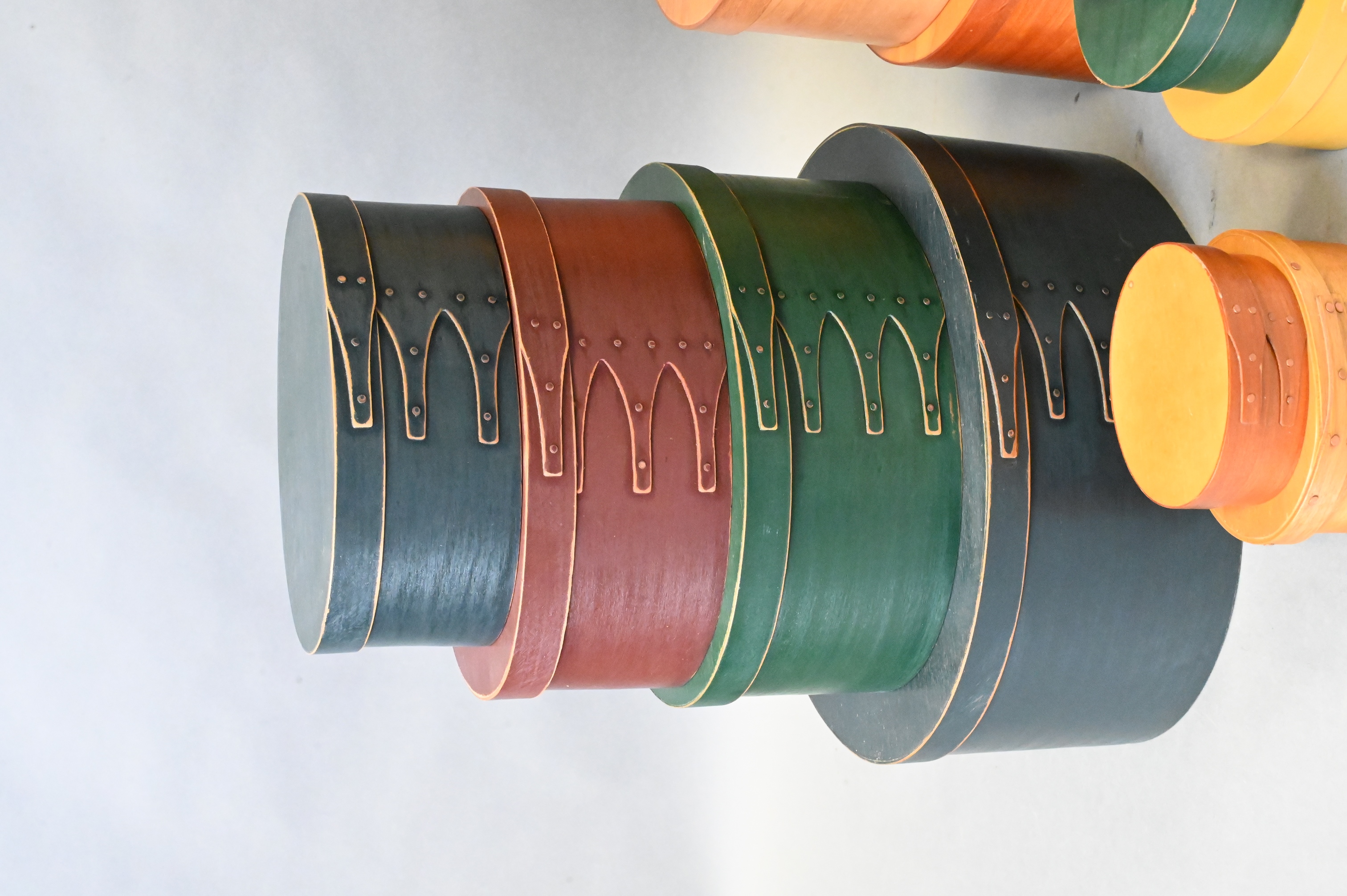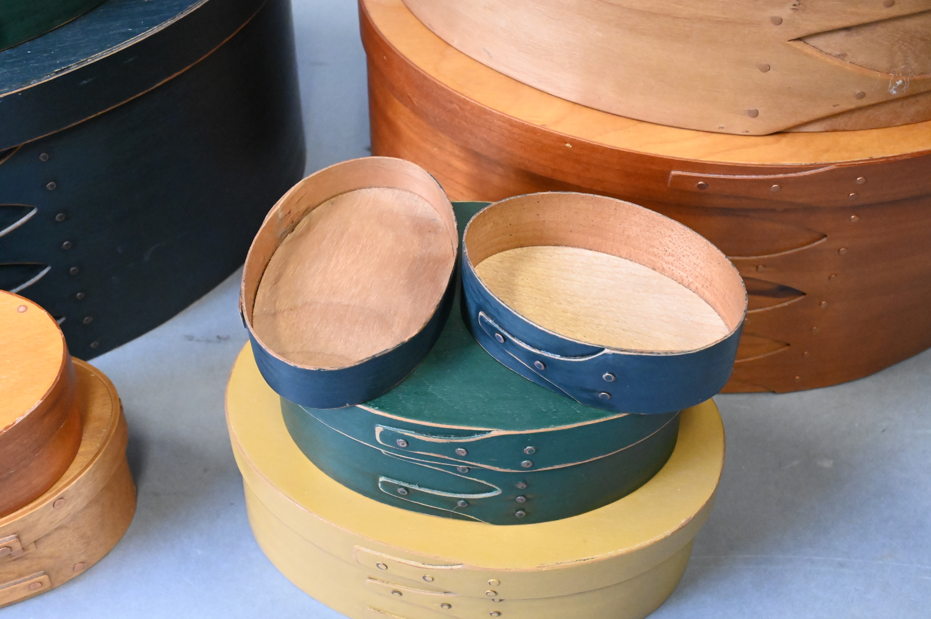 to include seven painted oval boxes, six stained wood boxes having illegible initials