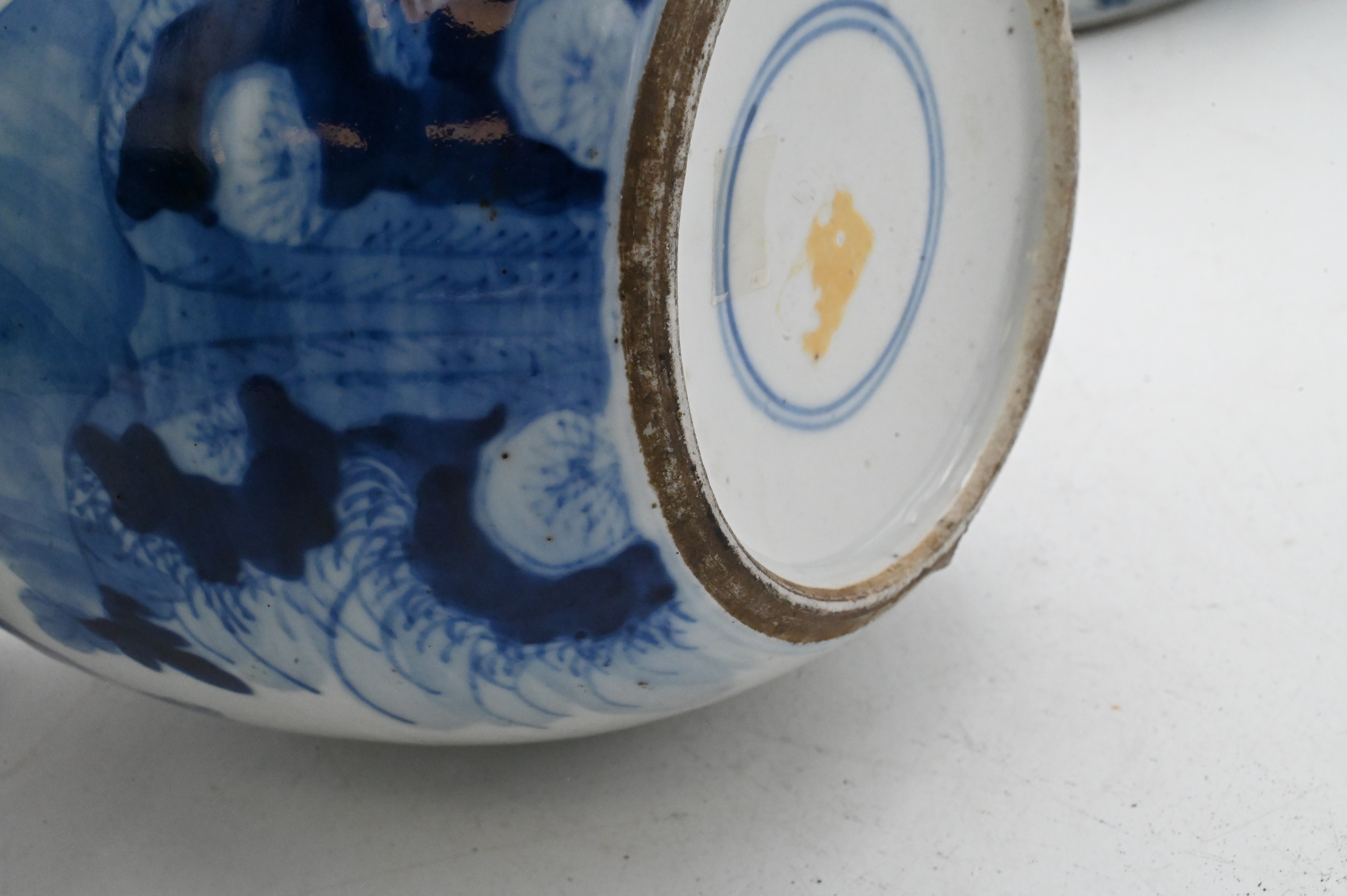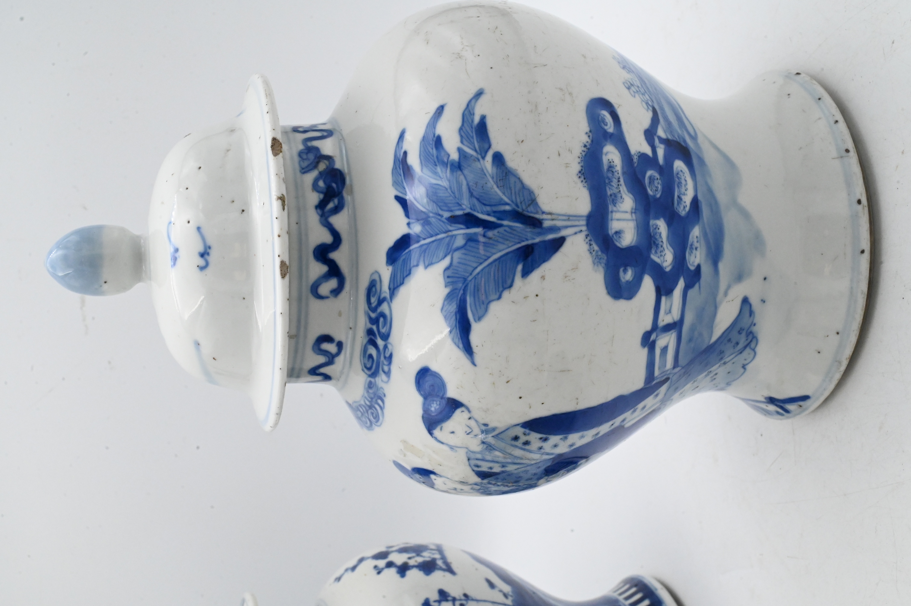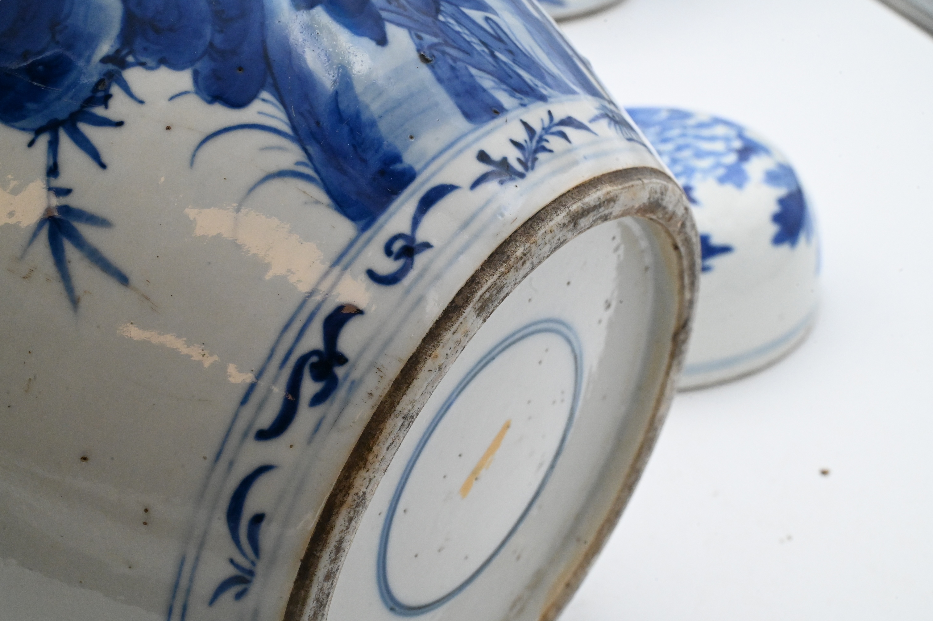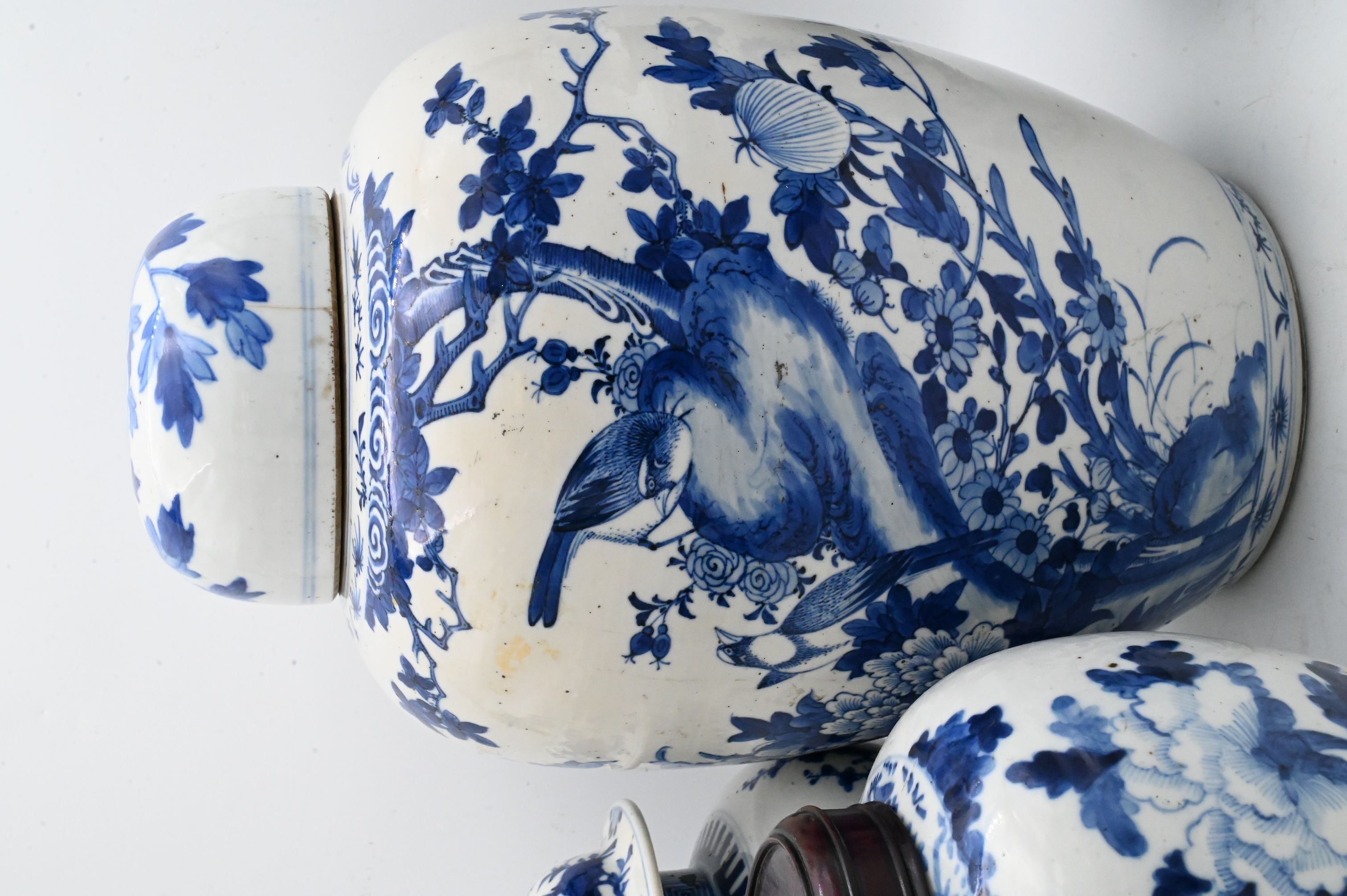 to include a large covered jar decorated with birds among flowering branches; a medium jar with wooden cover painted with floral sprays; and two smaller baluster form covered jars with figural and floral decoration. Bases with underglaze blue double-circle marks.