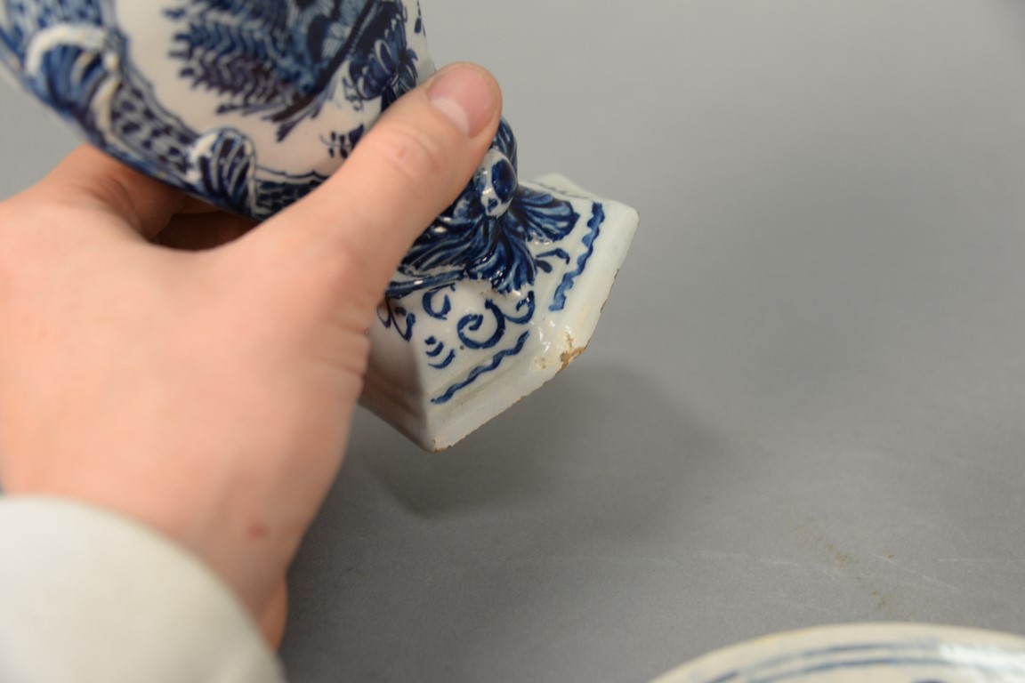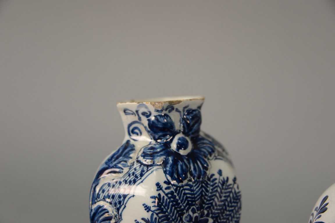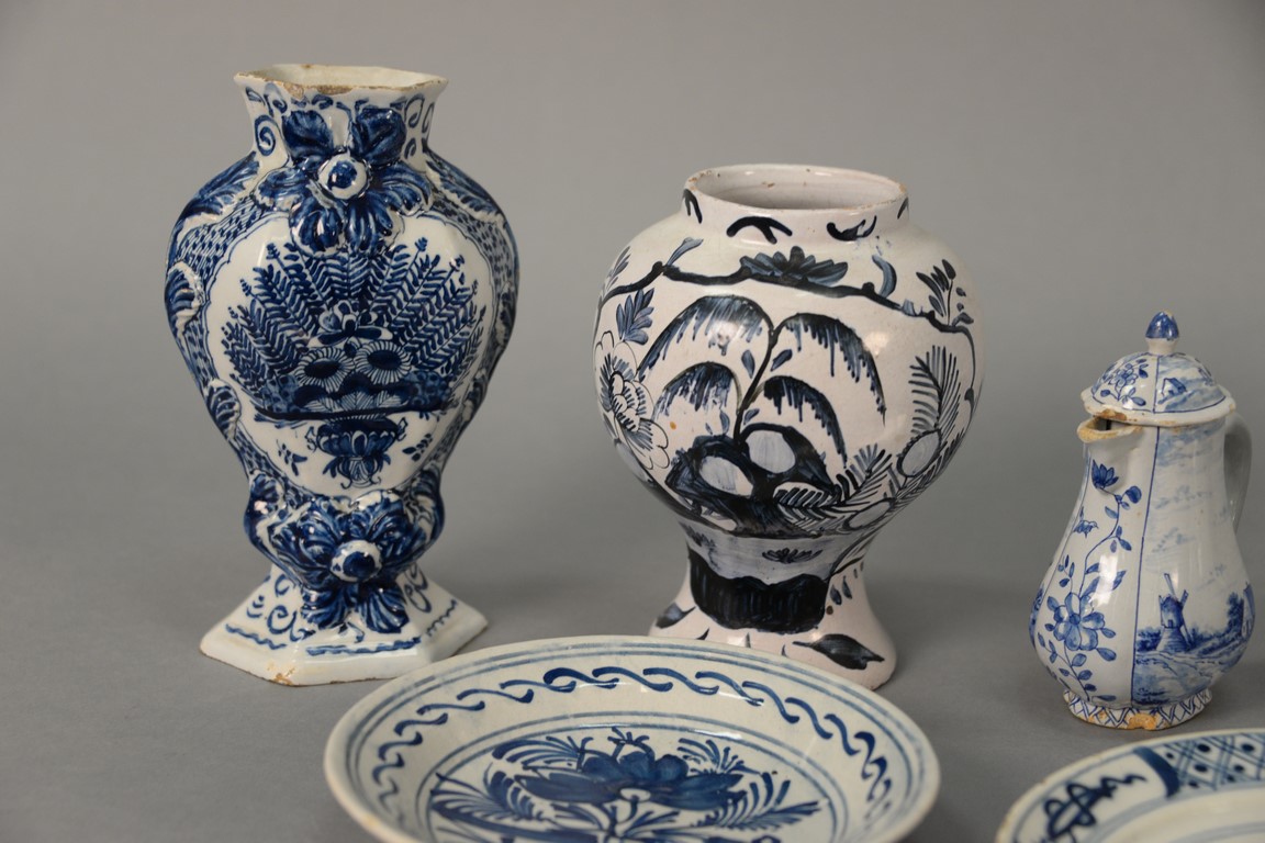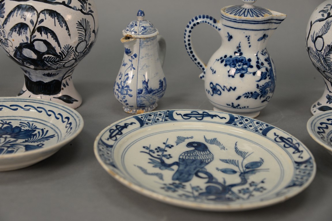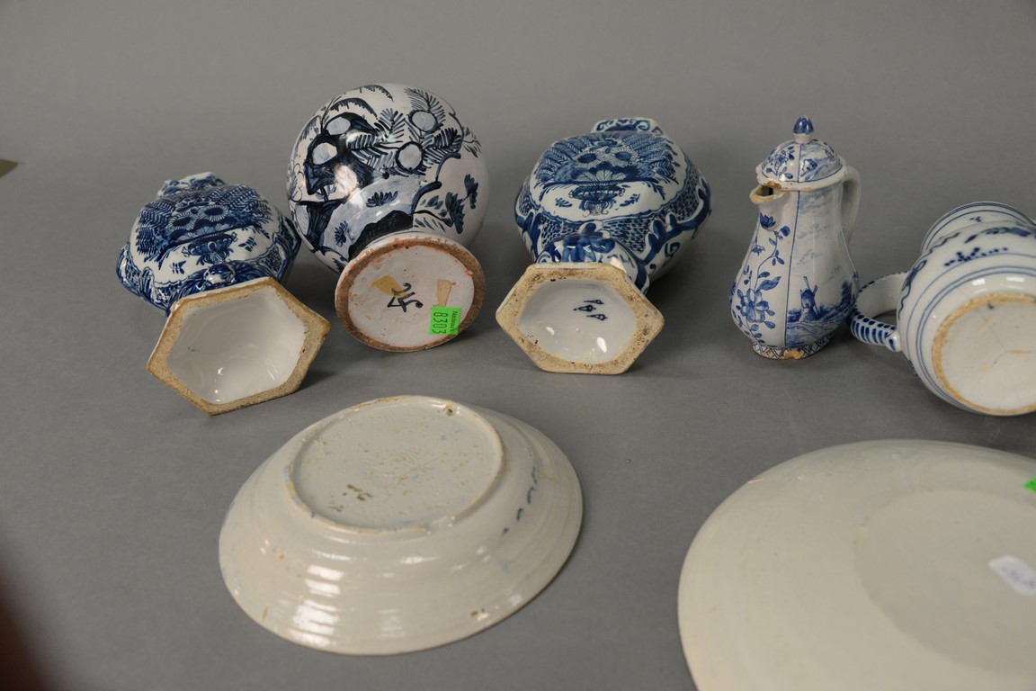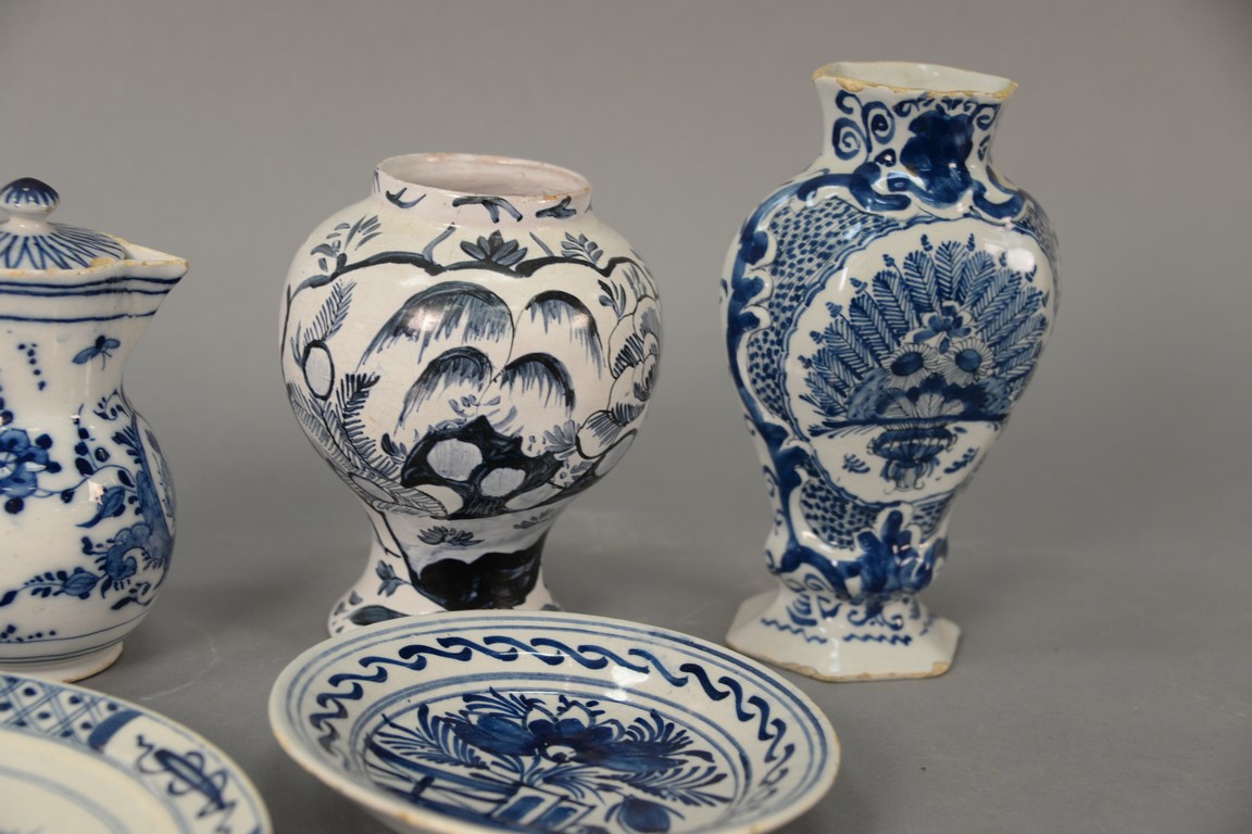 Lot 521: Group of nine Delft pieces, 18th/19th century blue and white to include two vases, two small covered creamers, two bread plates, and…