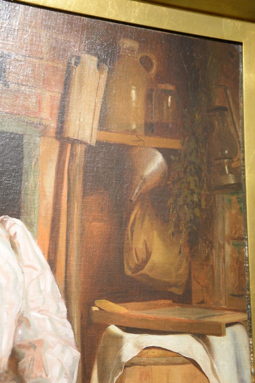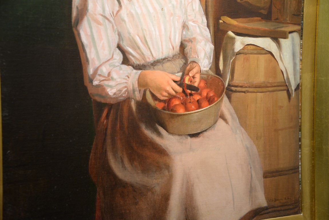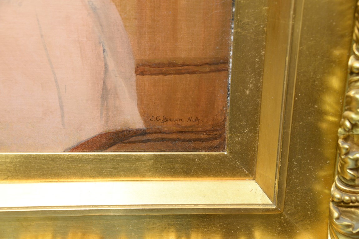 Lot 521: John George Brown 1831-1913 Distant Thoughts Young Girl Peeling Apples oil on canvas mounted on panel signed lower rig…