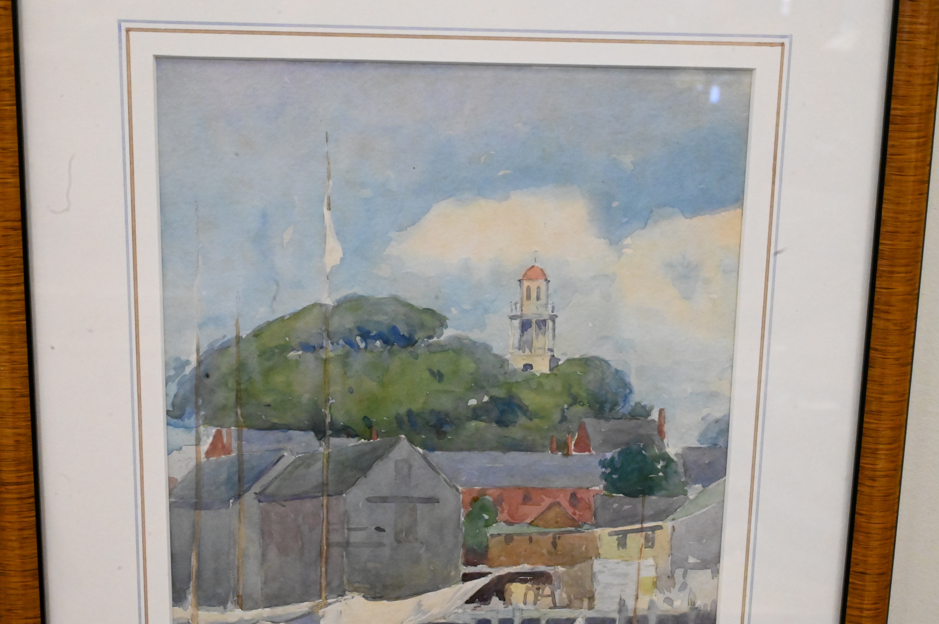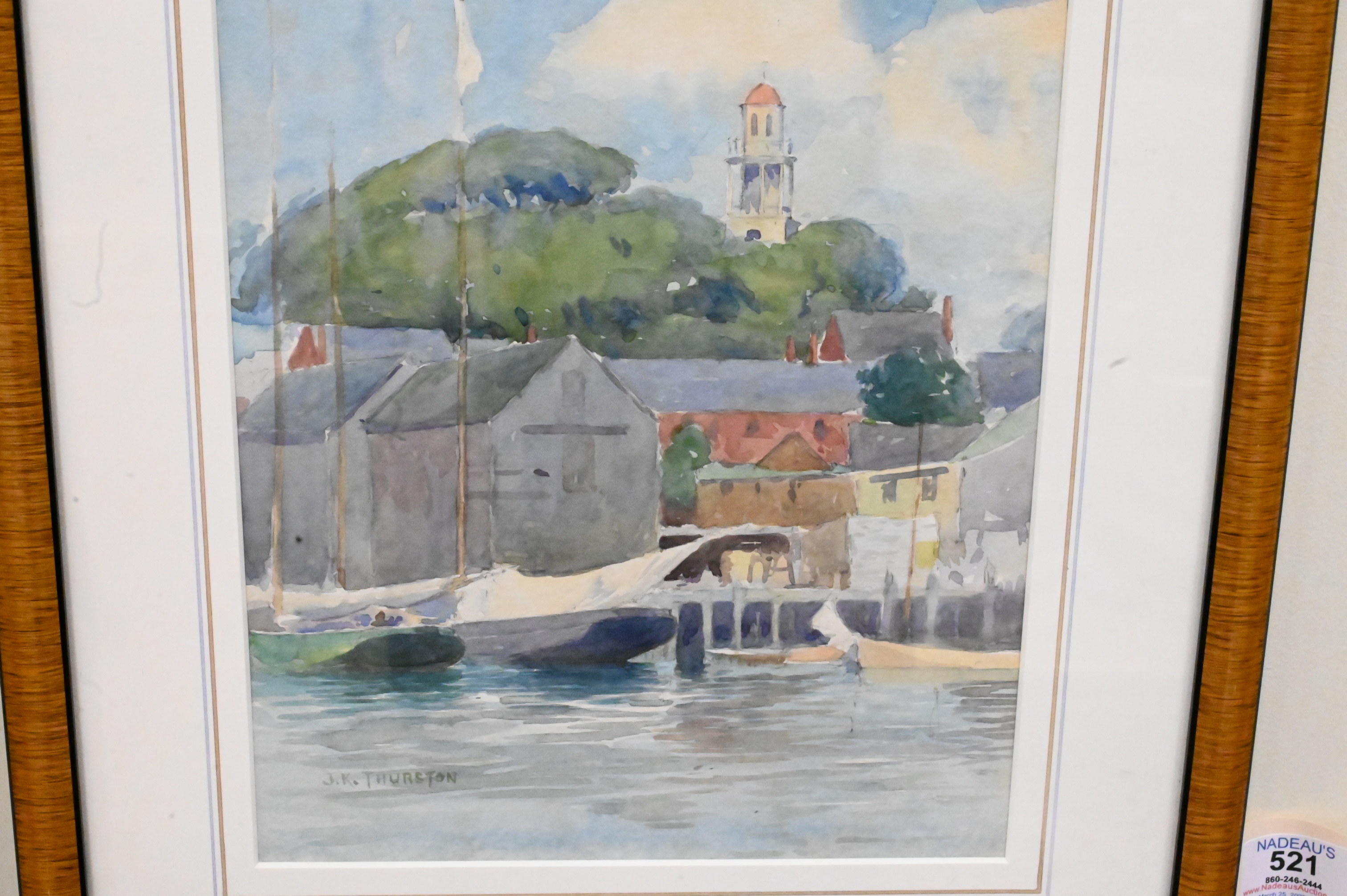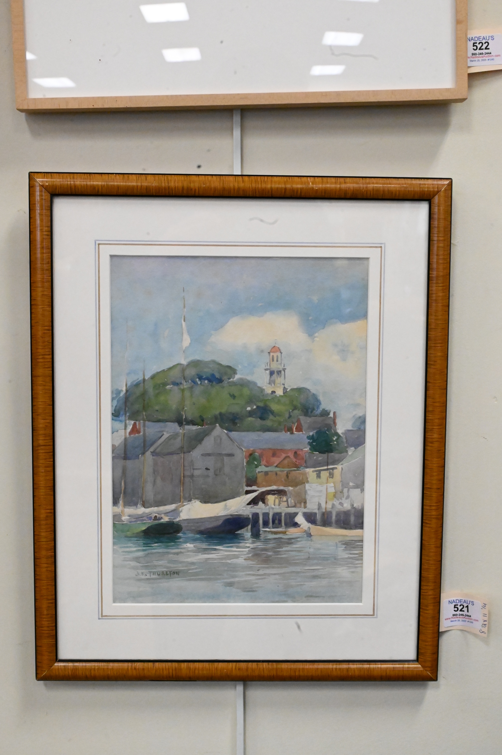 John K. Thurston (1865 – 1955), “Gloucester Harbor”, watercolor on paper, signed lower left J.K. Thurston, 11 1/4″ x 8 1/2″. Provenance: Marianne Clark Fine Antiques, Southwest Harbor Maine.